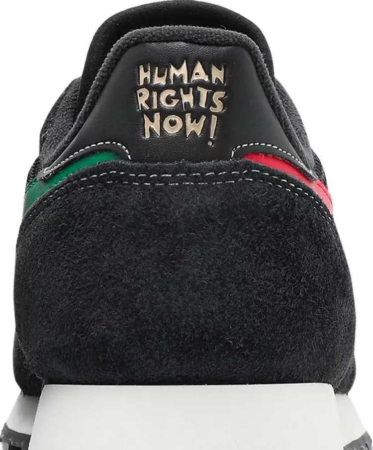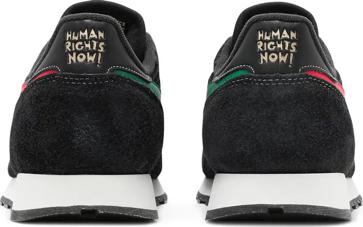 Reebok Classic Leather 'Human Rights Now! - Black Red' черпает вдохновение из одноименного мирового турне 1988 года, состоящего из серии из 20 благотворительных концертов, представленных Amnesty International и направленных на повышение осведомленности о зверствах в области прав человека во всем мире. Эта пара заимствована у туристических товаров и имеет черный сетчатый верх, замшевые накладки в тон и несоответствующие кожаные боковые полосы, выполненные в красном цвете Vector на боковой стороне и зеленом на средней стороне. На кожаном язычке на пятке выбито: «Права человека сейчас!», а тканый язычок украшает логотип тура. Кроссовки имеют белую промежуточную подошву из ЭВА и дымчатую полупрозрачную резиновую подошву.