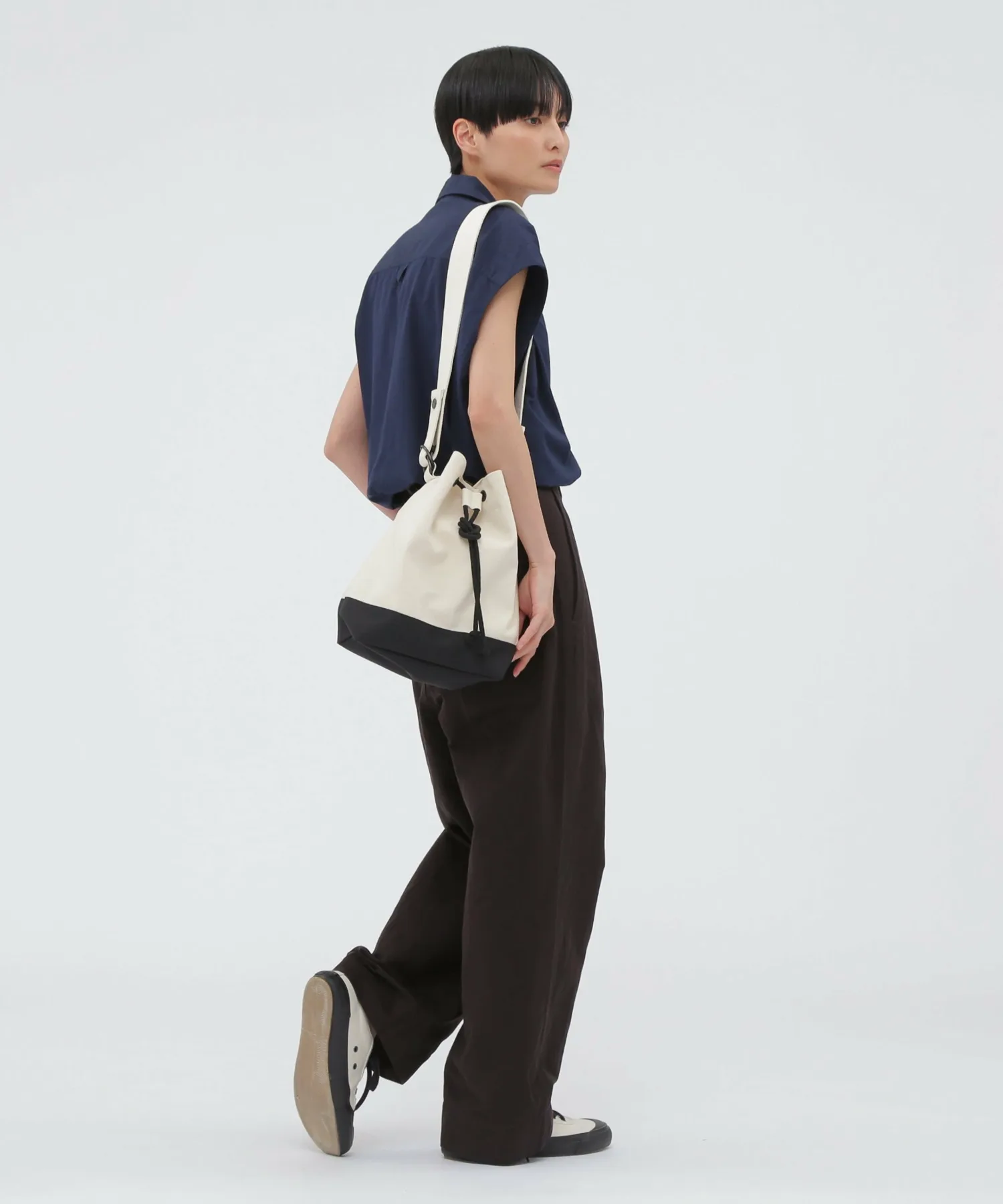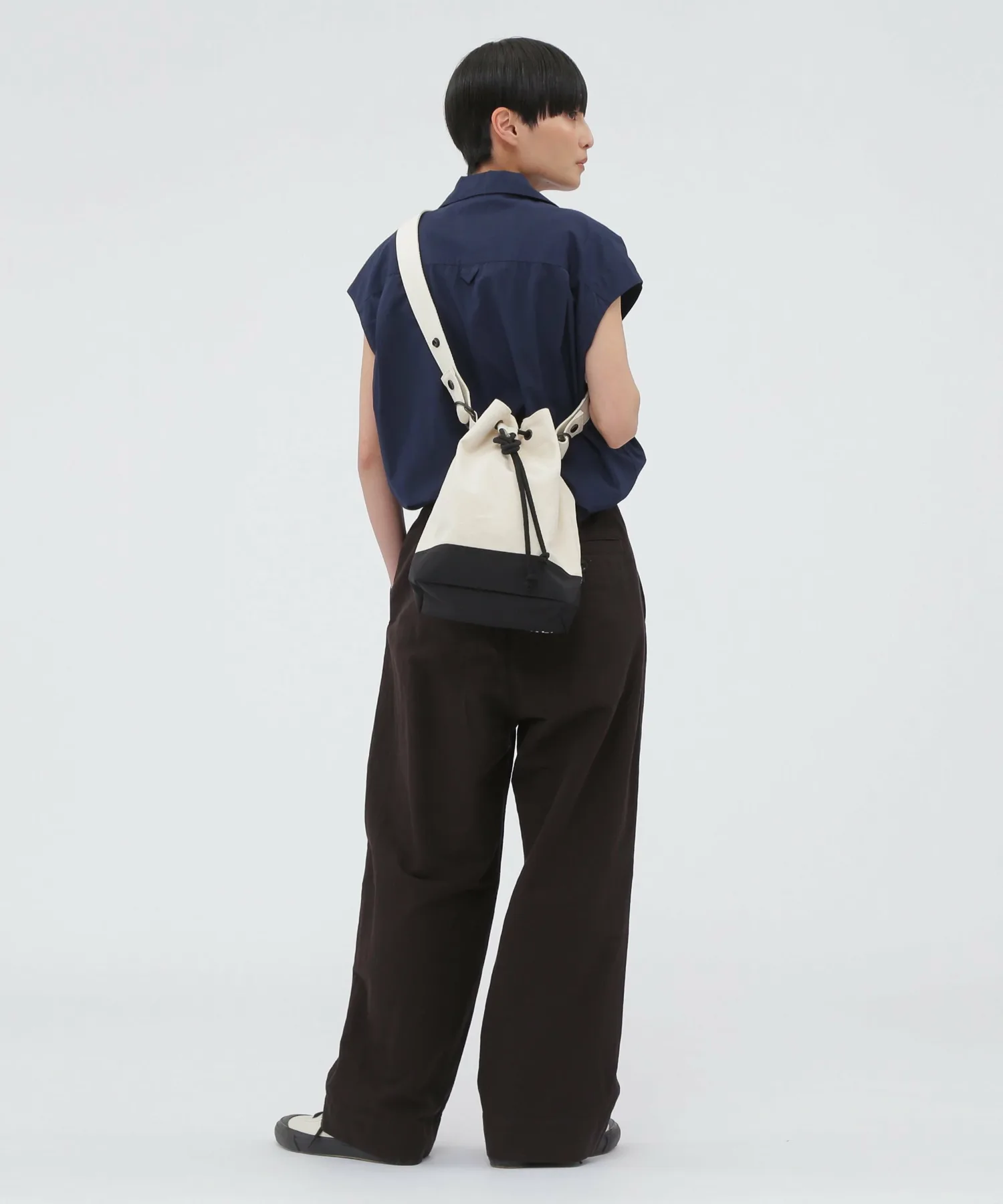 Дизайн ориентирован на минимальные детали, сохраняя при этом функциональность, например, застежка на пуговицу в горошек и внутренний карман с разделителем. Логотип бренда, напечатанный на дне боковой складки, напоминает винтажную холщовую сумку. Очень универсальный предмет, который могут использовать как мужчины, так и женщины.