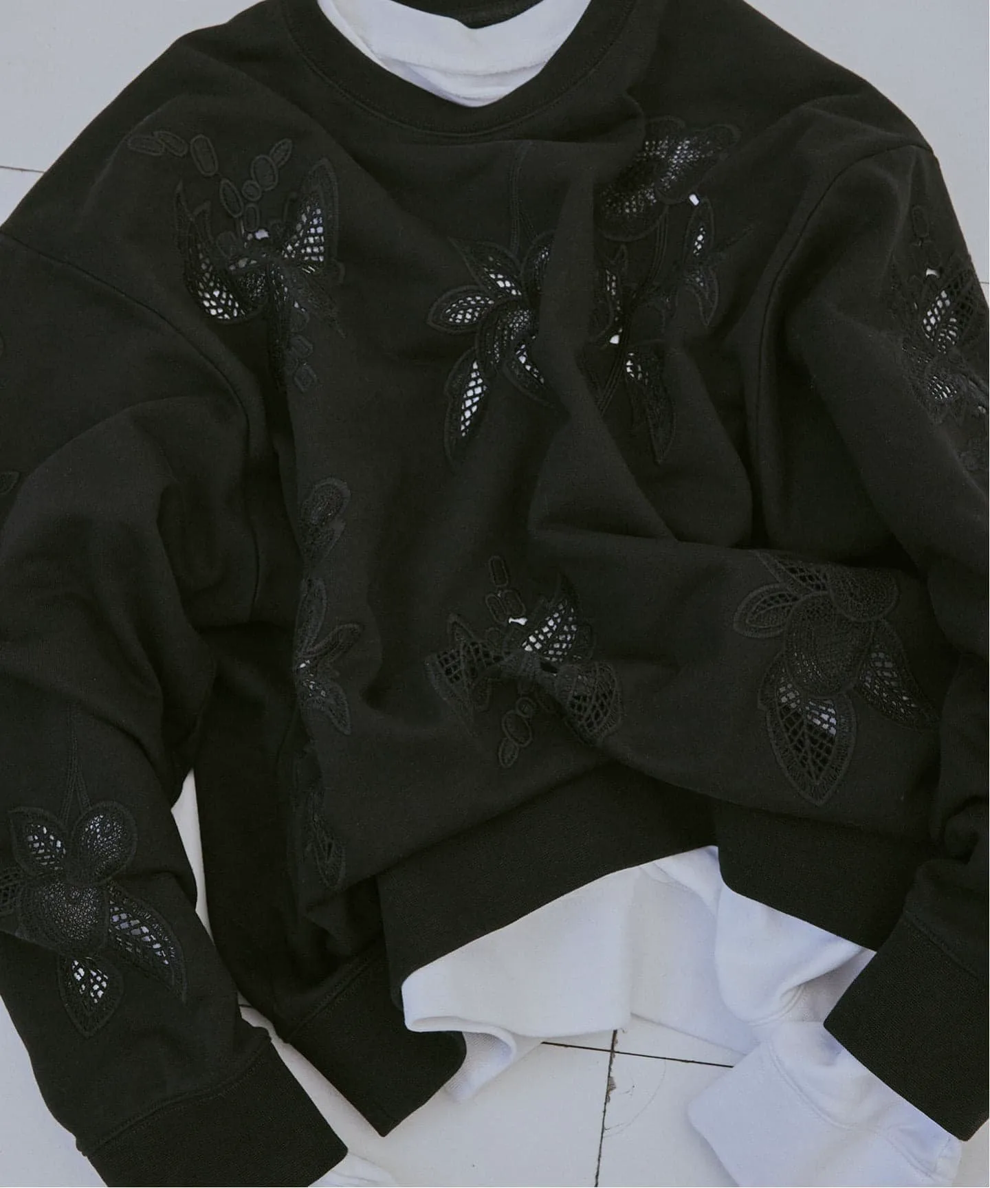Пуловер с рисунком дизайнера TOLIGHT Аоямы, выполненным в технике химического кружева и вшитым в толстовку.