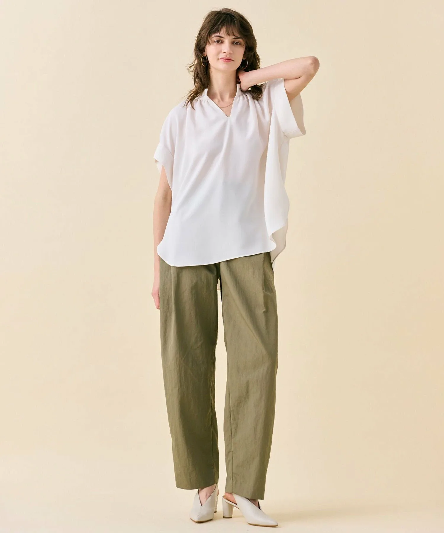 Эта мягкая блузка с короткими рукавами имеет присборенные рукава и вырез горловины. Свободный крой, разрез на шее и рукава-летучая мышь создают изысканный, расслабленный образ. Ее можно носить заправленной или навыпуск, а сбалансированный силуэт является результатом внимания к деталям, включая манжеты, похожие на манжеты, и глубокий закругленный подол с глубоким разрезом. Доступна в трех цветах: кремовый, синий и черный. Ее можно носить как отдельно, так и в сочетании с брюками из того же материала для создания гармоничного образа, от повседневной носки до работы и офиса. Эта универсальная вещь подходит для любого случая.