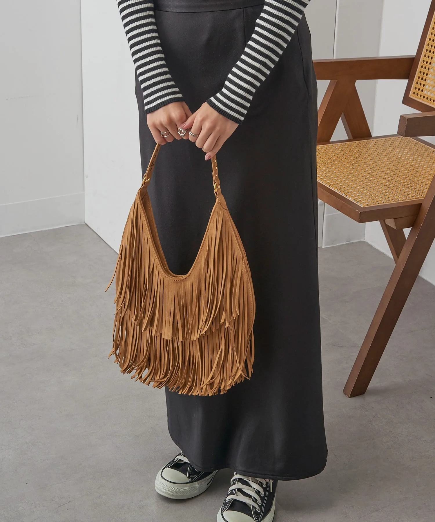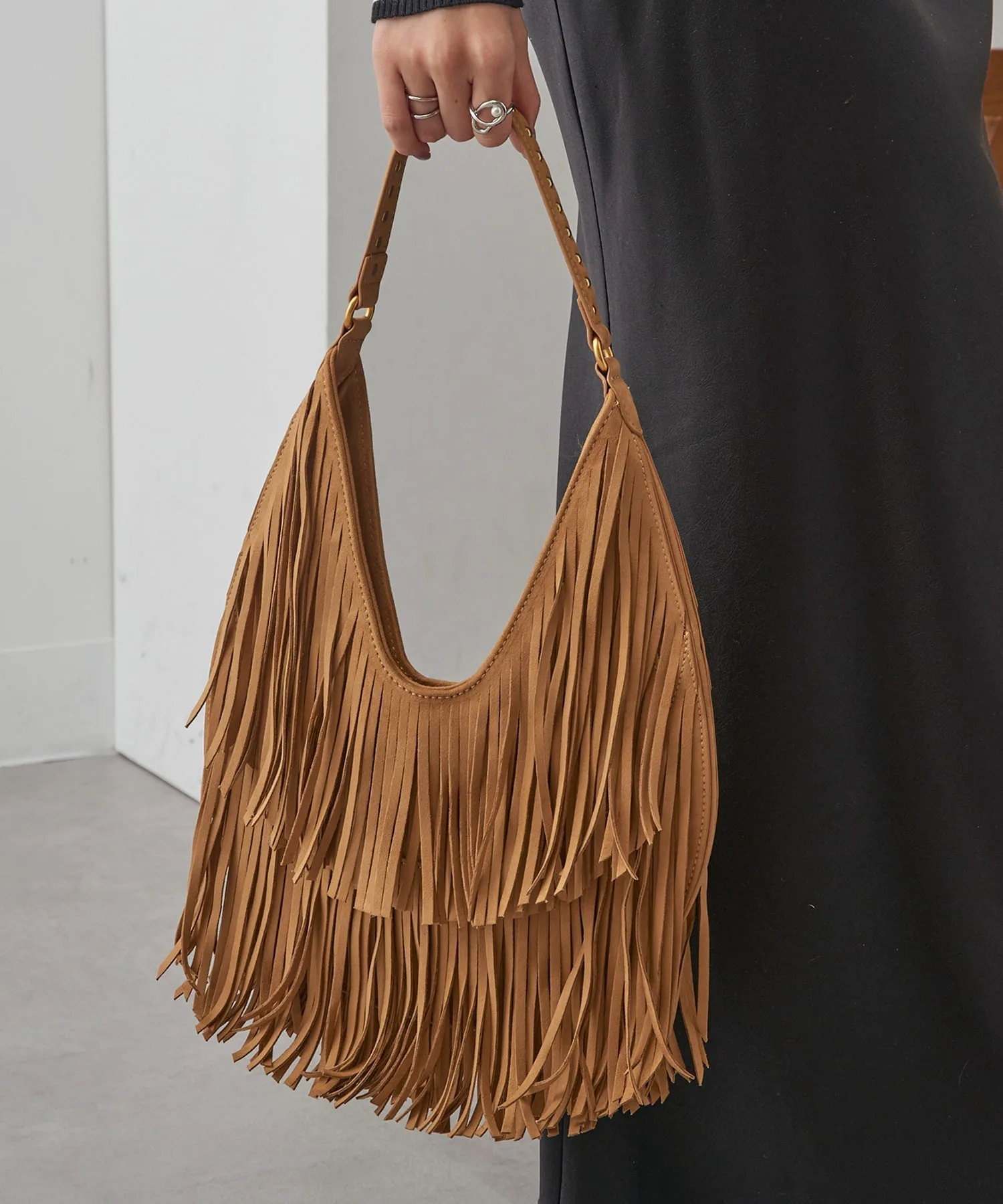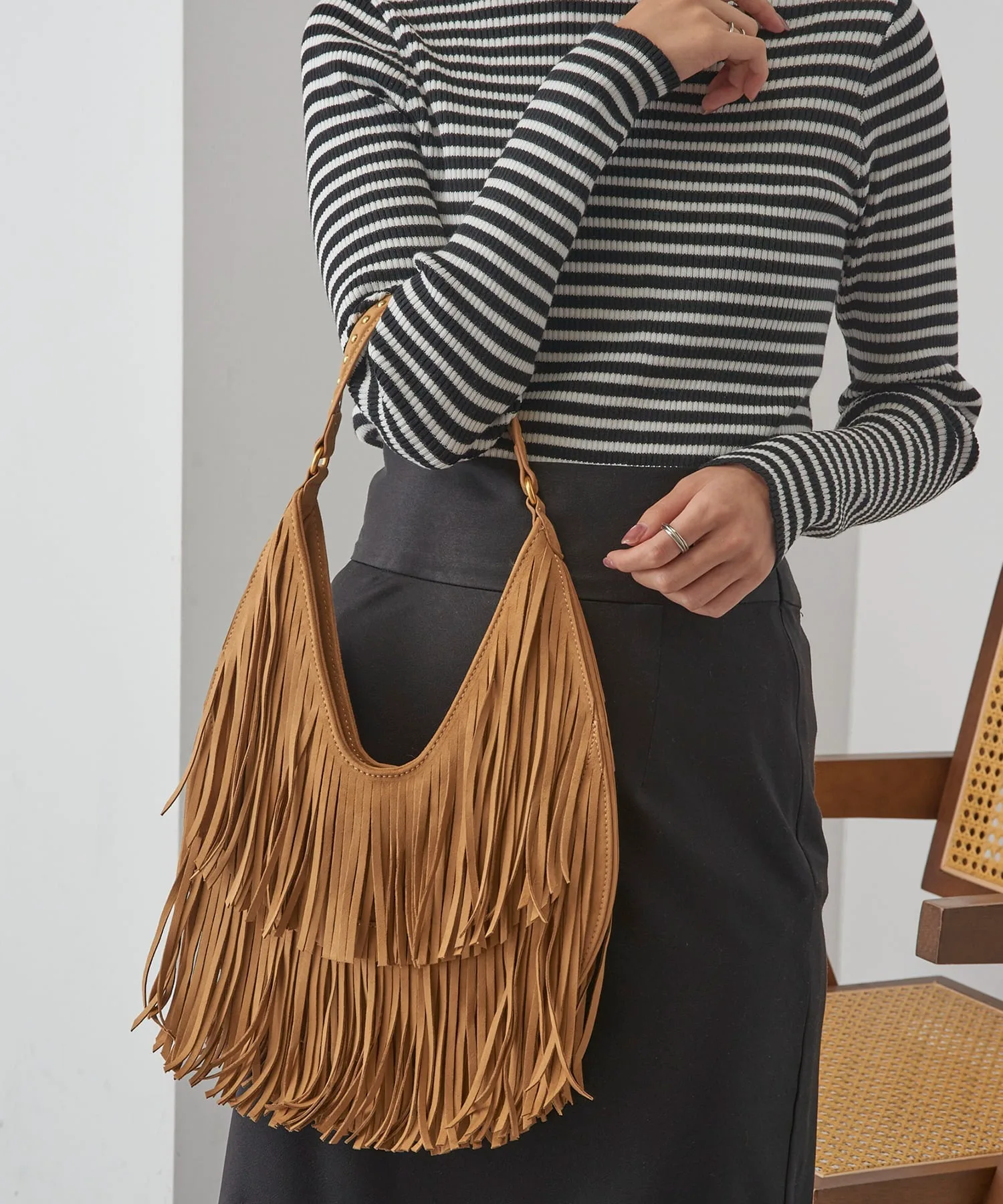 Колеблющаяся бахрома создает модный образЗамшевая сумка-полуплечевой, идеально подходящая для этого сезона
