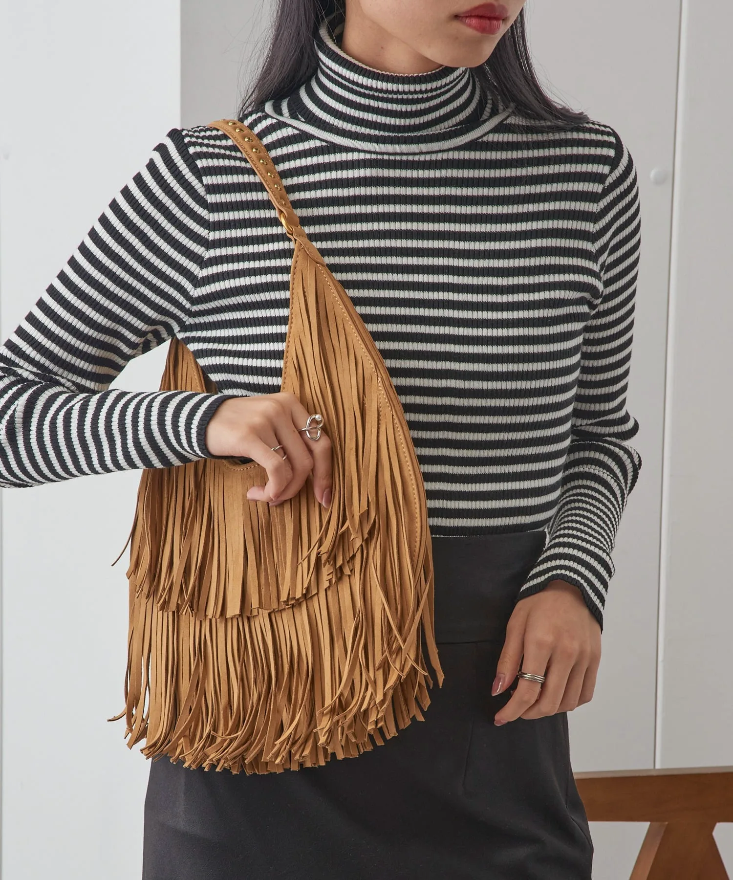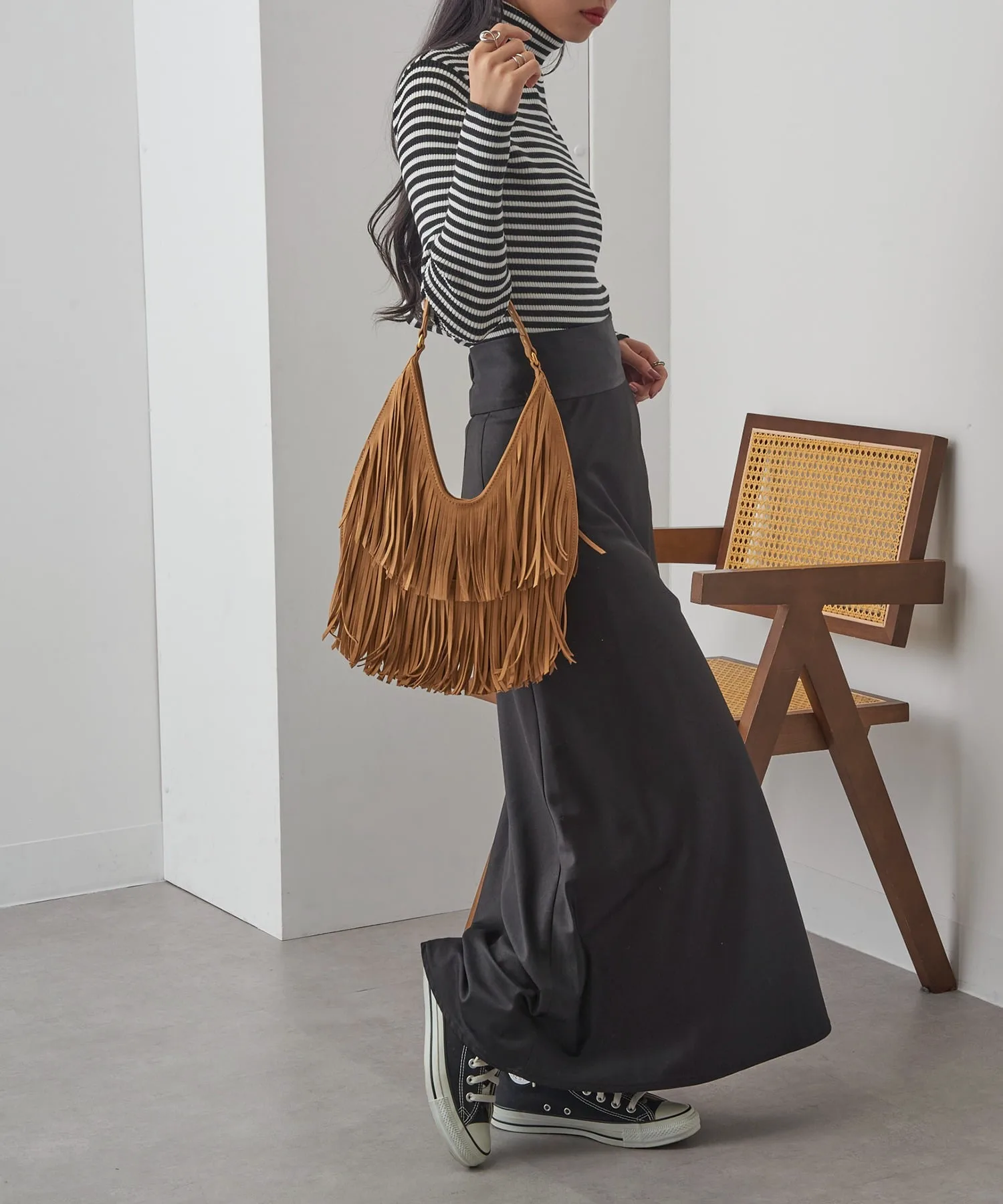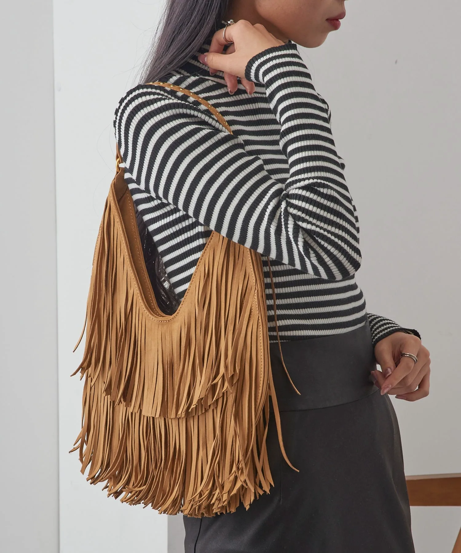 Колеблющаяся бахрома создает модный образЗамшевая сумка-полуплечевой, идеально подходящая для этого сезона