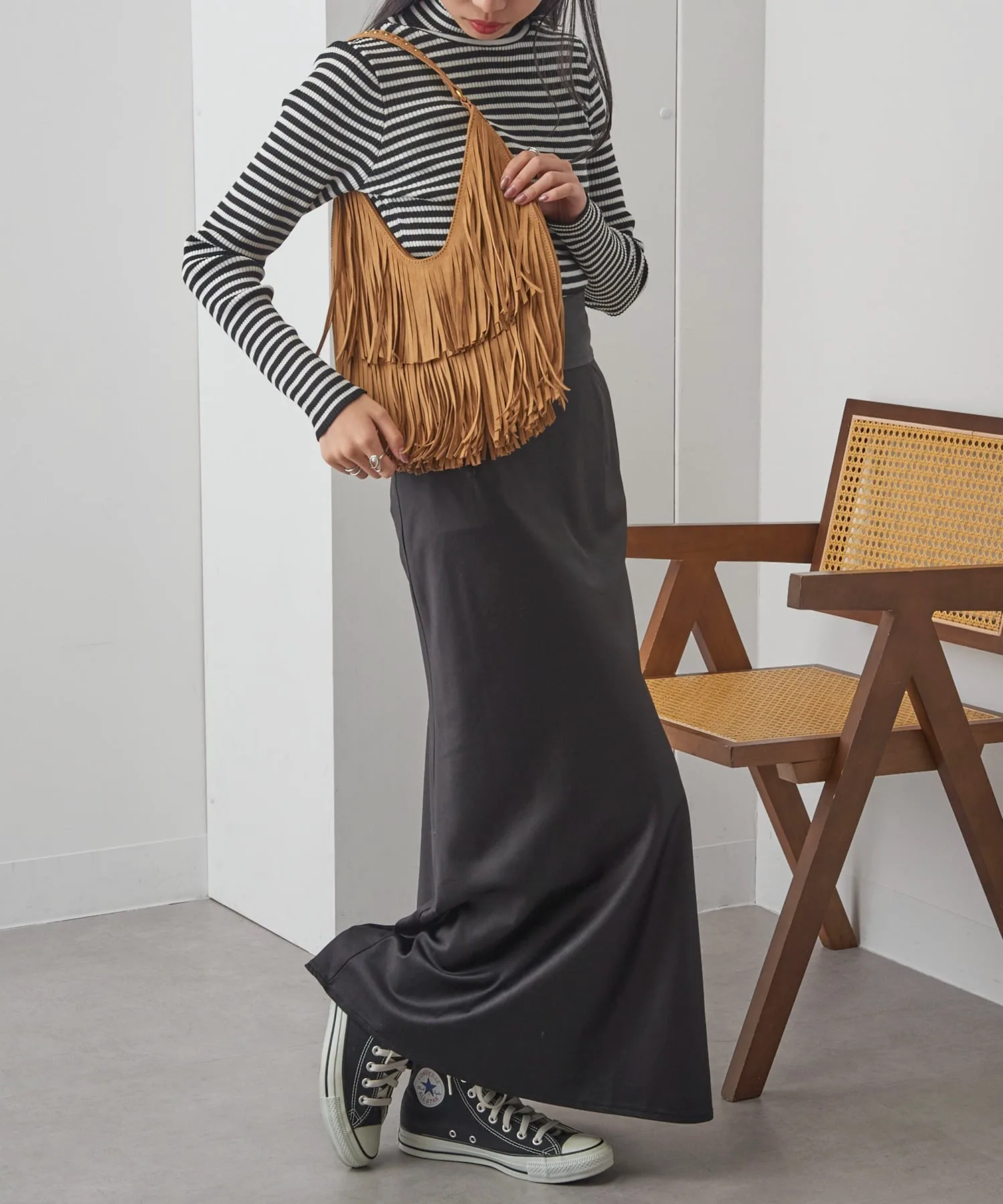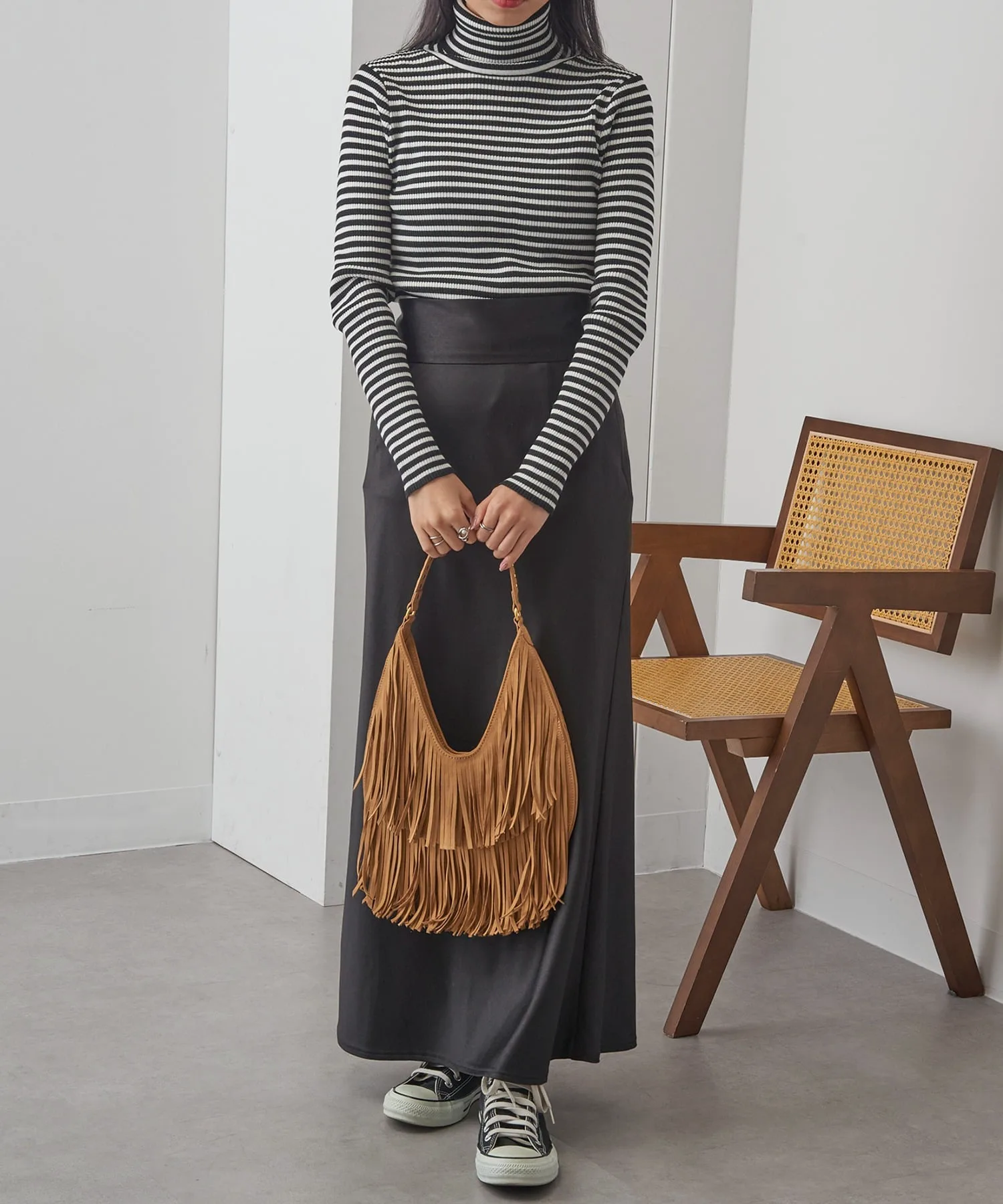 Сочетание・Бахра и текстура сумки добавляют богемный шарм повседневному стилю в сочетании с джинсами или вельветом. ・Сочетайте ее с однотонным трикотажным свитером или пальто, чтобы сумка стала центральным элементом образа. ・Сочетайте ее с женственными нарядами, такими как платья и длинные юбки, чтобы создать расслабленный и воздушный образ. ・Чтобы подчеркнуть красоту развевающейся бахромы, рекомендуем сочетать ее с динамичным стилем или простым монохромным образом.