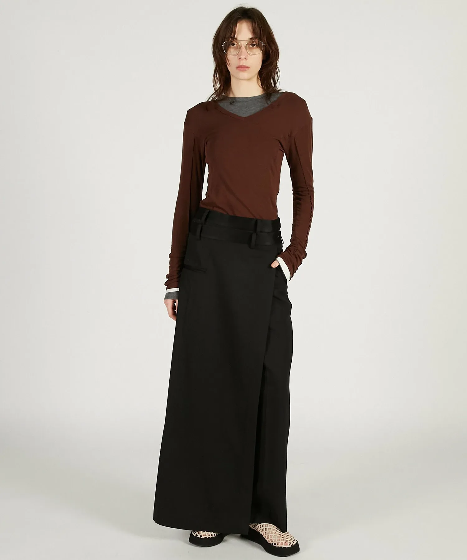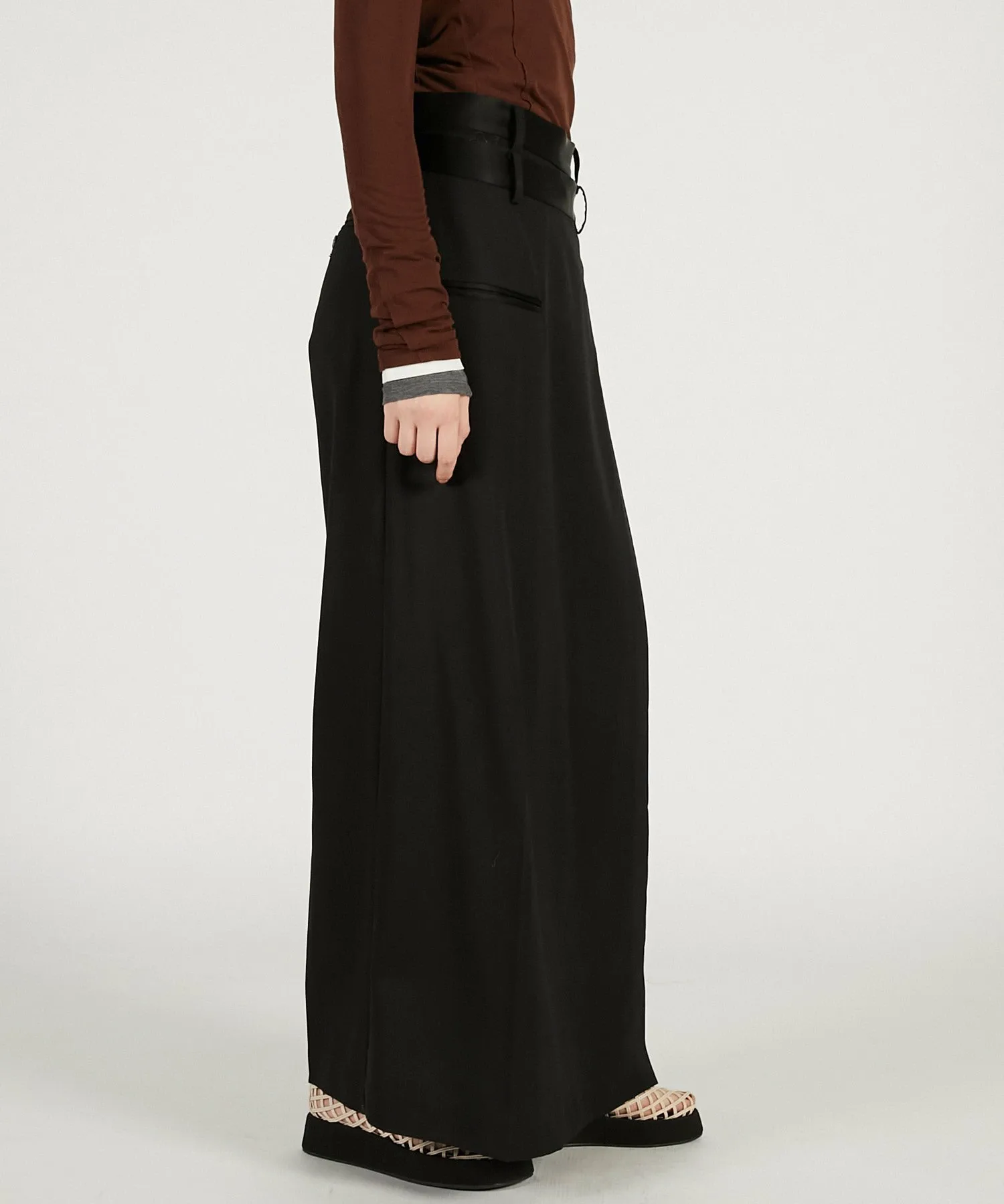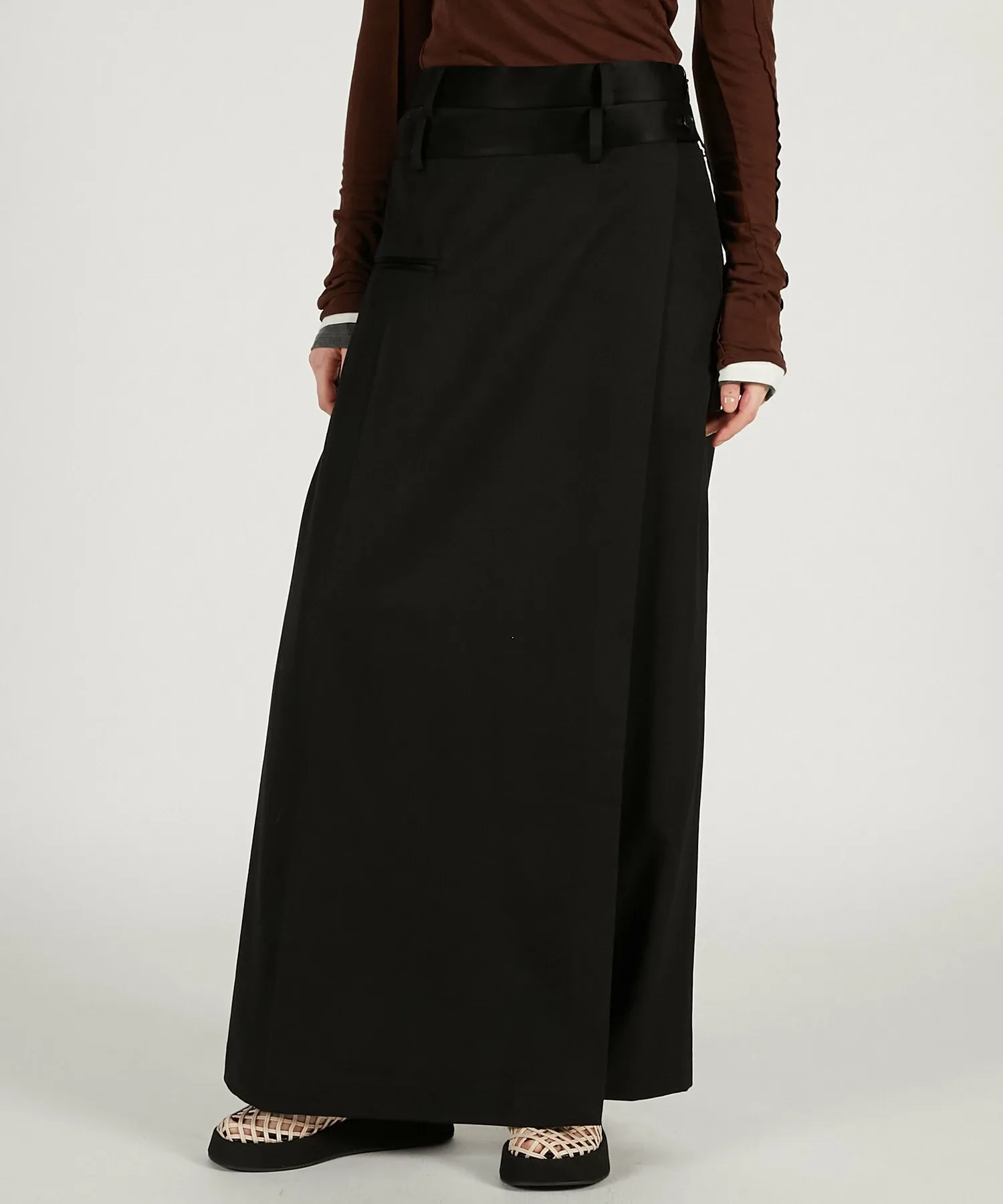 BLK・BRN: Изготовлены из японской камвольной саржи, смеси шерсти и триацетата. Уникальная складка и легкий блеск триацетата придают ей роскошный вид. Ткань имеет умеренную драпировку и удобна в носке.