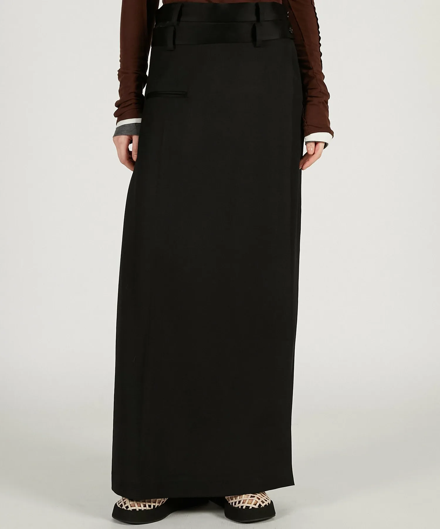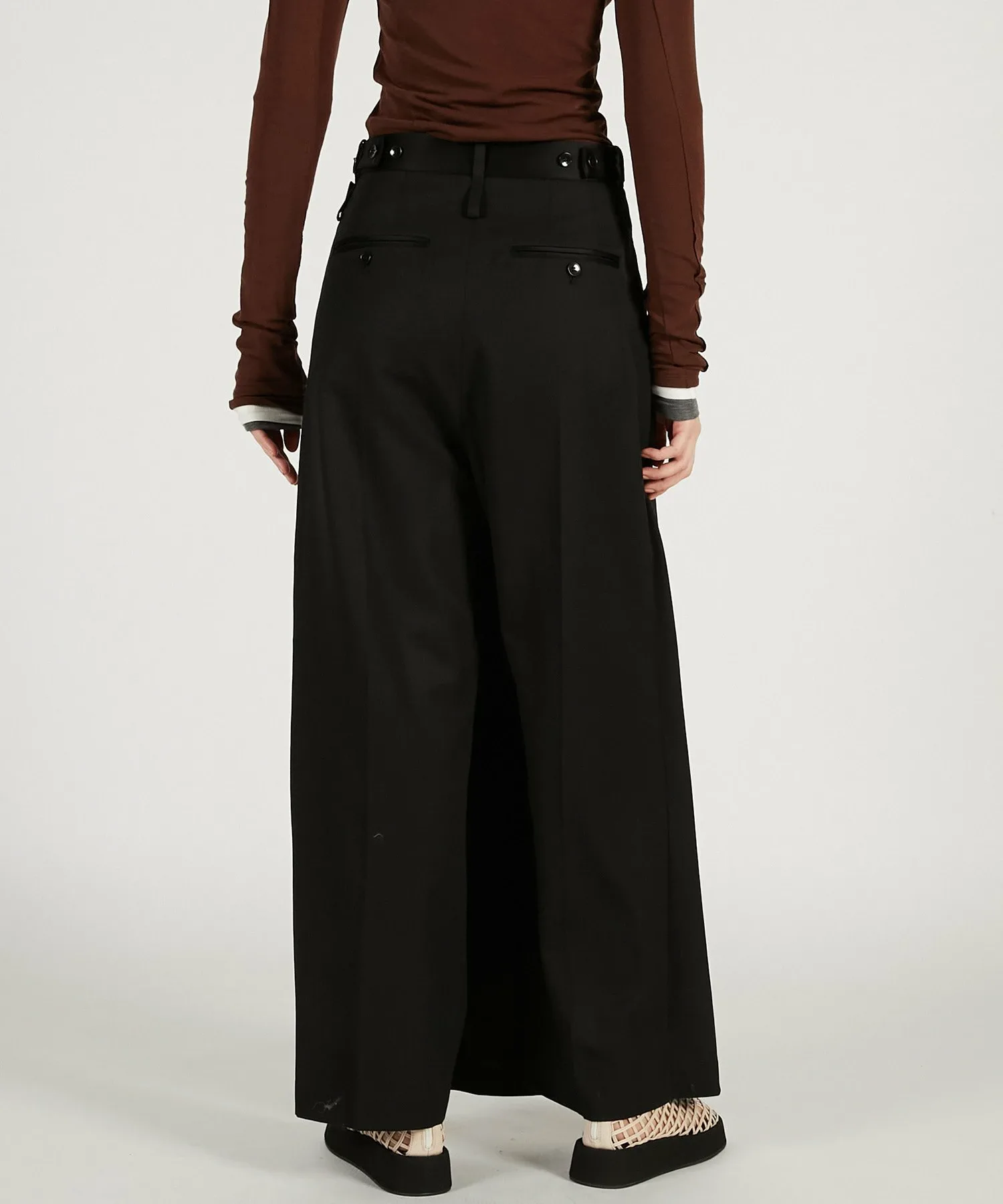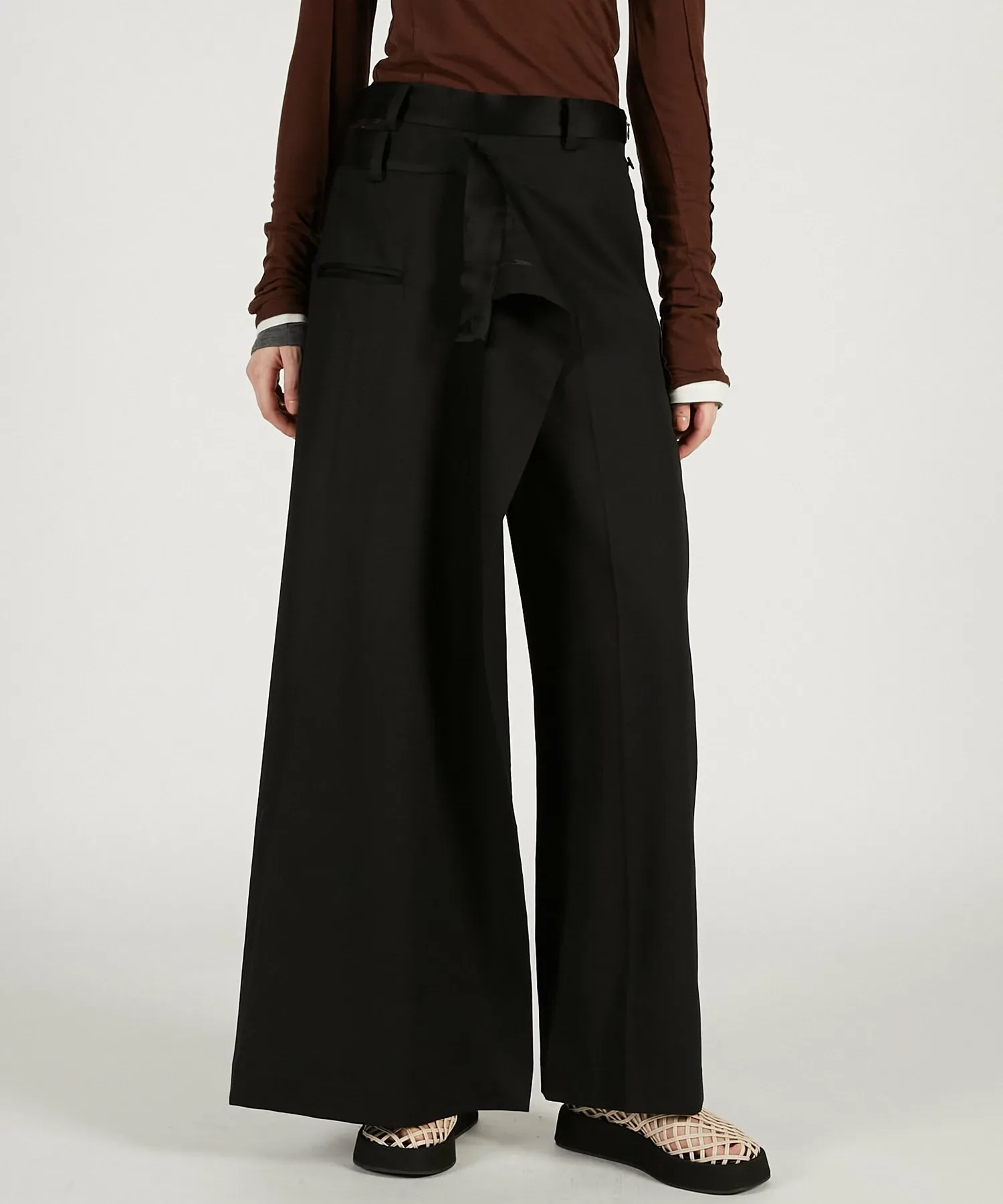 BLK・BRN: Изготовлены из японской камвольной саржи, смеси шерсти и триацетата. Уникальная складка и легкий блеск триацетата придают ей роскошный вид. Ткань имеет умеренную драпировку и удобна в носке.