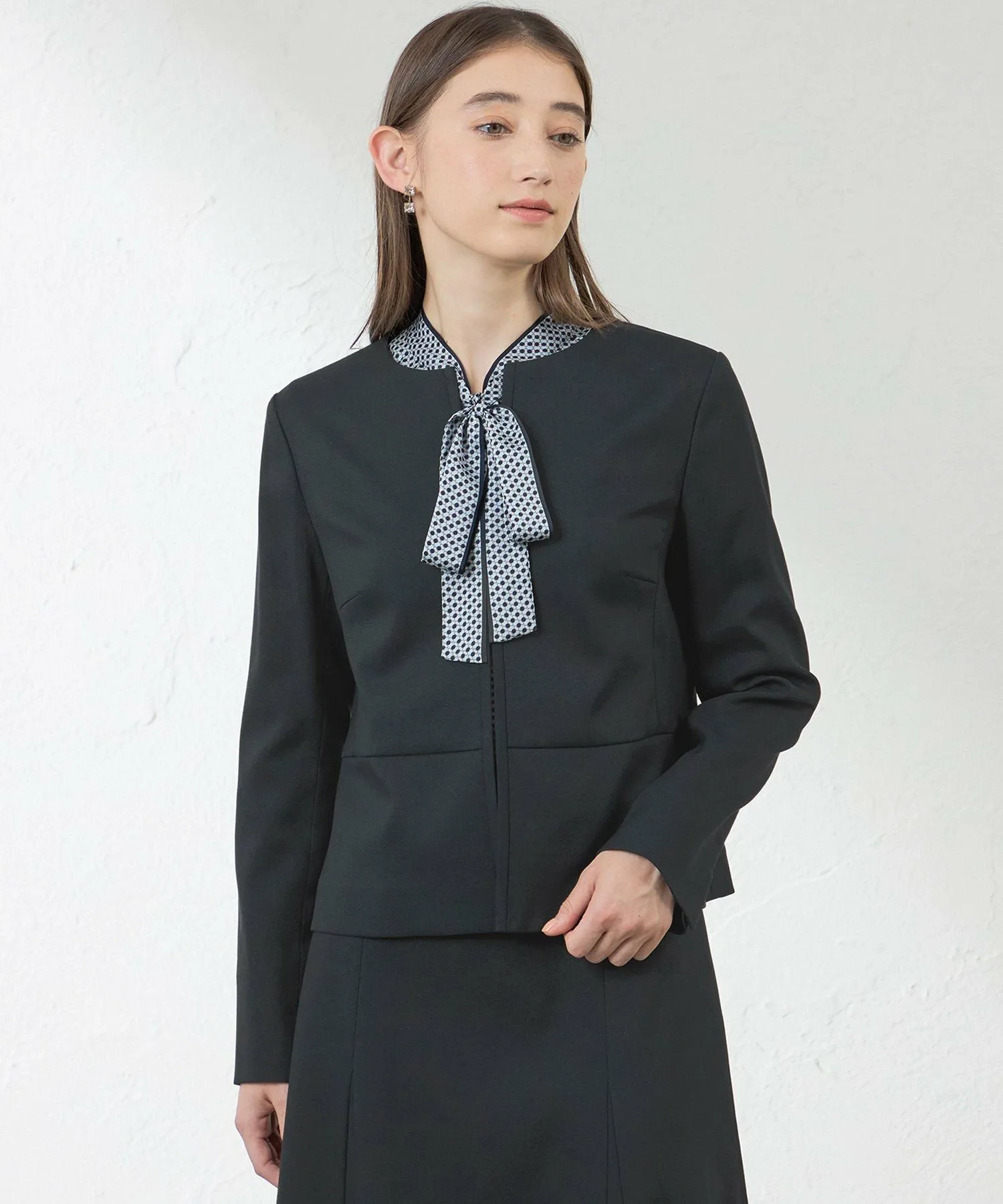 Этот жакет без воротника имеет пояс, создающий красивый силуэт. Застегивается на крючок и петлю, что обеспечивает лаконичный вид даже в расстегнутом виде. Рукава имеют подкладку, а основная часть отделана кантом для легкости. Манжеты имеют разрез.