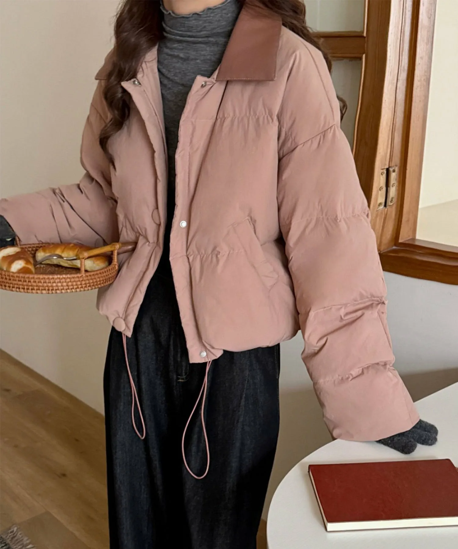 Короткая пуховая куртка с эффектными вставками из искусственной кожи на воротнике.