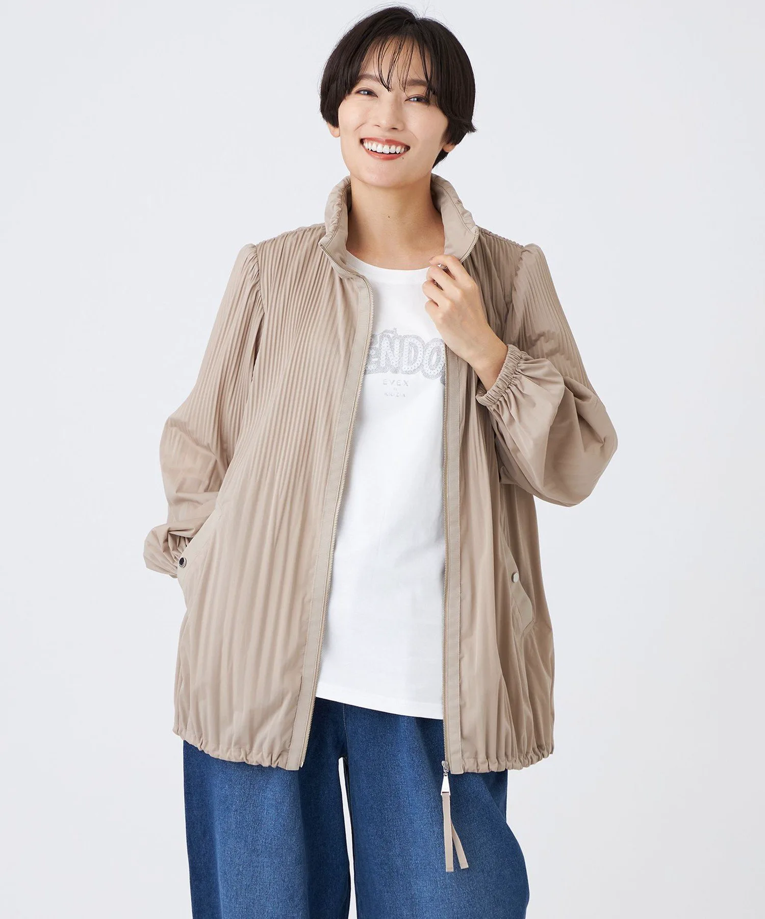 Легкая верхняя одежда, в которой используются складки — ключевой элемент истории бренда. Несмотря на простоту дизайна, она имеет тонкие складки на корпусе и верхней части рукавов, которые плавно переходят к низу, создавая мягкий, пушистый вид. Лента из грогрена украшает молнию и карманы. Чрезвычайно легкая и мягкая, эта верхняя одежда дарит новые и уникальные ощущения.