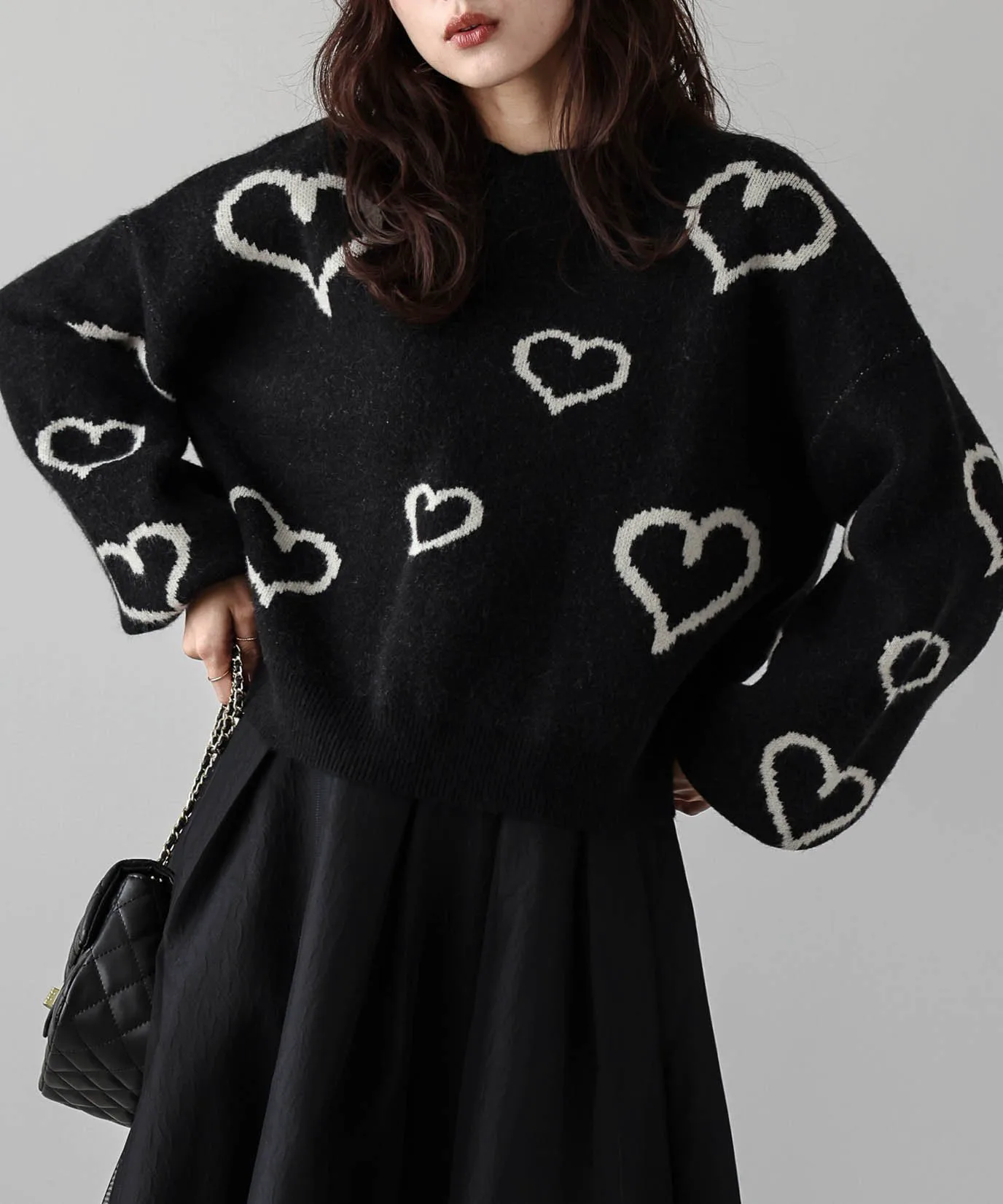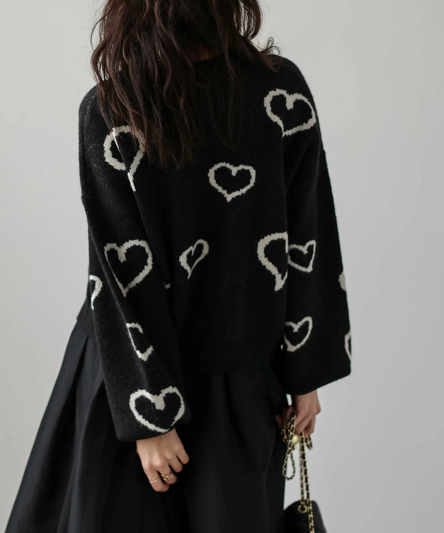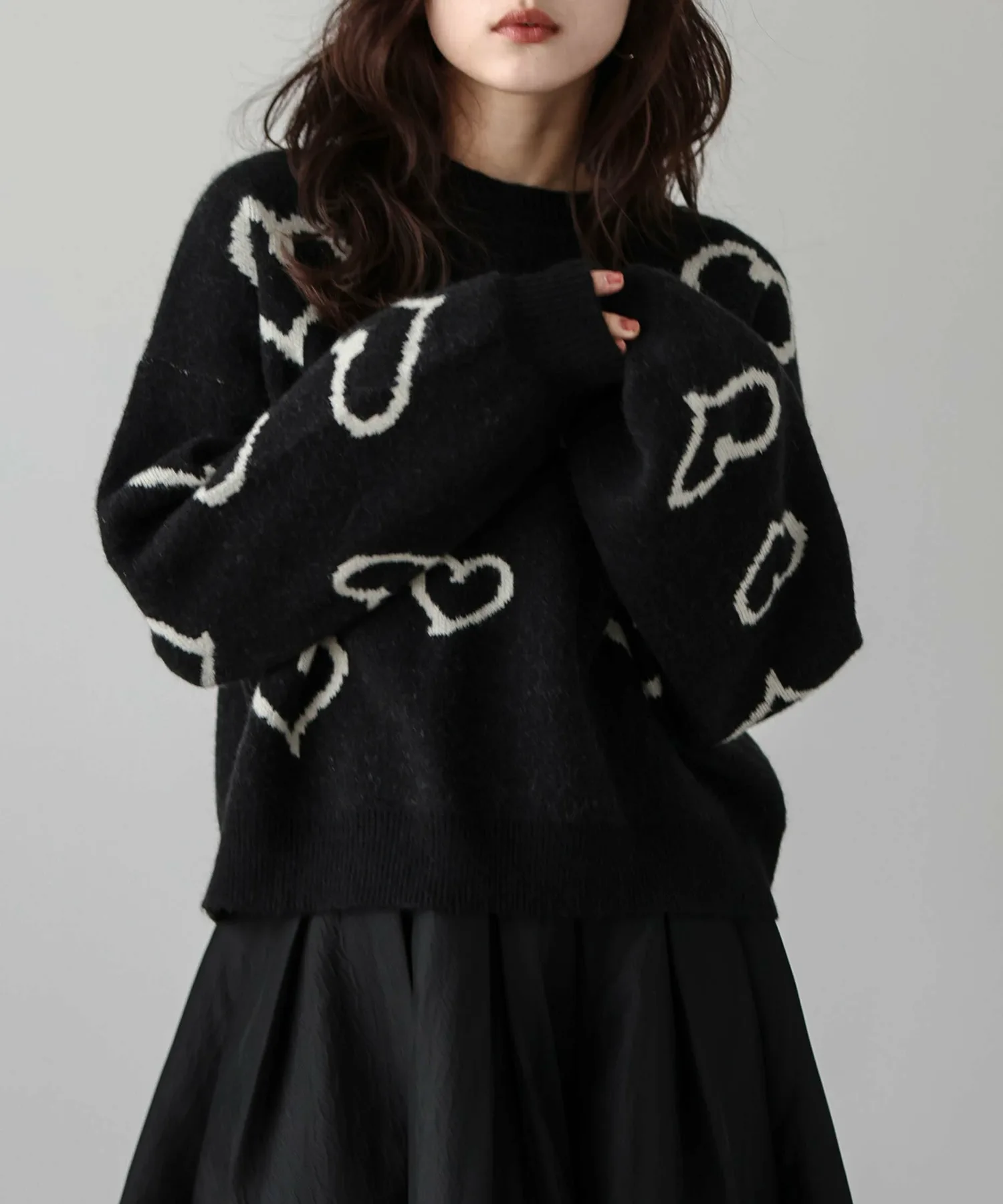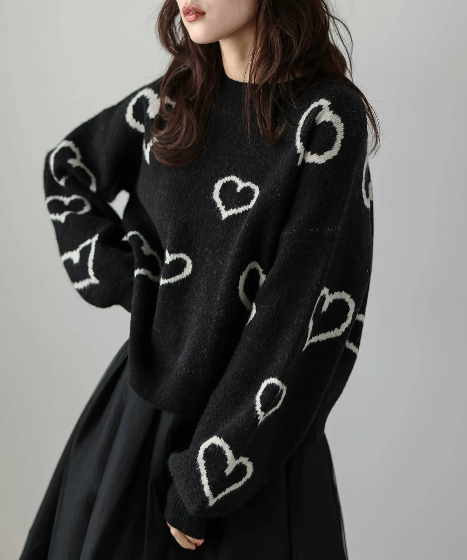 Вязаный пуловер с привлекательным, хаотично расположенным узором из сердечек.