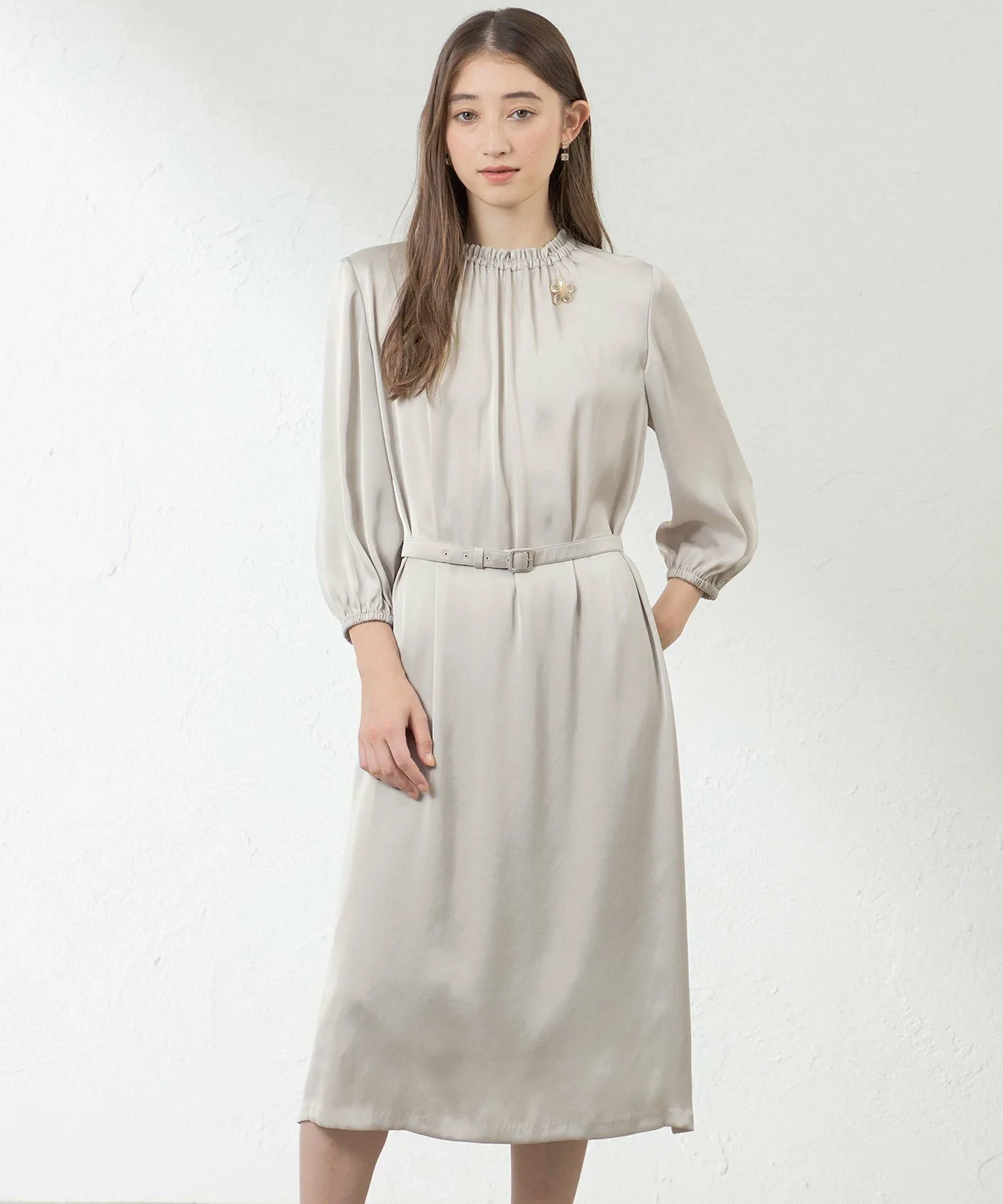 Это простое платье имеет присборенную ткань у выреза горловины с тонкой эластичной резинкой, что делает его идеальным для любого случая. В сочетании с жакетом нежные оборки и сборки на воротнике подчеркивают утонченную элегантность, не делая платье слишком простым. В комплекте также идет пояс в тон для подчеркивания талии.