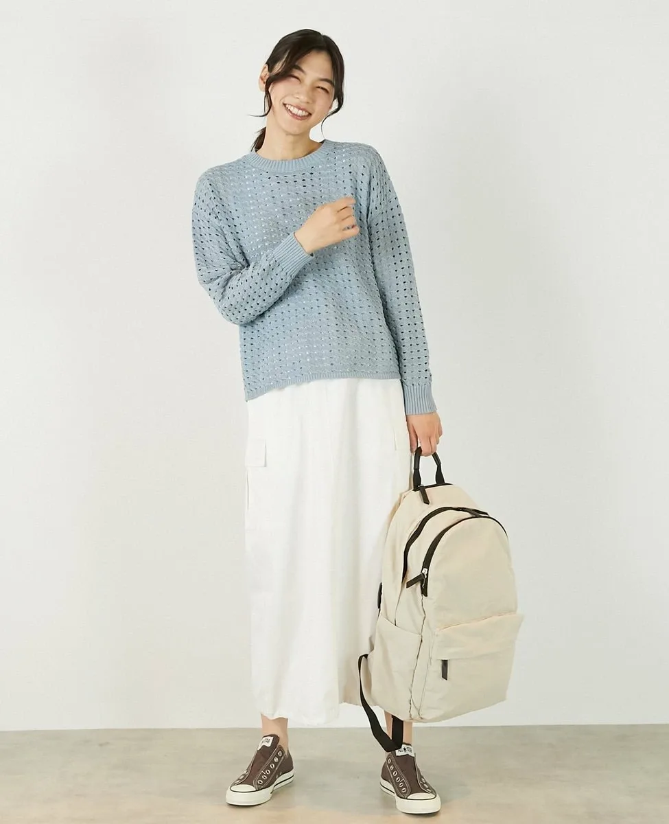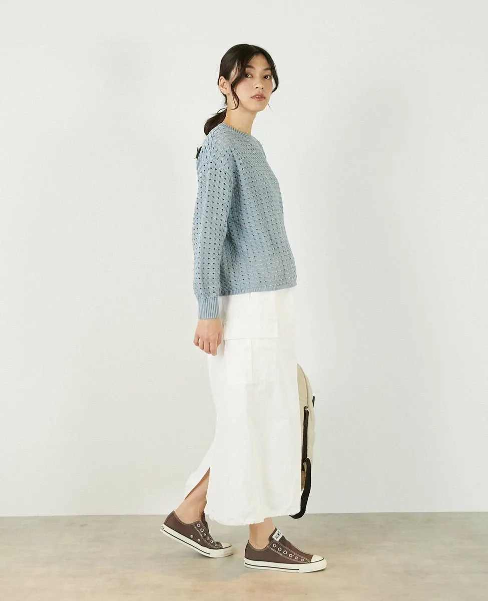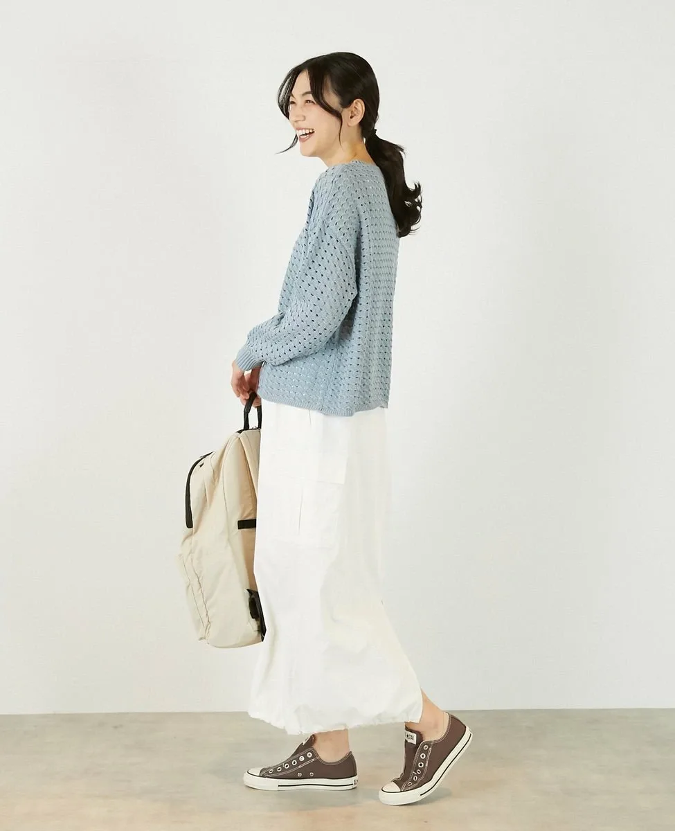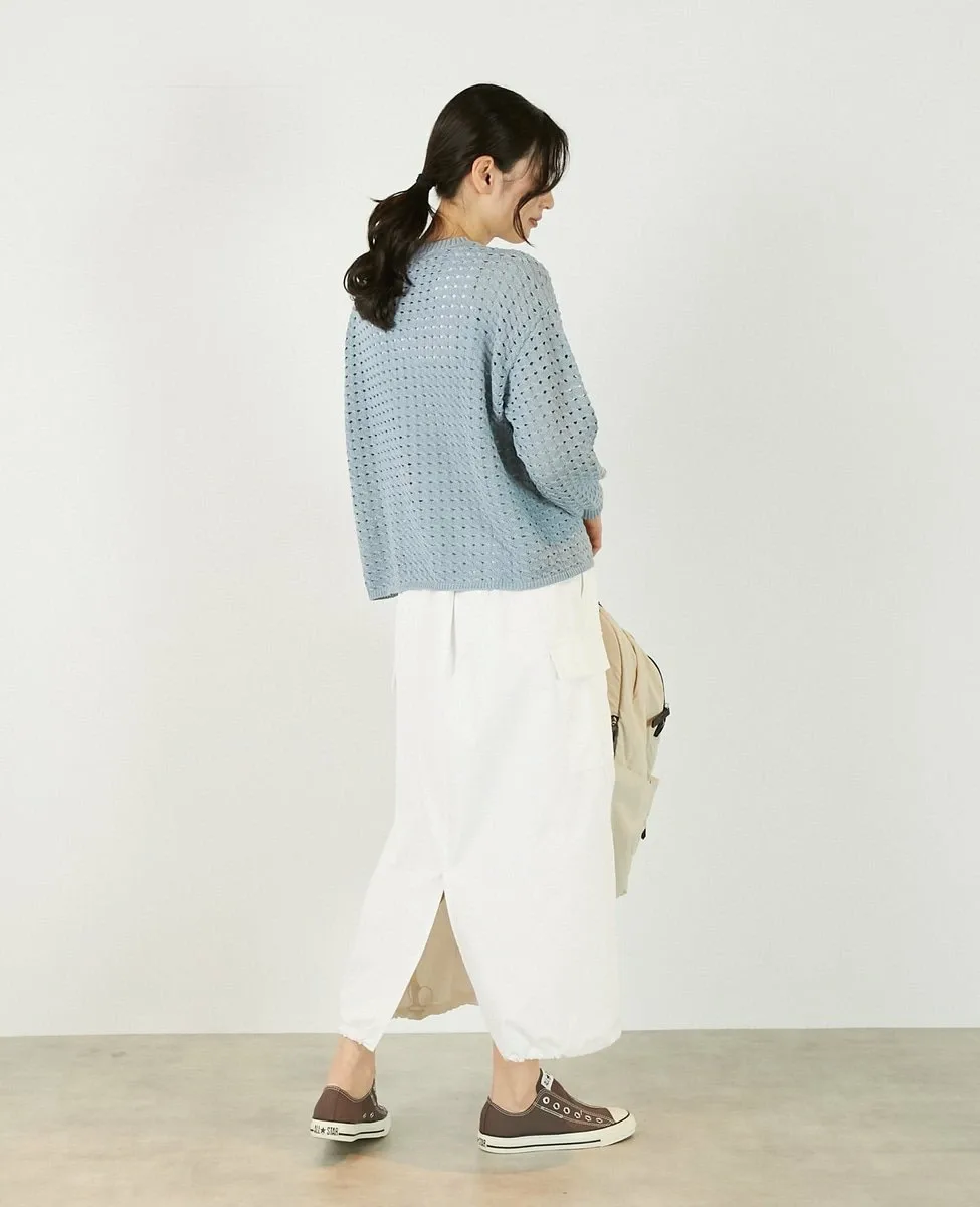 Это слегка непрозрачное, фактурное вязаное полотно с ажурным узором выполнено из пряжи Lily, обладающей элегантным, едва заметным блеском. Сочетайте его с футболкой или блузкой с длинными рукавами для создания идеального весеннего образа.