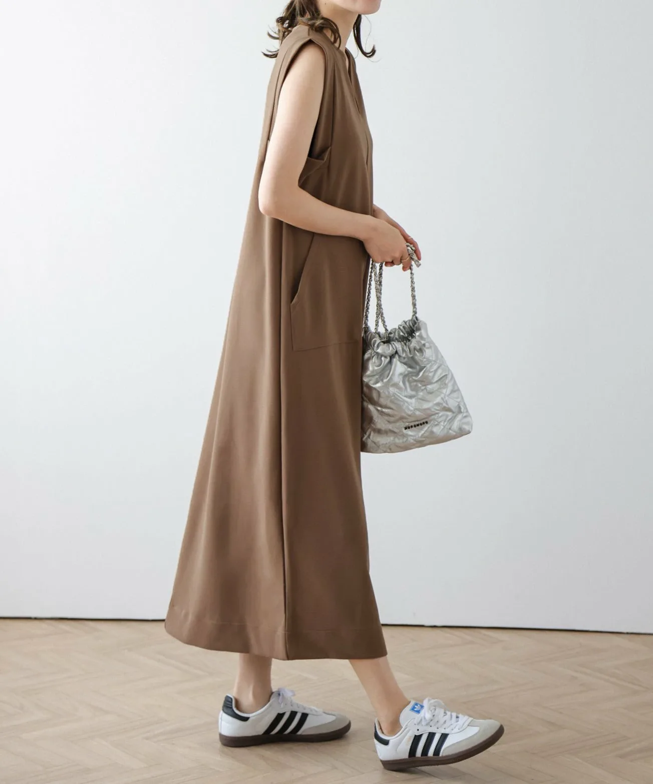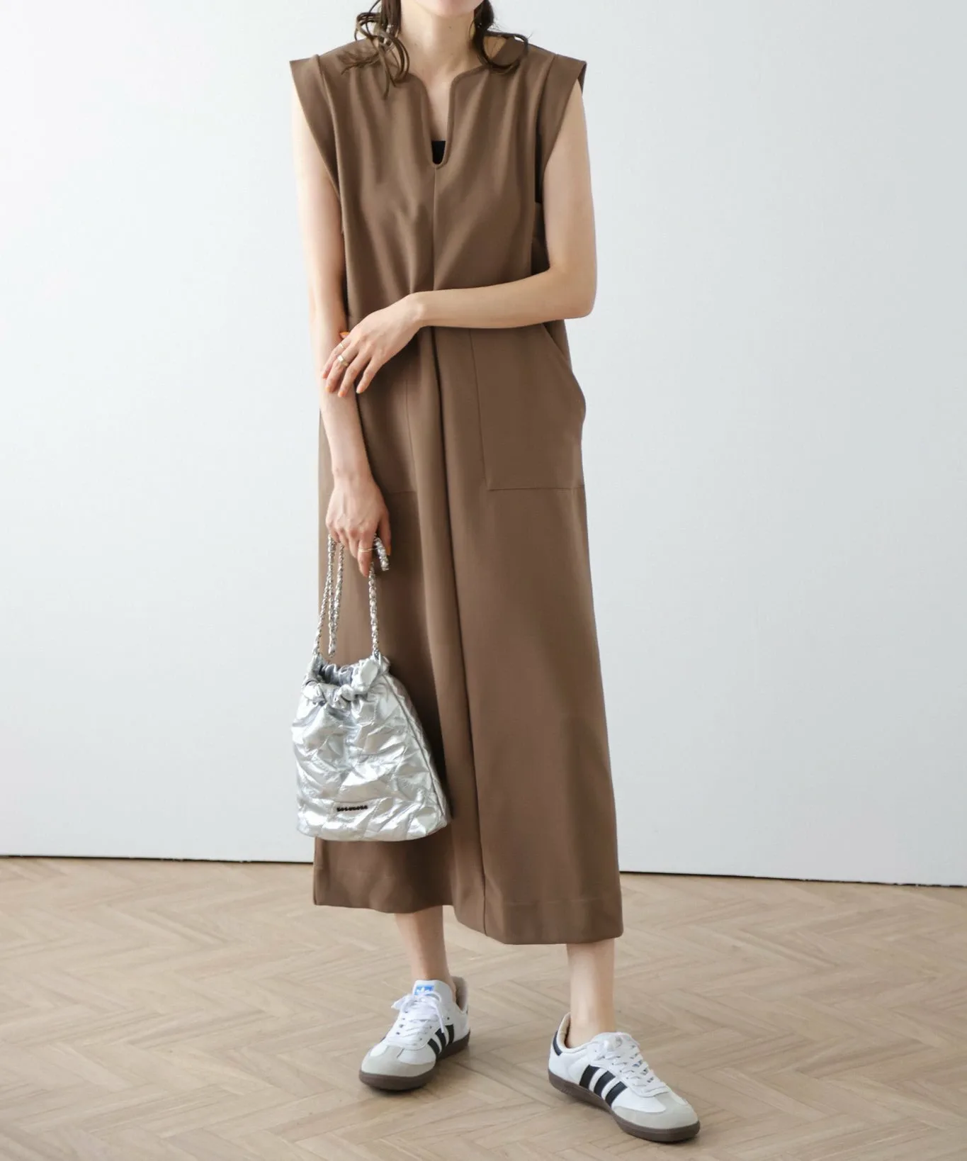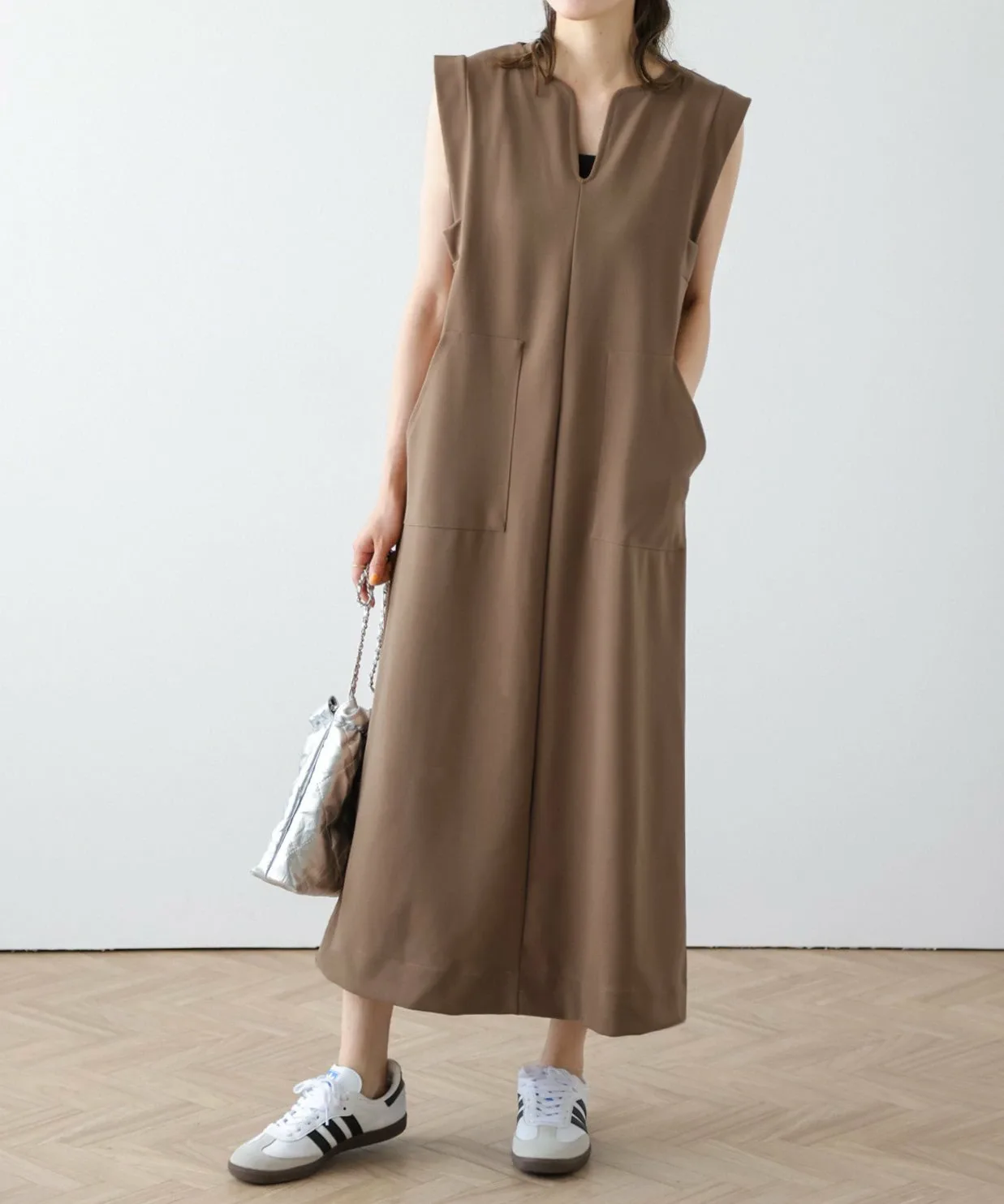 Вырез-«замочная сквадка» придает шее аккуратный вид, создавая ощущение расслабленности, а А-образный силуэт, плавно расширяющийся к подолу, создает элегантное впечатление.