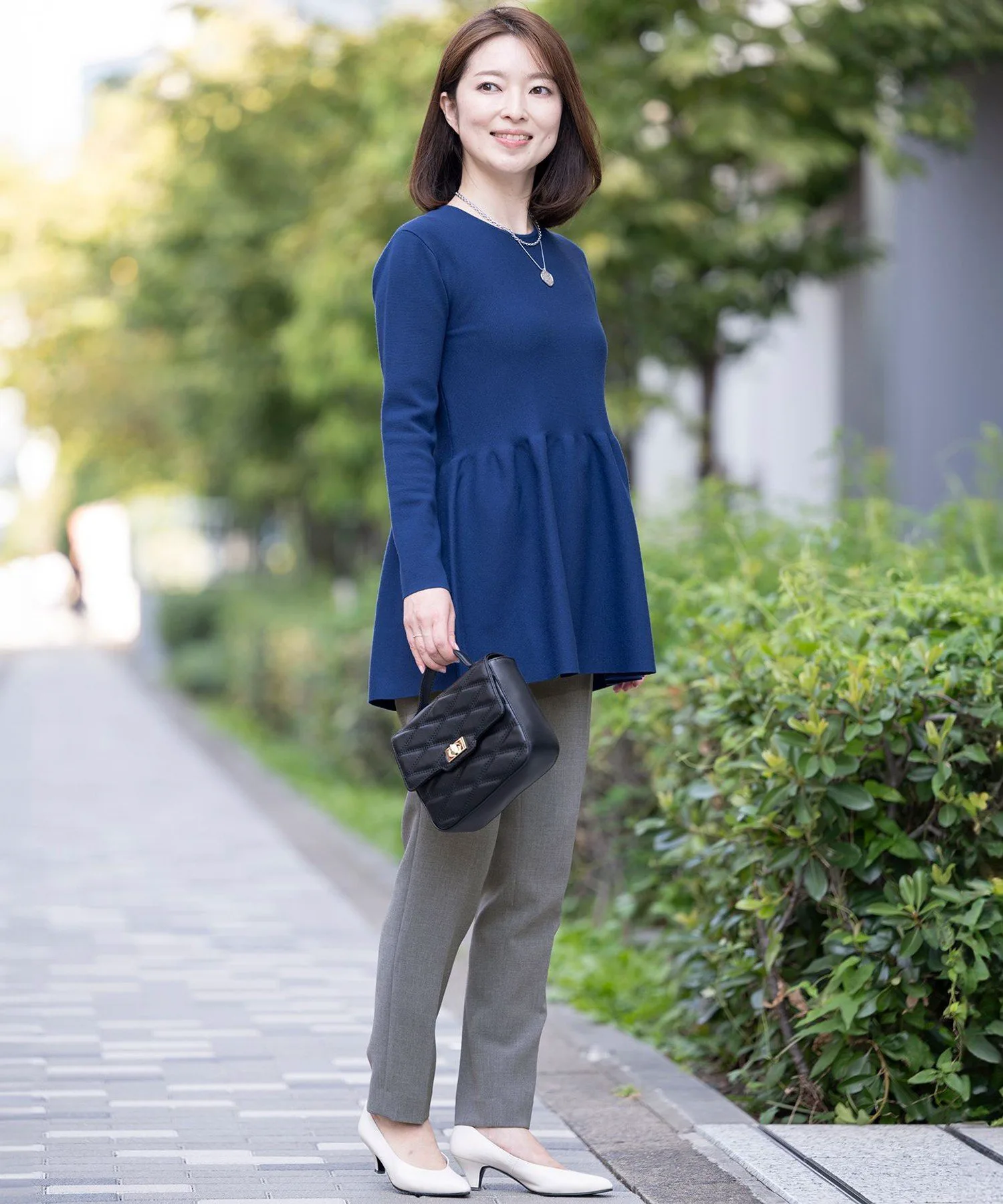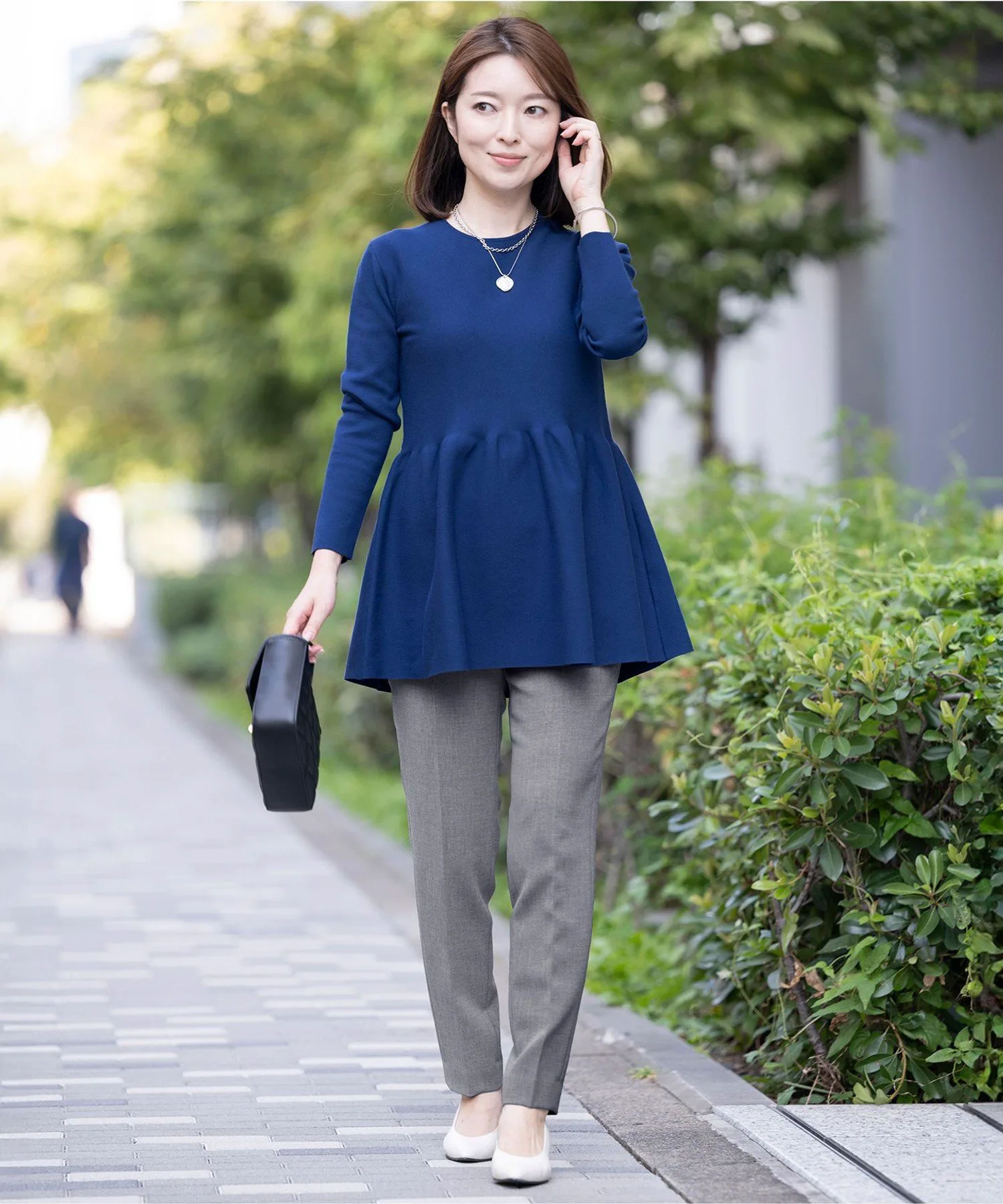Топ длиной до туники с баской, которая подчеркивает умеренное натяжение миланской резинки. Силуэт слегка расширяется выше талии, благодаря чему даже миниатюрные размеры выглядят более стройными и выгодно подчеркивают фигуру. Основная часть изделия имеет обтекаемый и скульптурный силуэт с красивой расклешенной юбкой. Баска выполнена из трикотажной ткани, которая придает изящный вид, оставаясь при этом эластичной. Рукава немного короче, три четверти длины, что позволяет легко продемонстрировать браслет или часы. Доступен в четырех цветах: ярко-слоновая кость (#002), серый с оттенком ню (#004), классический черный (#005) и элегантный тускло-голубой (#074).