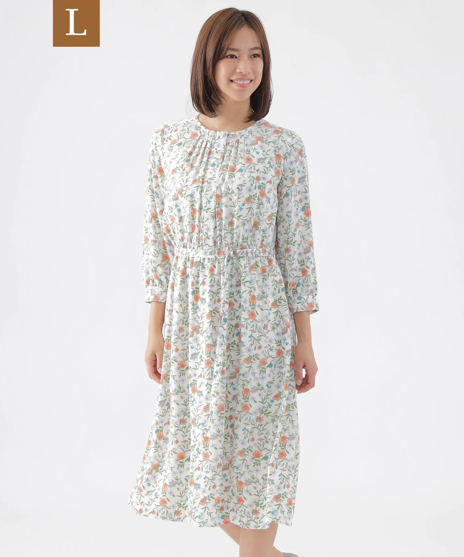 Это платье изготовлено из оригинального материала с цветочным принтом — легкой хлопчатобумажной ткани простого переплетения, воспроизведенной в полиэстере. Его превосходная воздухопроницаемость, легкость и эластичная текстура создают удобный и привлекательный силуэт. Цветочный принт — это оригинальный дизайн, созданный специально для Transwork. Красочные изображения различных цветов и листьев выполнены с точностью и деликатностью, вызывая образ элегантного сада или поля диких цветов.