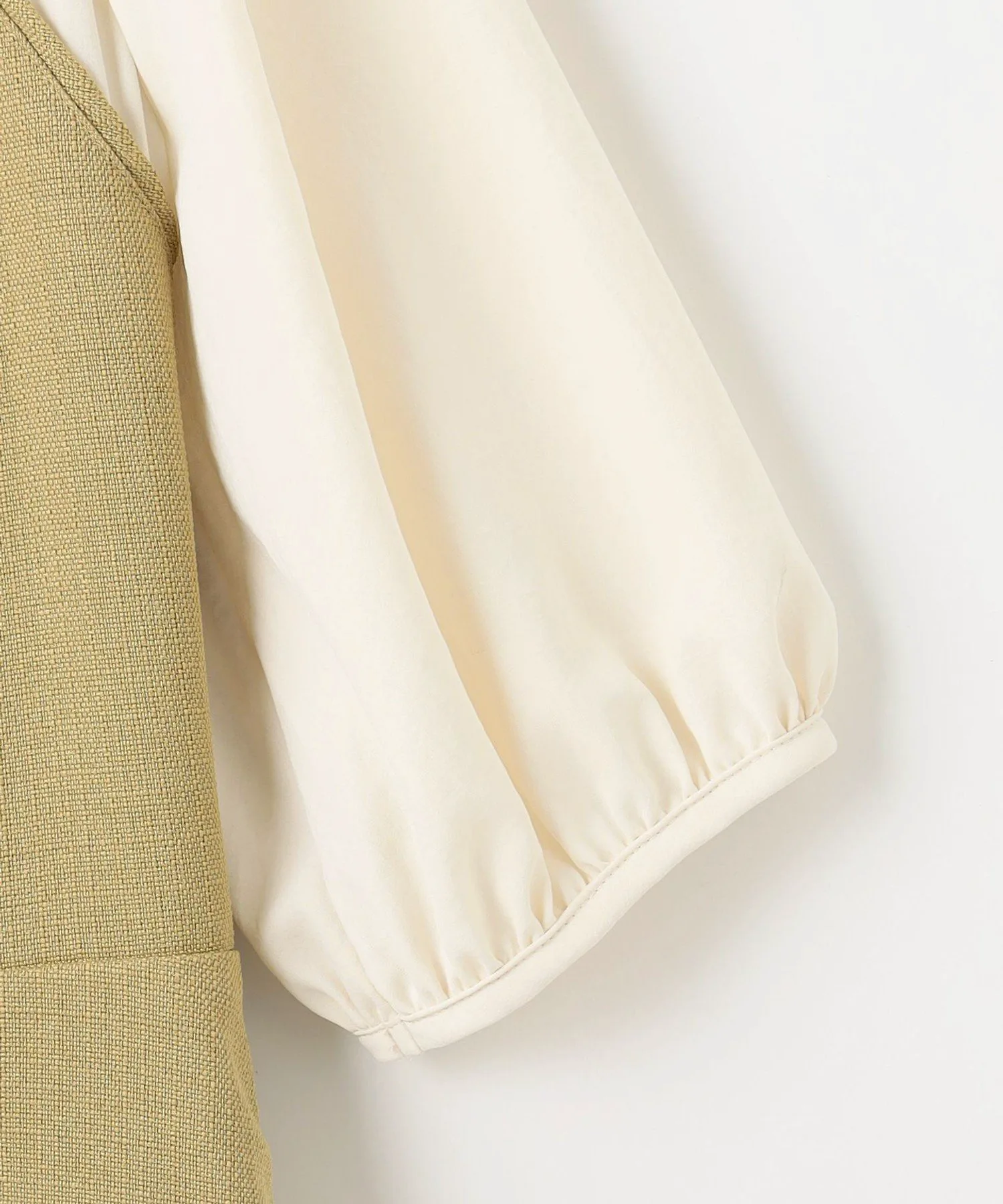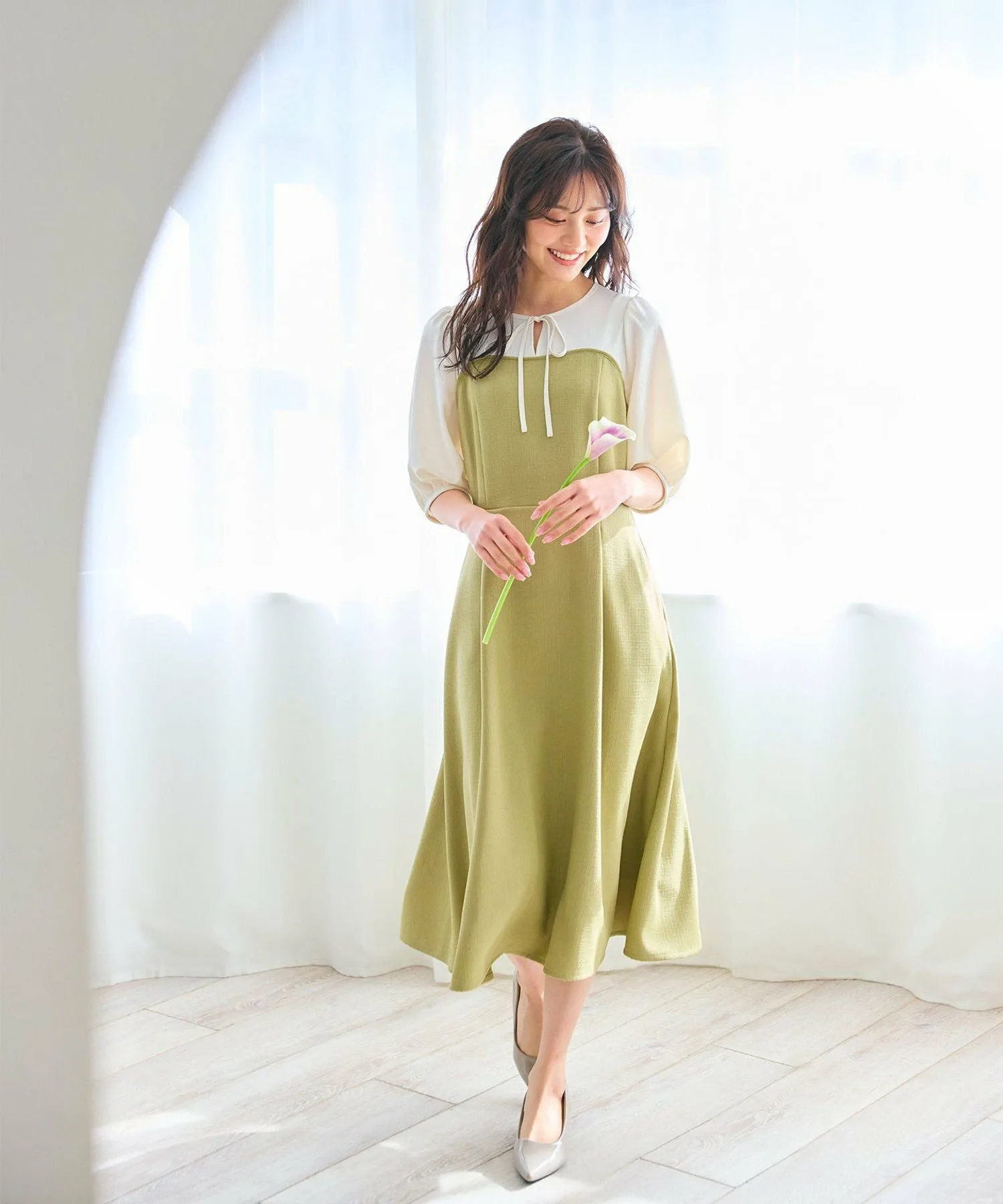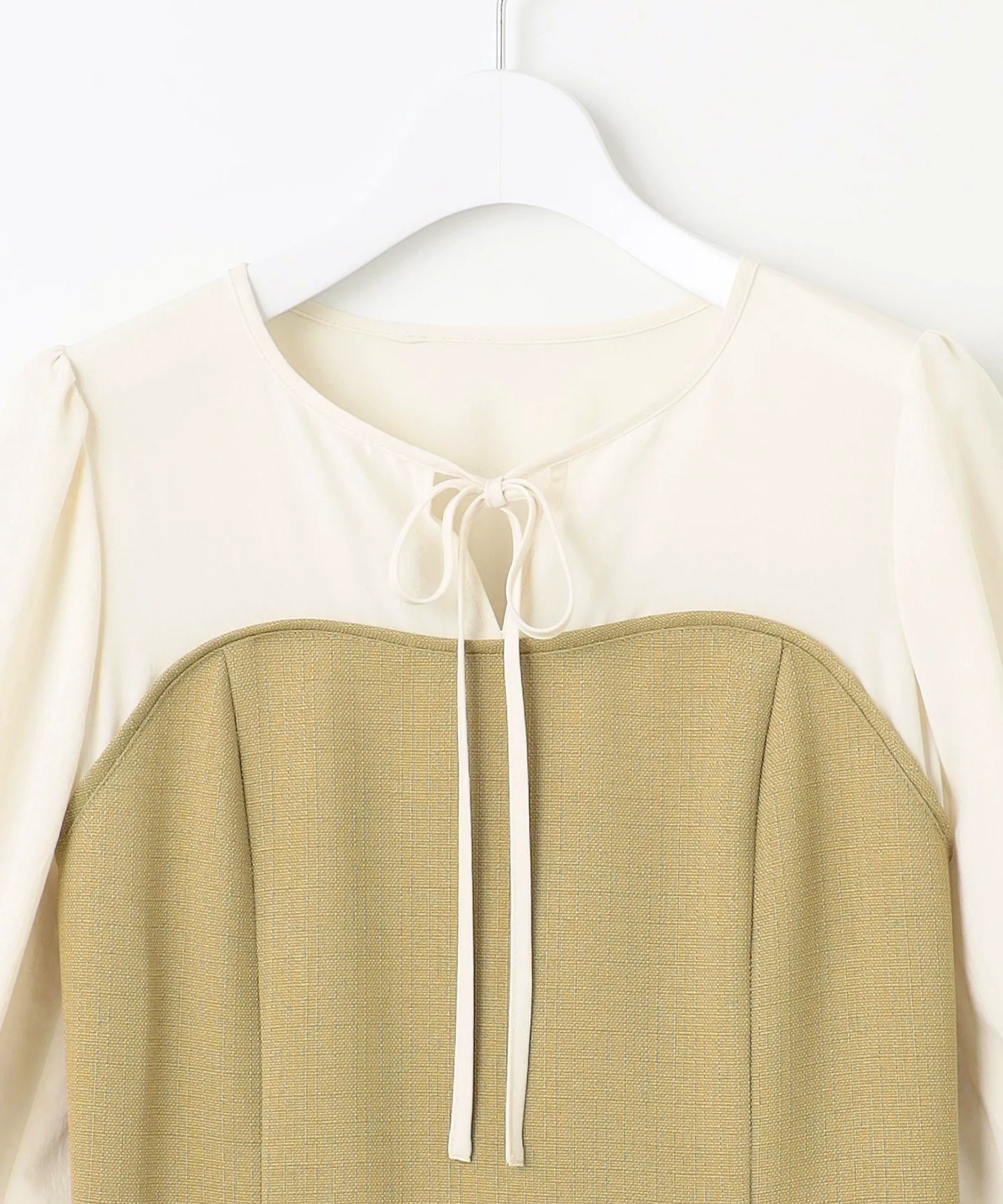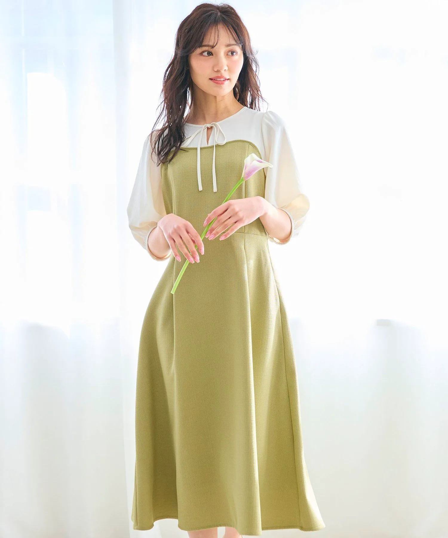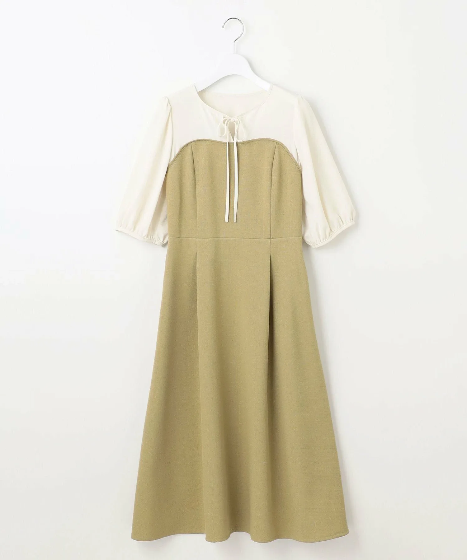 Платье с эффектным дизайном, созданным за счет использования различных материалов. Декольте и рукава выполнены из мягкой синтетической ткани для блузок, что придает женственный вид. Лиф и юбка выполнены из фактурной ткани в виде корзины. Она имеет гладкую текстуру и оптимальную толщину для комфортной посадки. Изящно отделанный тонкий ленточный узор на груди создает очаровательное впечатление. Классический силуэт «приталенный и расклешенный» выражает элегантность. Доступно в весенних фисташково-бежевых тонах и классическом черном цвете с контрастной цветовой гаммой.