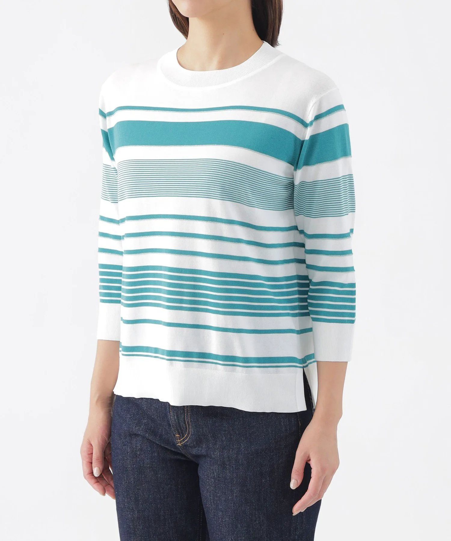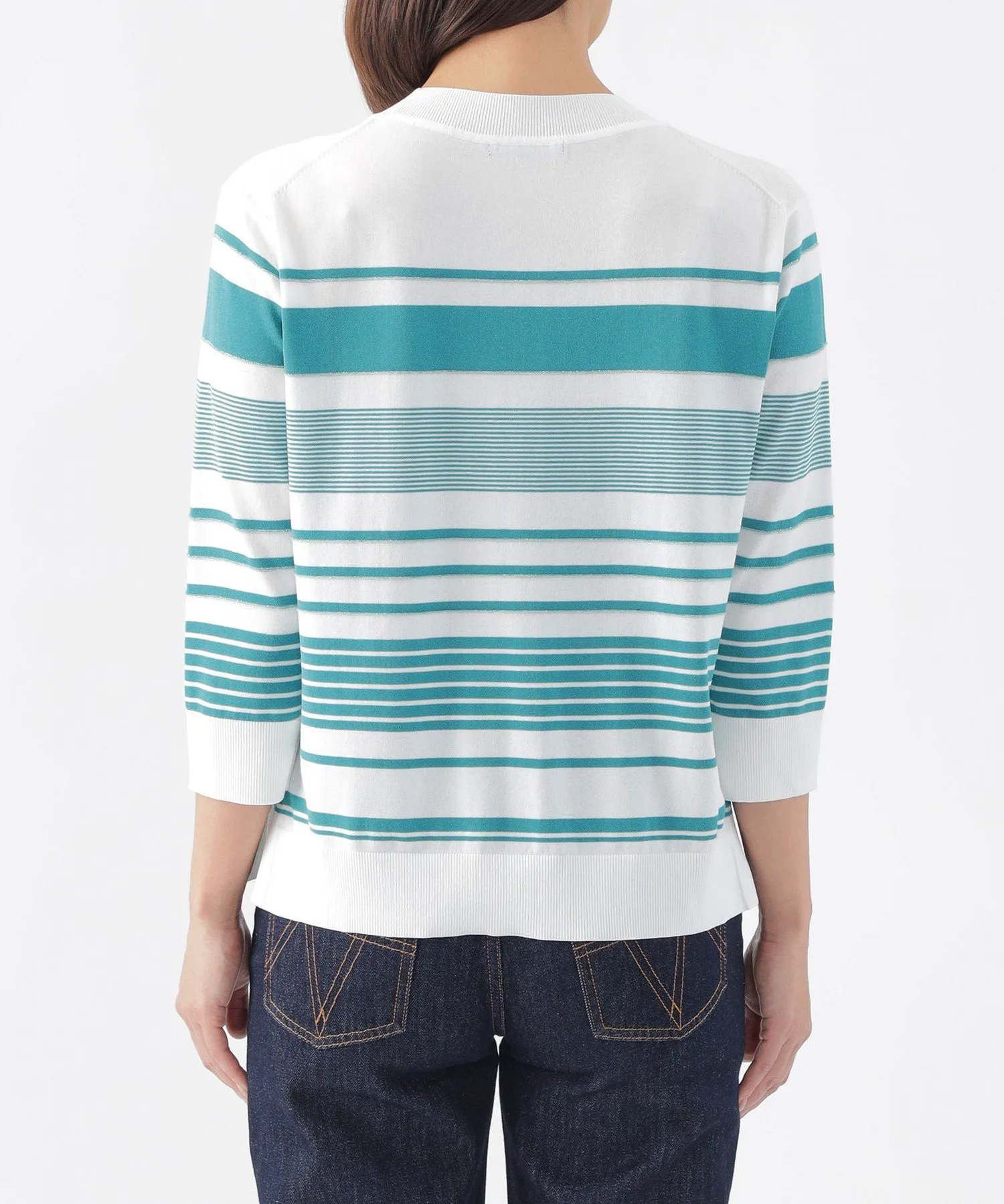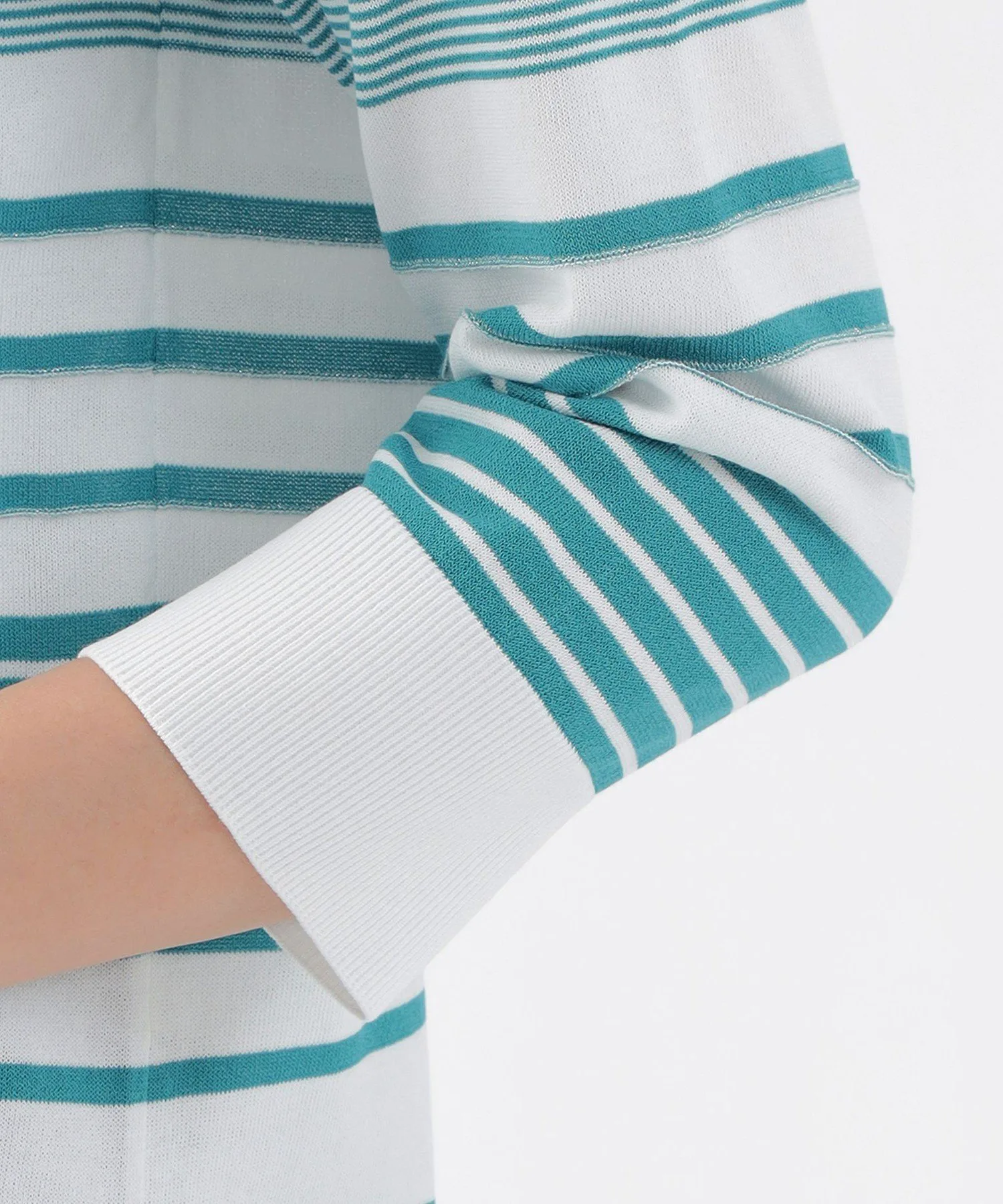 Эта трикотажная ткань имеет произвольную кайму, с однотонными участками на воротнике, подоле и манжетах, а также блестящими люрексовыми нитями в некоторых местах для изысканного вида. Слегка открытый вырез горловины также является ключевой деталью. Хлопково-полиэстерный материал обладает оптимальной плотностью, создавая чистый, прямой силуэт, который не подчеркивает линии тела.