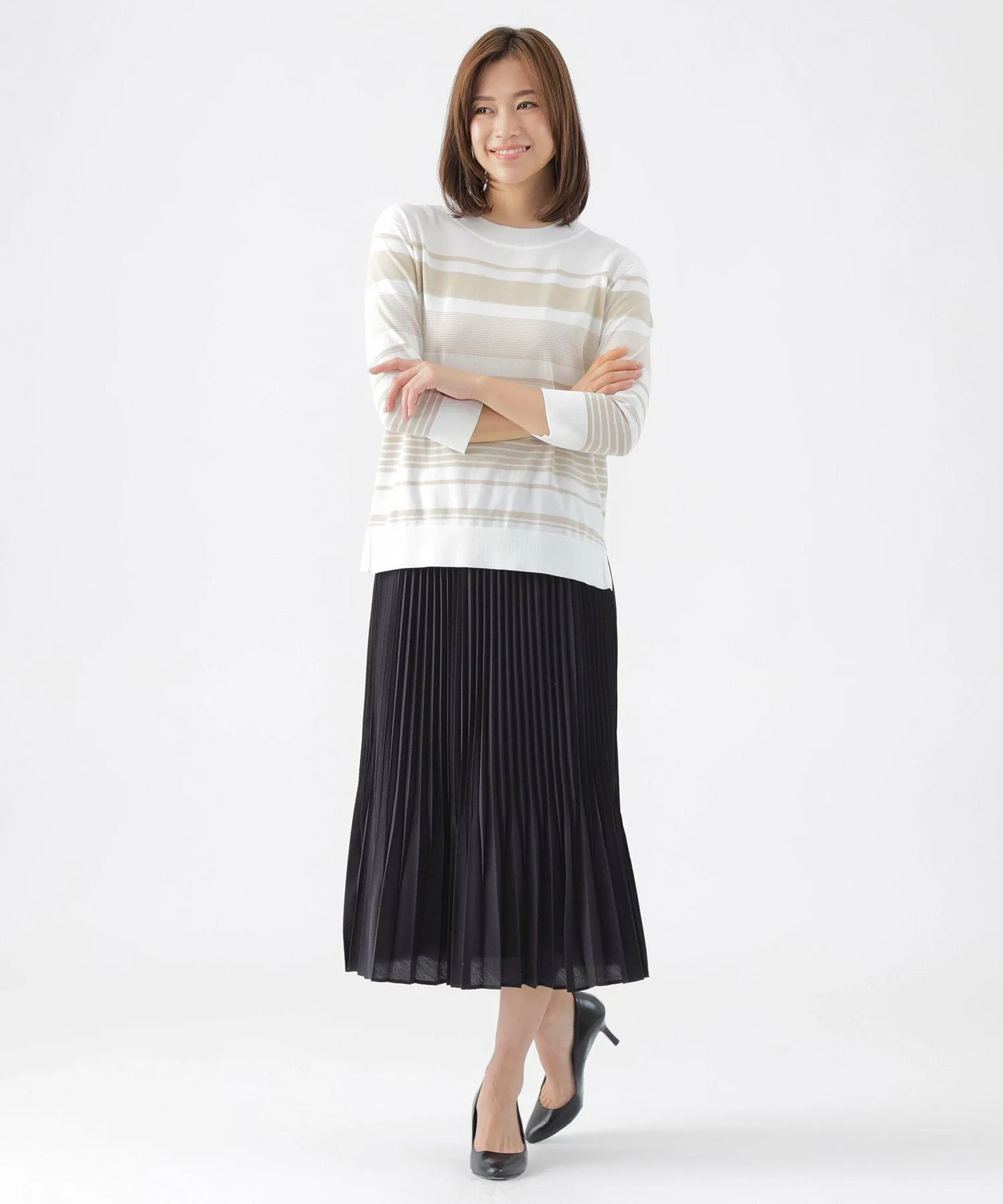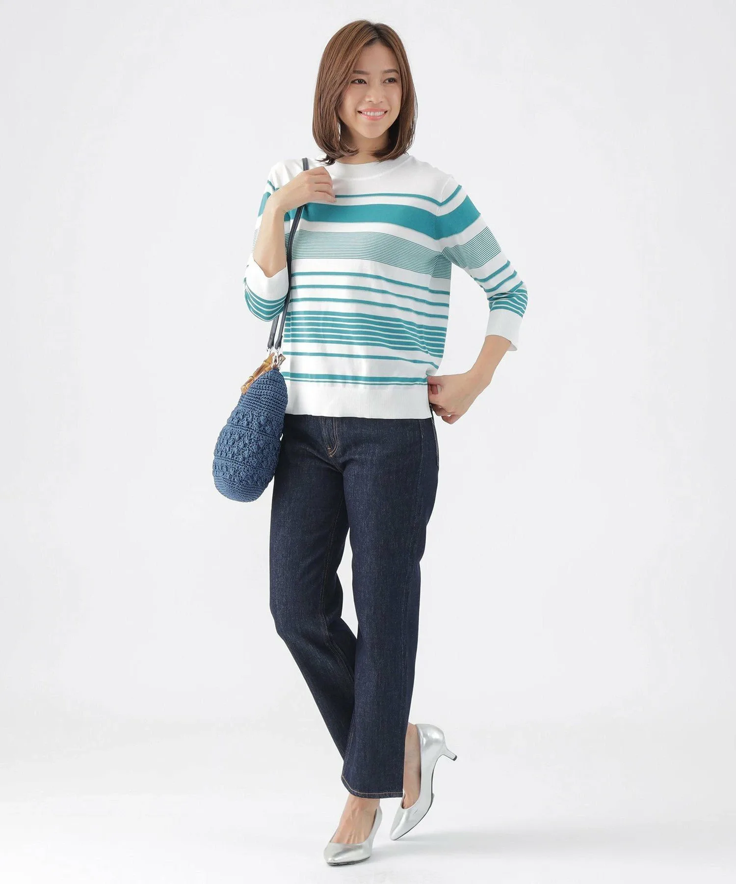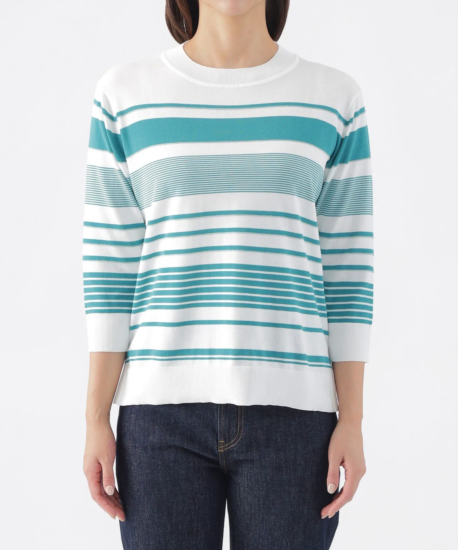 Эта трикотажная ткань имеет произвольную кайму, с однотонными участками на воротнике, подоле и манжетах, а также блестящими люрексовыми нитями в некоторых местах для изысканного вида. Слегка открытый вырез горловины также является ключевой деталью. Хлопково-полиэстерный материал обладает оптимальной плотностью, создавая чистый, прямой силуэт, который не подчеркивает линии тела.