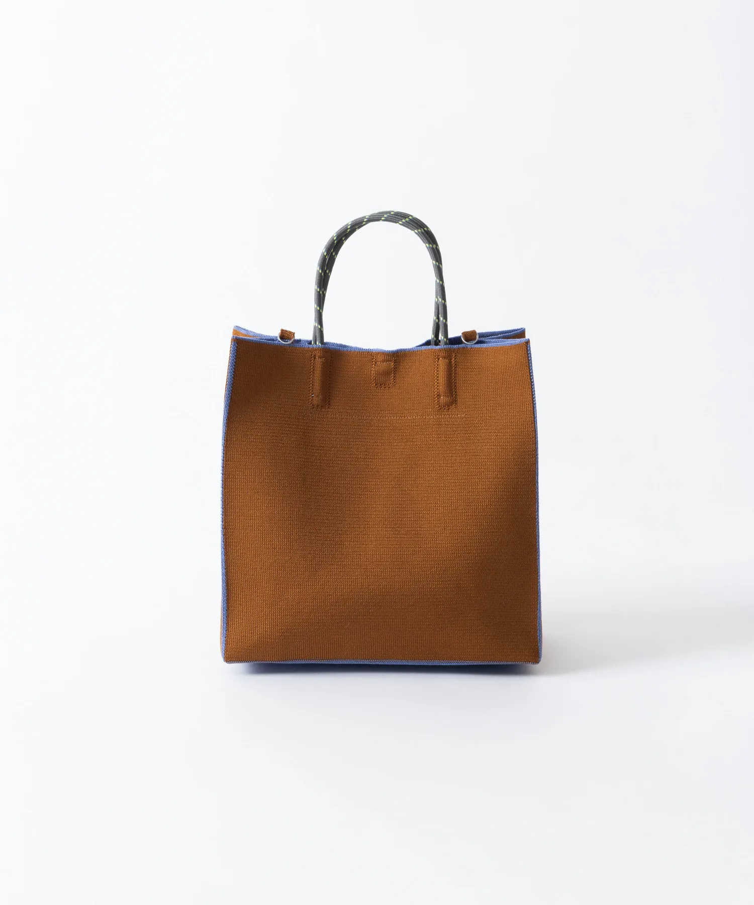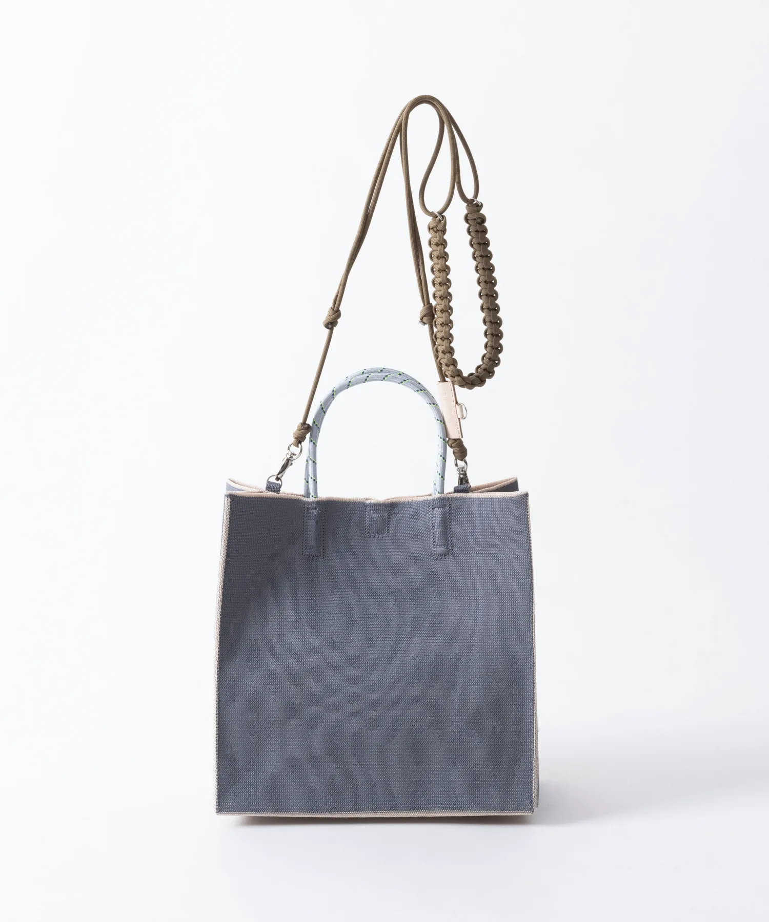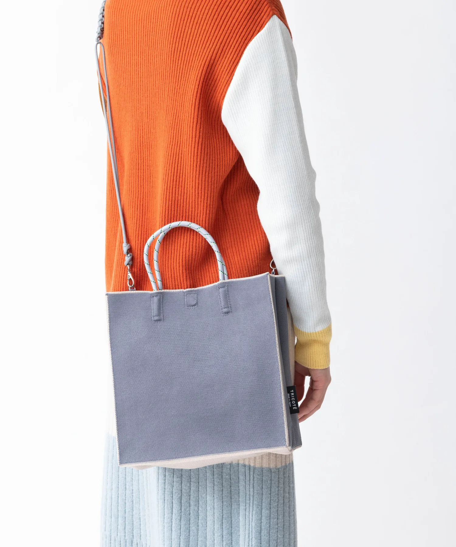 Серия сумок, изготовленных из переработанной полиэстерной пряжи, с экологичным силуэтом, напоминающим бумажный пакет.