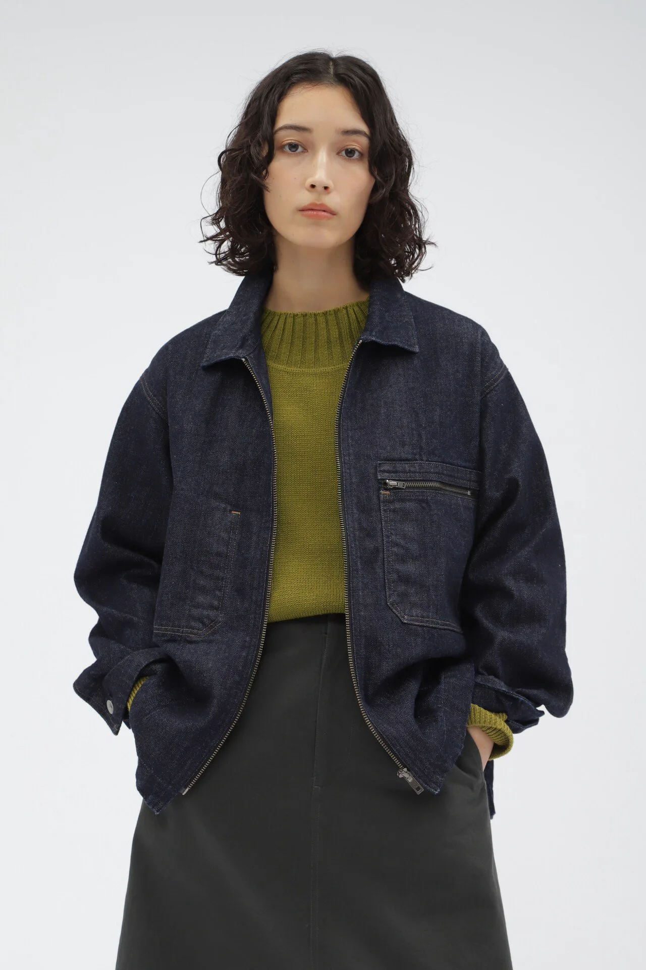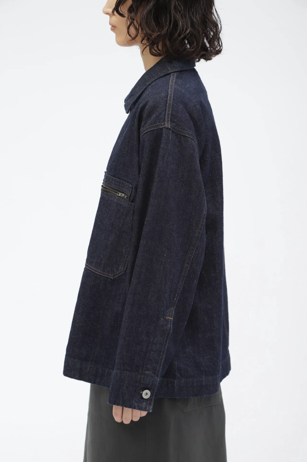 Джинсовая куртка с характерными для MHL брутальными деталями. Она сочетает в себе характер и функциональность, например, нагрудный карман на молнии и держатель для ручки.