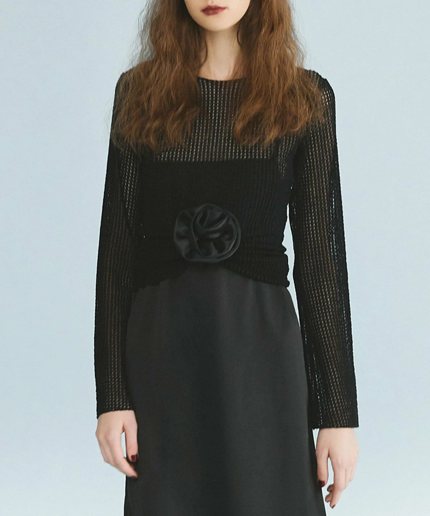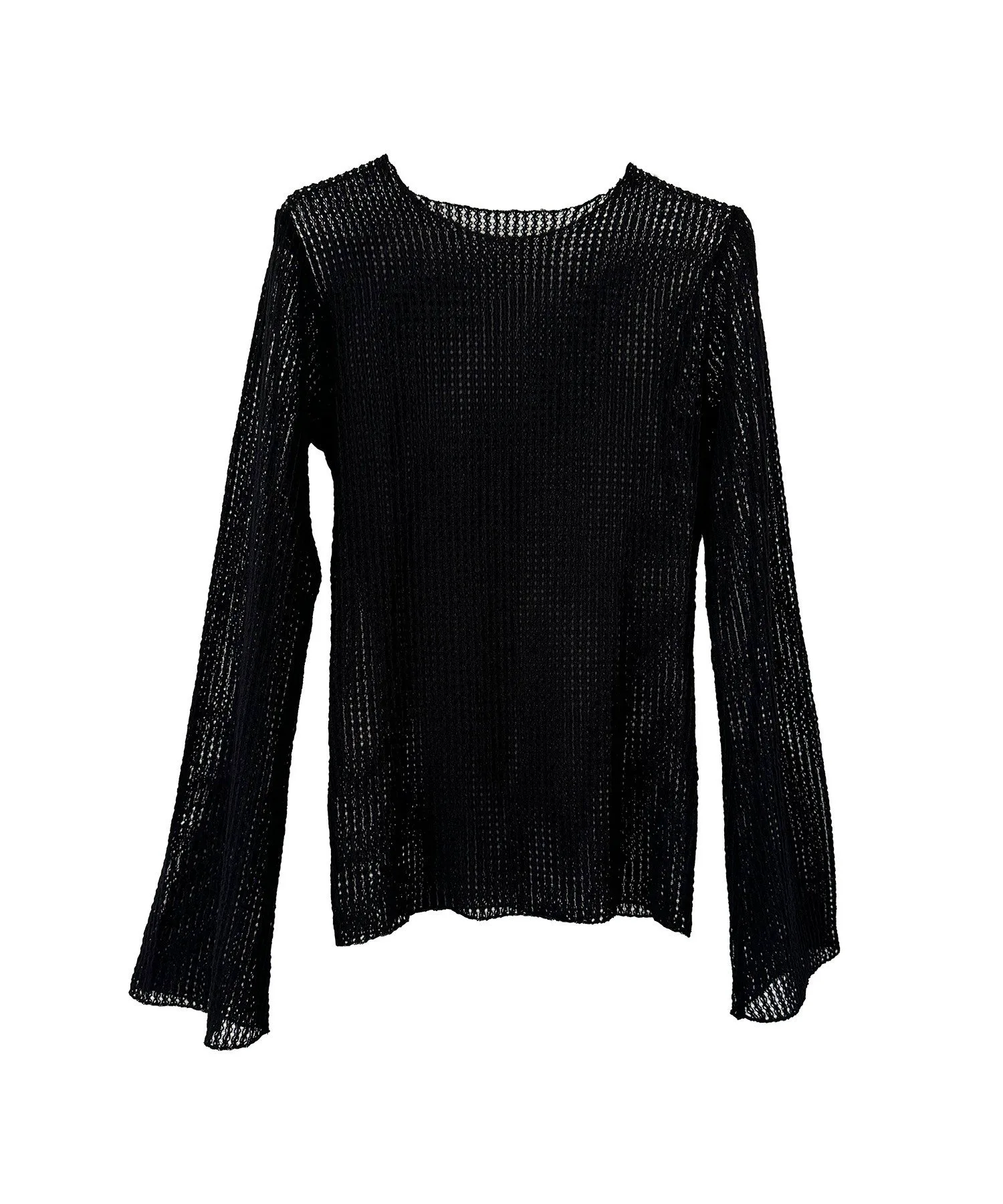 Топ с рукавами-колоколами и облегающим силуэтом, привлекающий внимание.Сетчатый материал придает ему современный вид.Расклешенный дизайн к манжетам добавляет элегантности.Вы можете носить его как самостоятельно, так и в сочетании с другими вещами.Мы рекомендуем сочетать его с кожаной юбкой или облегающей юбкой для создания современного образа.