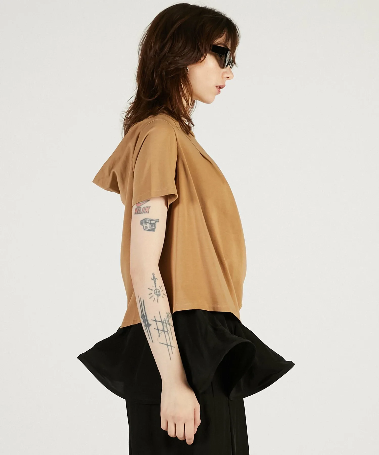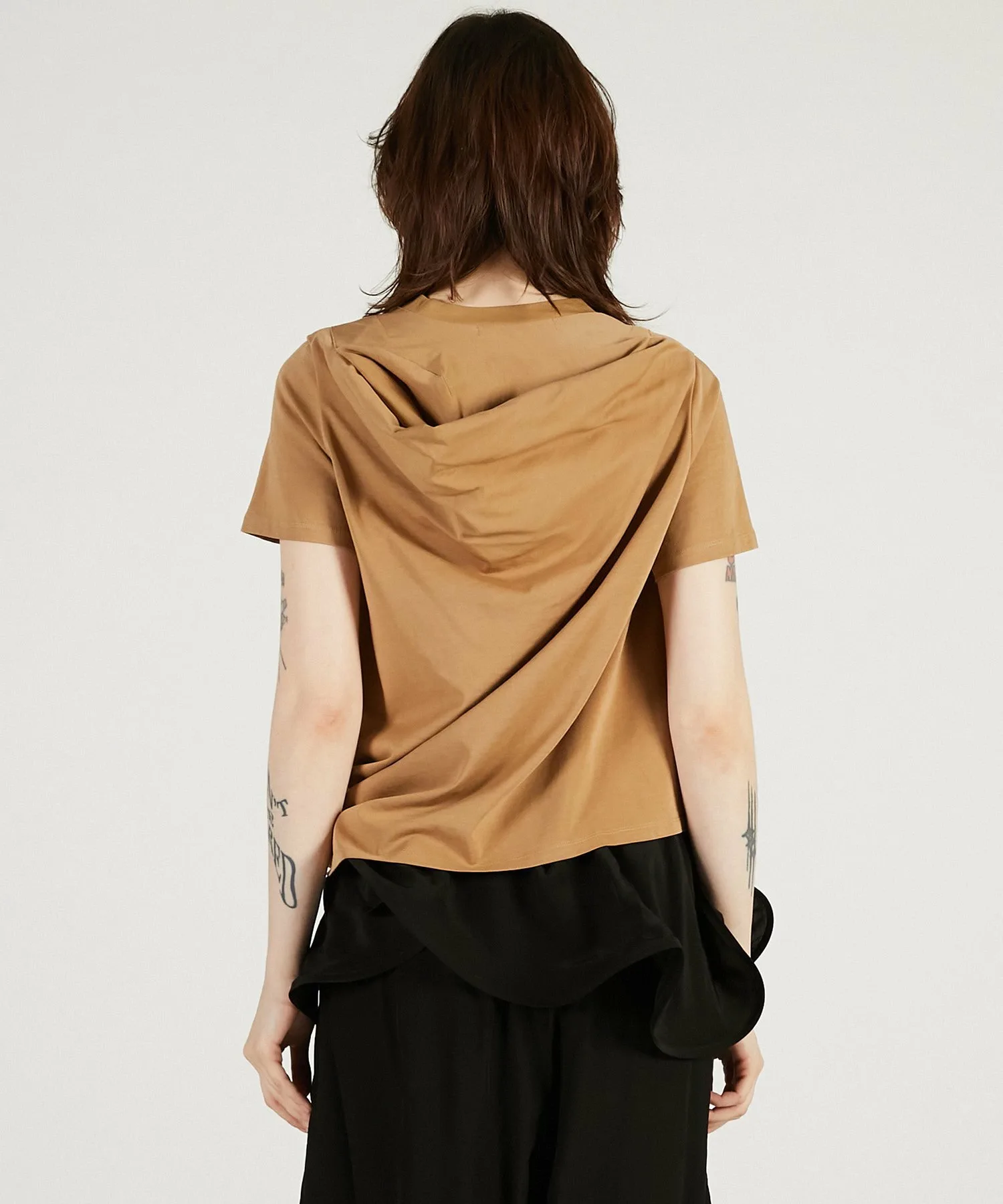 Эффектная короткая футболка с кроем и драпировкой, создающей впечатление капюшона.