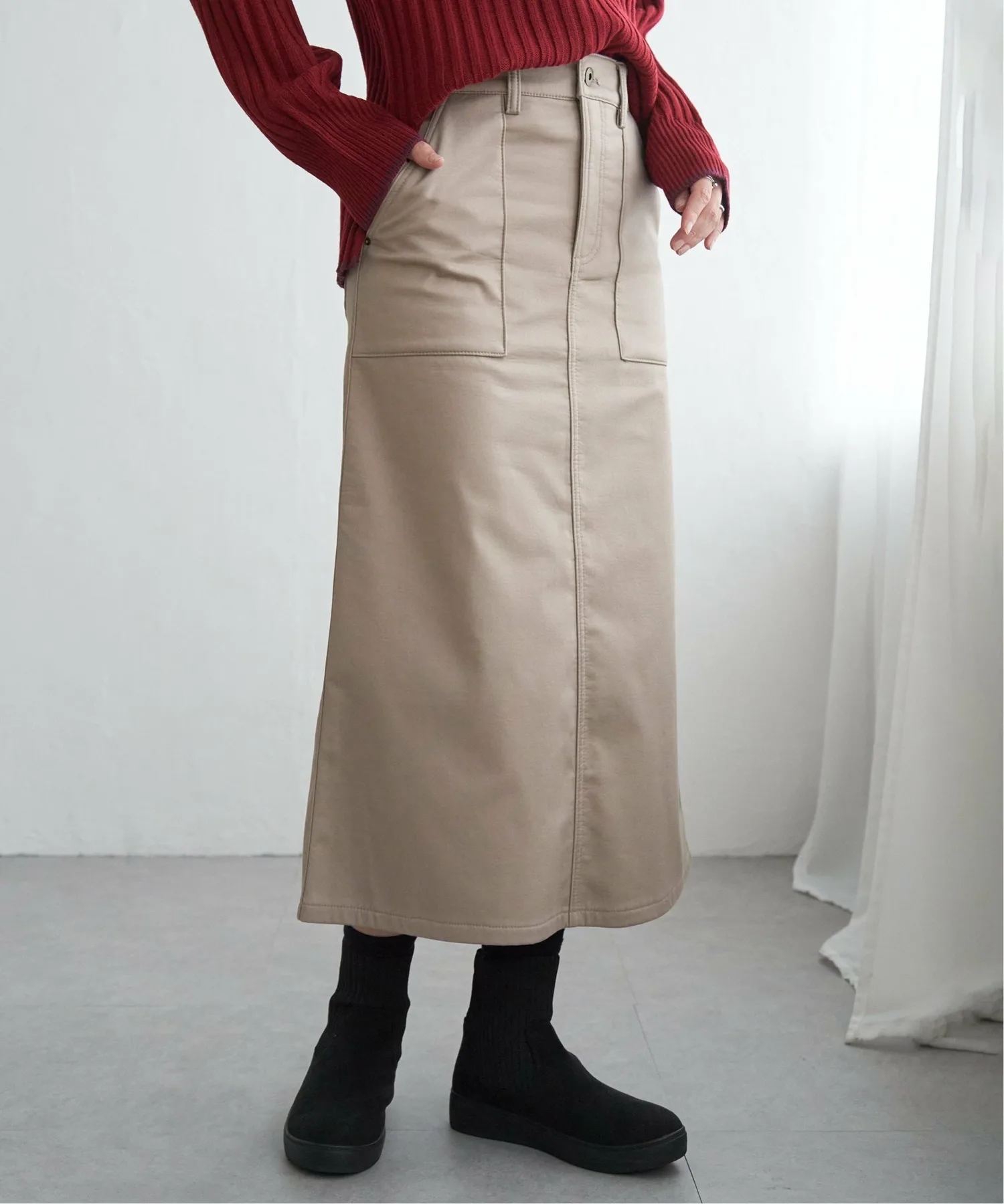 Длинная юбка с простым дизайном карманов в стиле «булочка», создающая слегка А-образный силуэт.