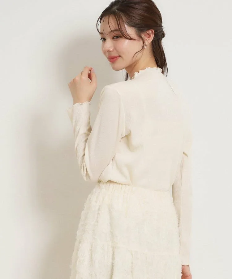 Слегка прозрачный топ из махровой ткани с милыми оборками на воротнике и манжетах.