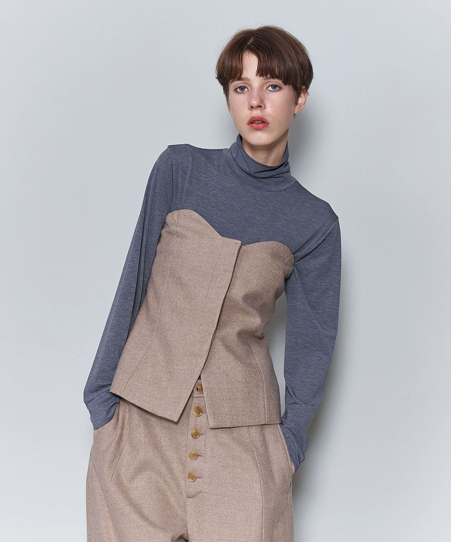 Этот бюстье отличается оригинальным кроем в области груди и выполнен из фактурной, мраморной ткани, сшитой из пряжи TOP.