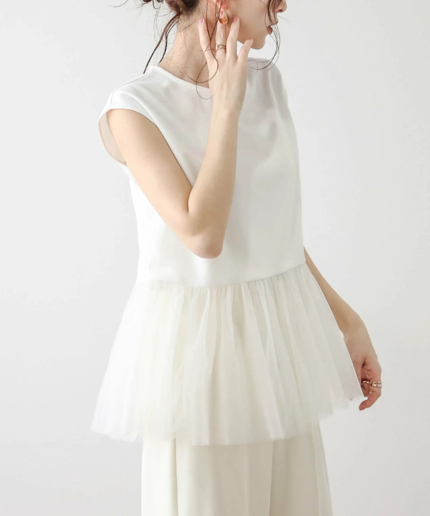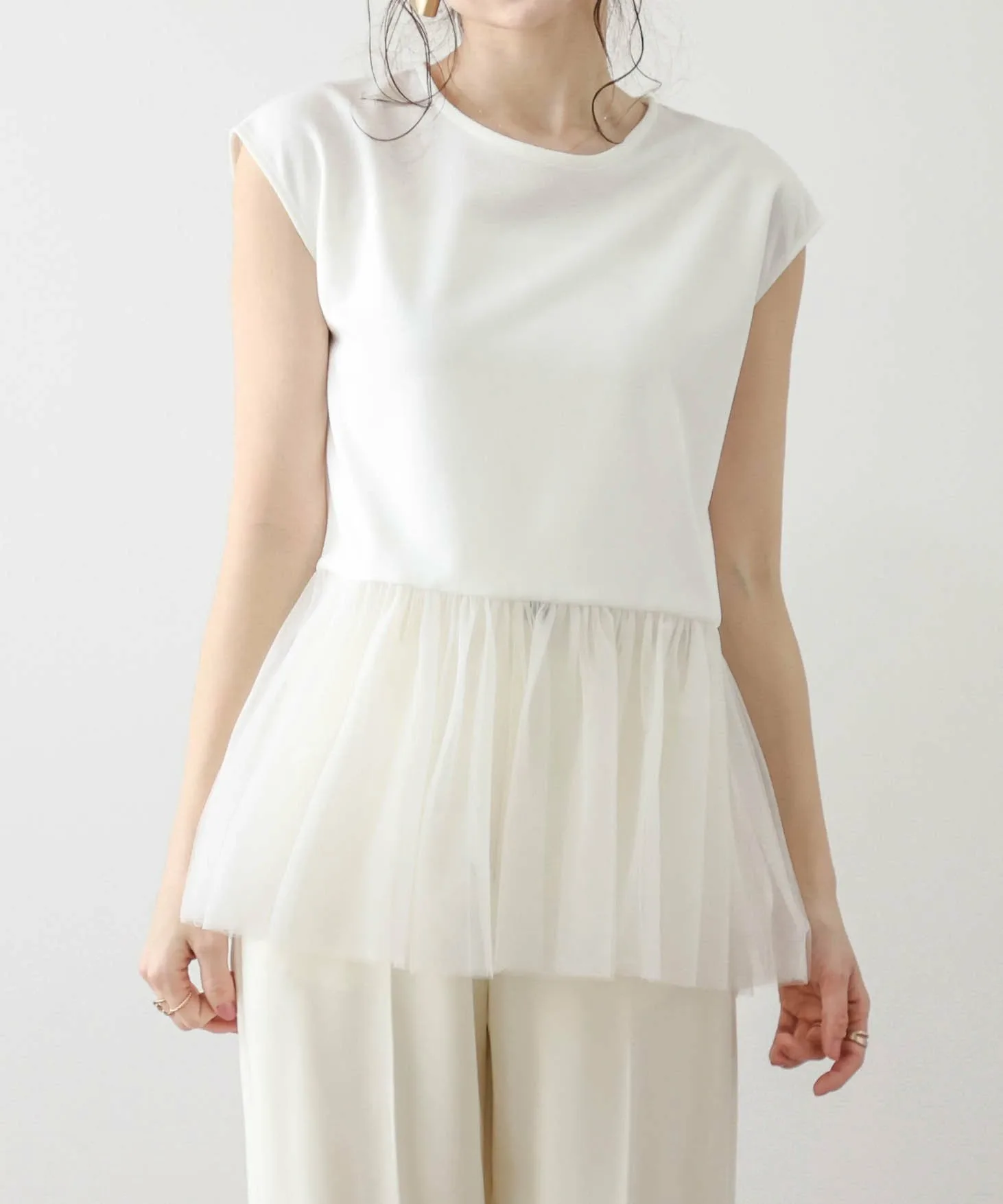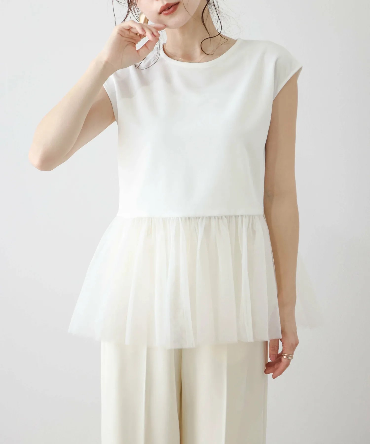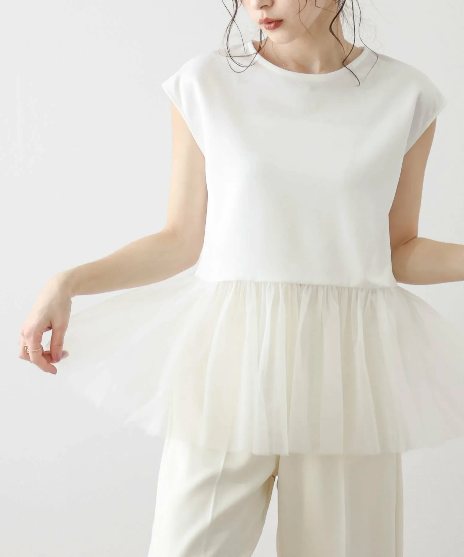 Женственный топ с привлекательной мягкой тюлевой баской.