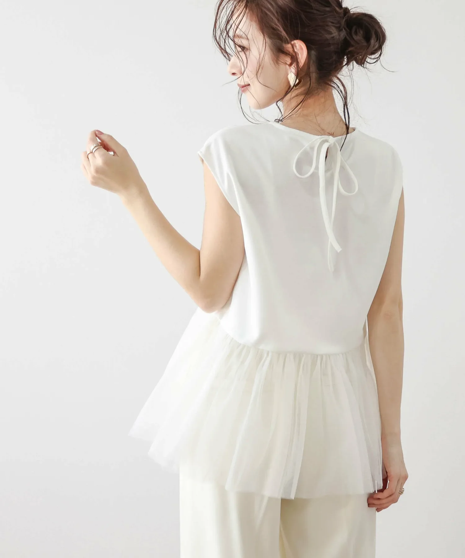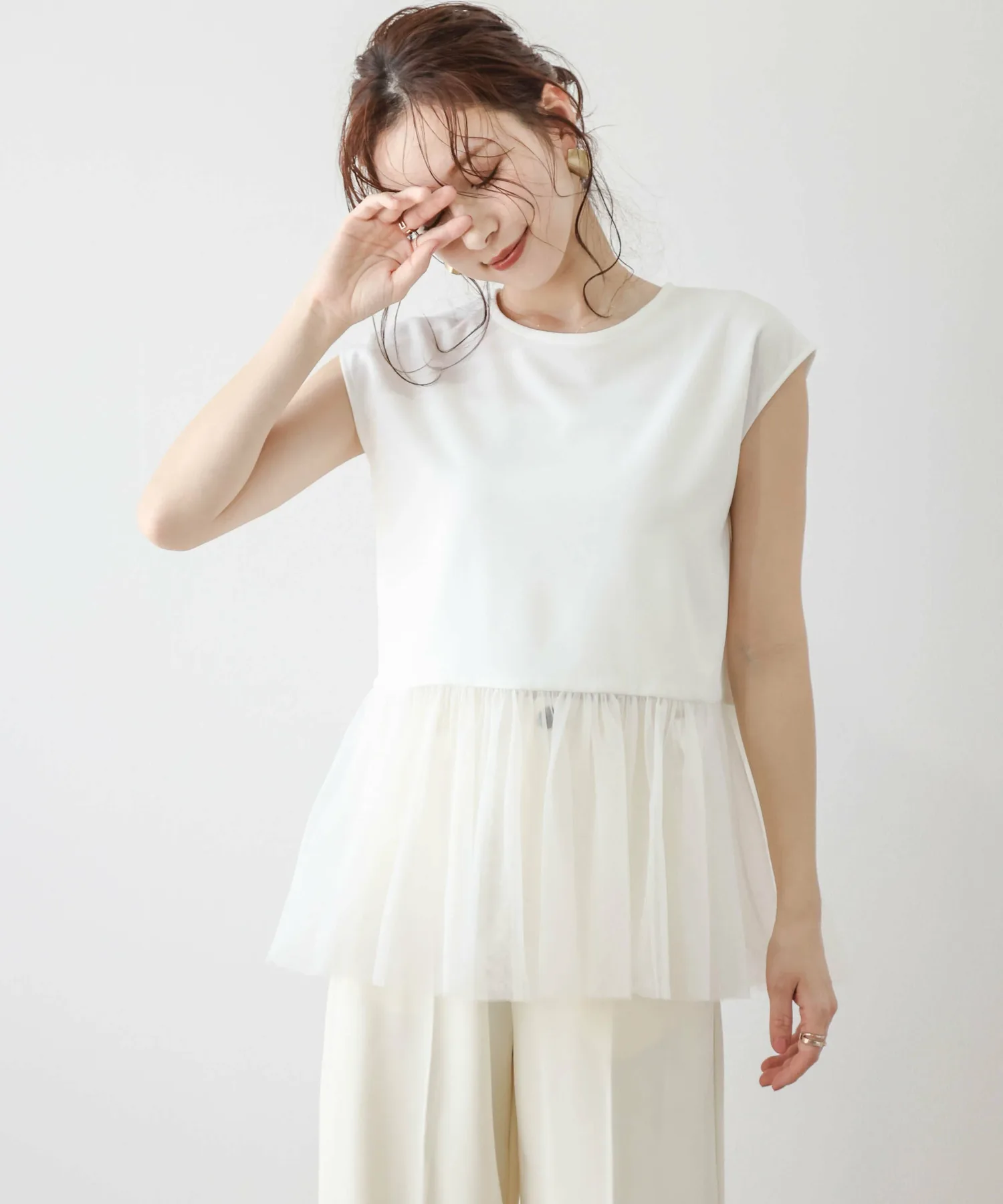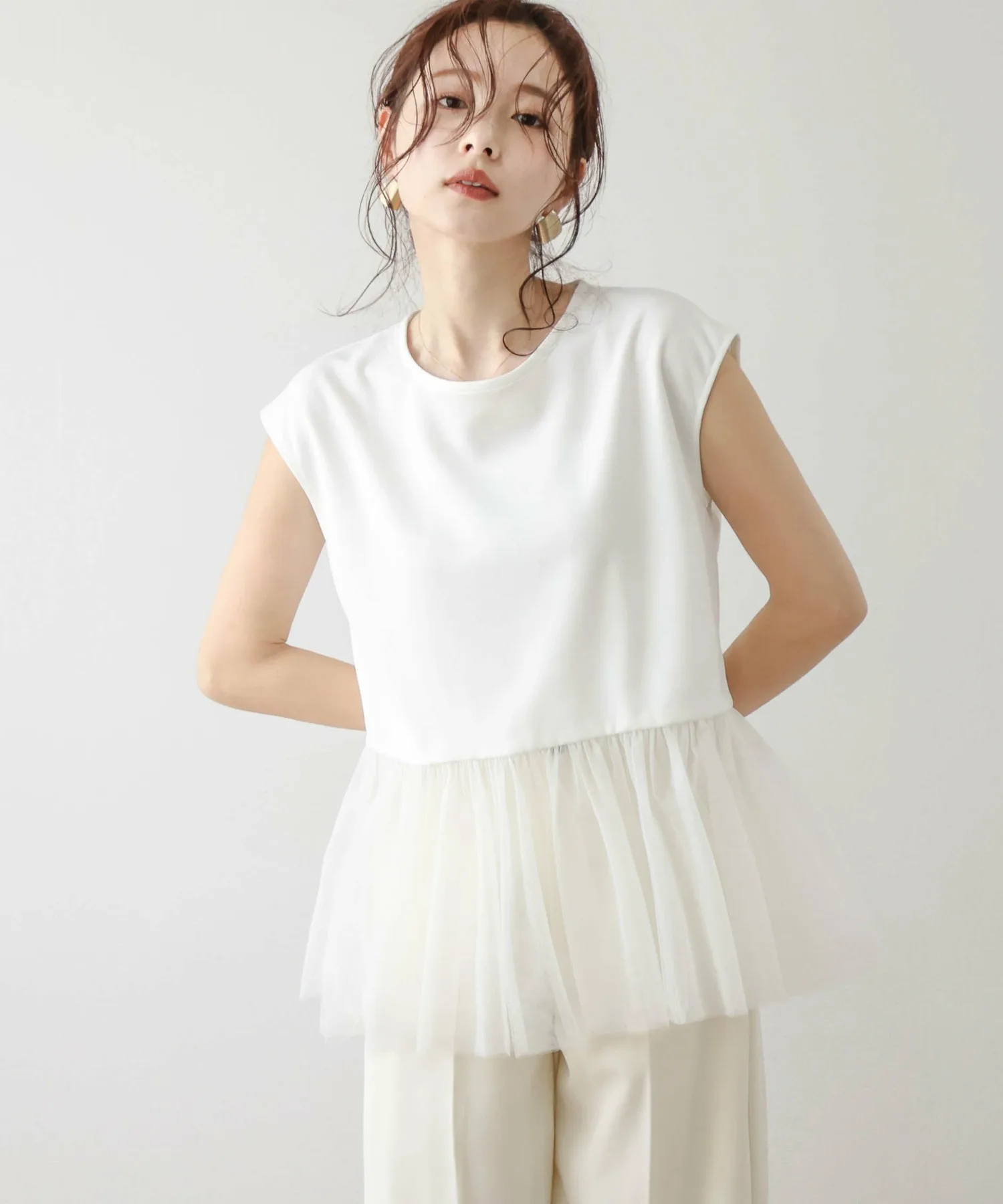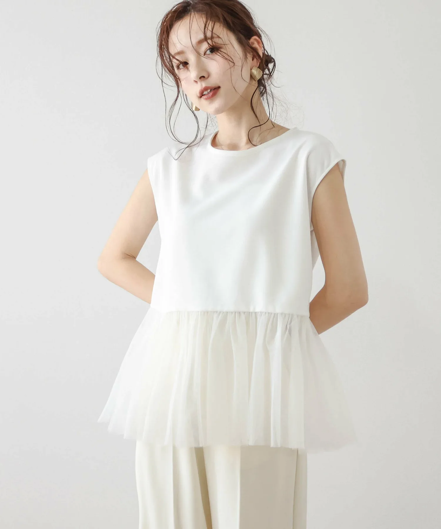 Женственный топ с привлекательной мягкой тюлевой баской.