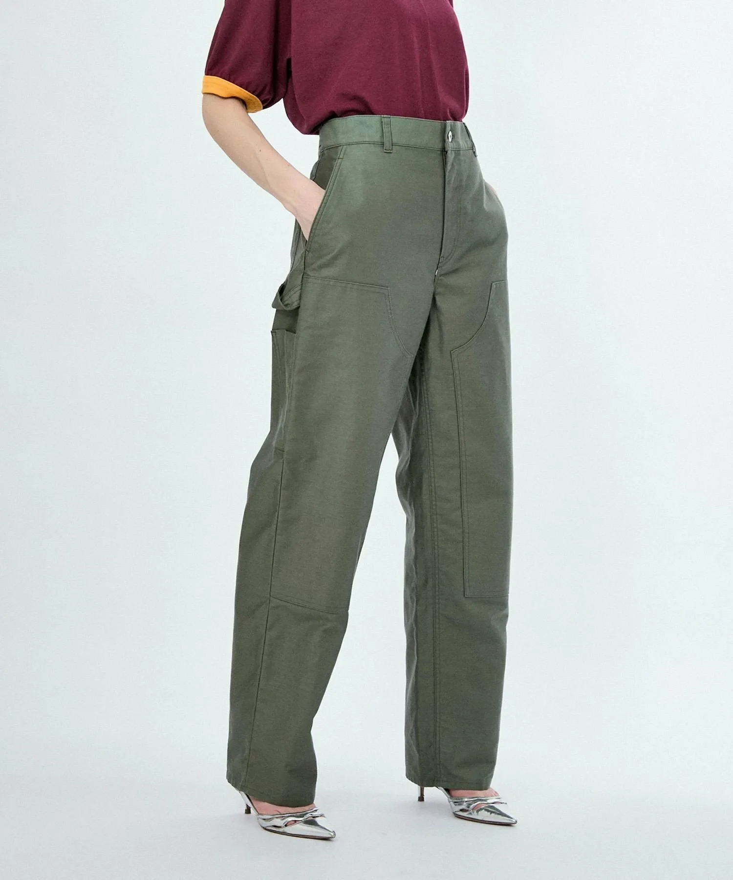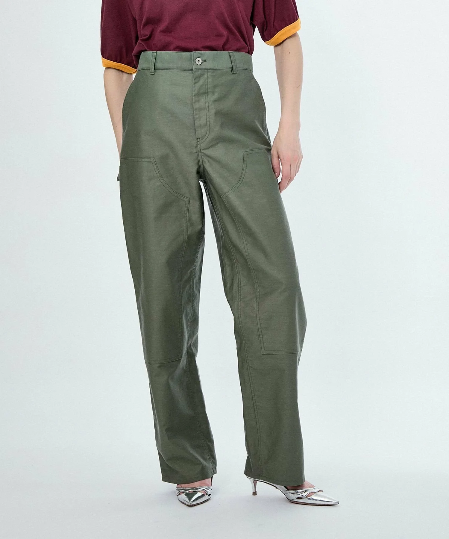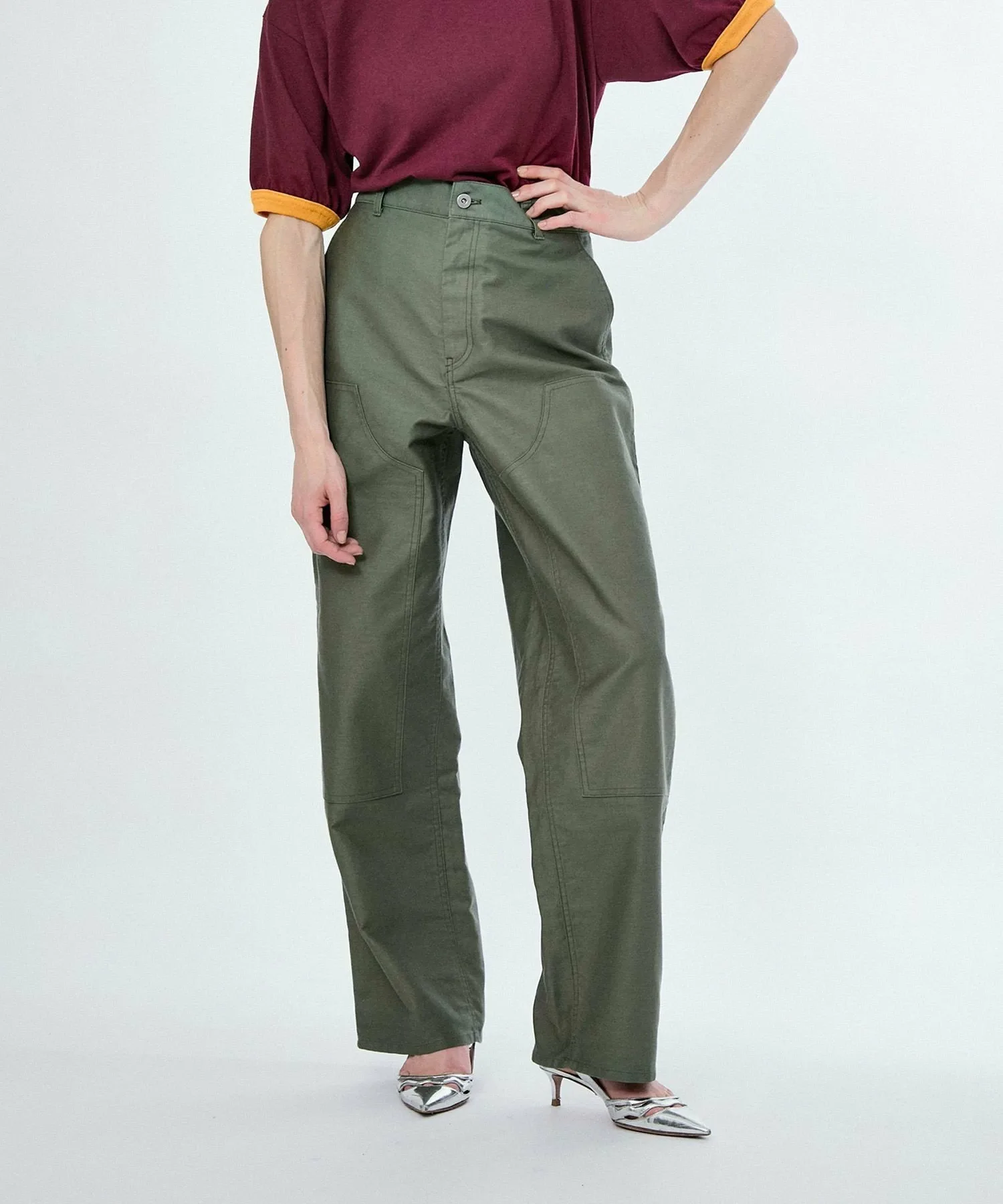 Главная изюминка – это нашивка! Эти брюки прямого кроя в стиле малярных.Изготовленные из винтажного хлопкового атласа, они предварительно выстираны для создания уникального, мятого и идеально подходящего грубого вида.