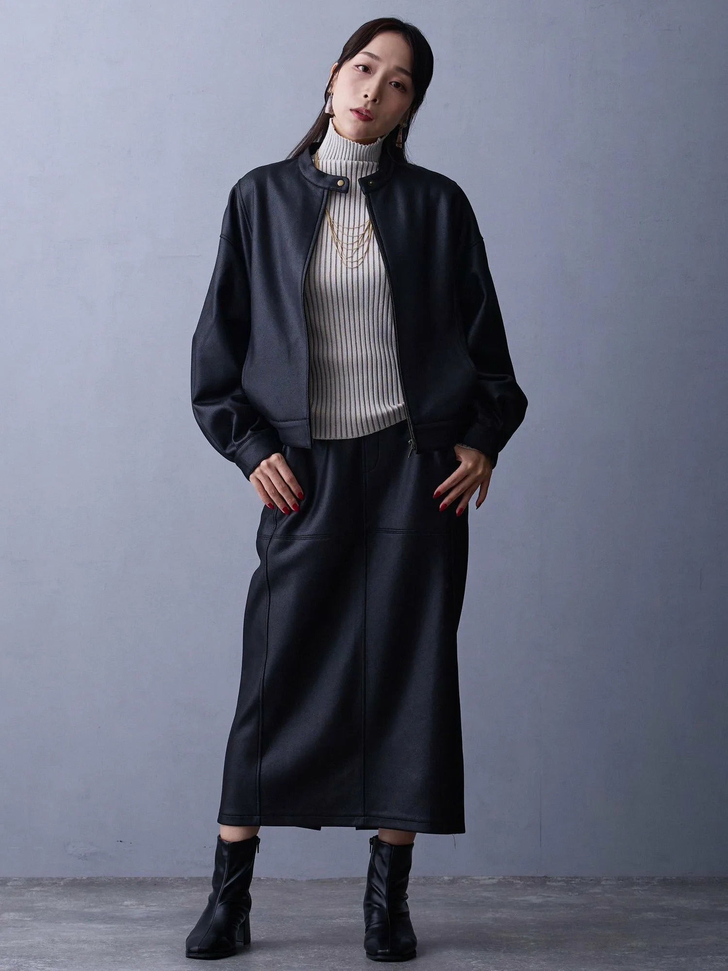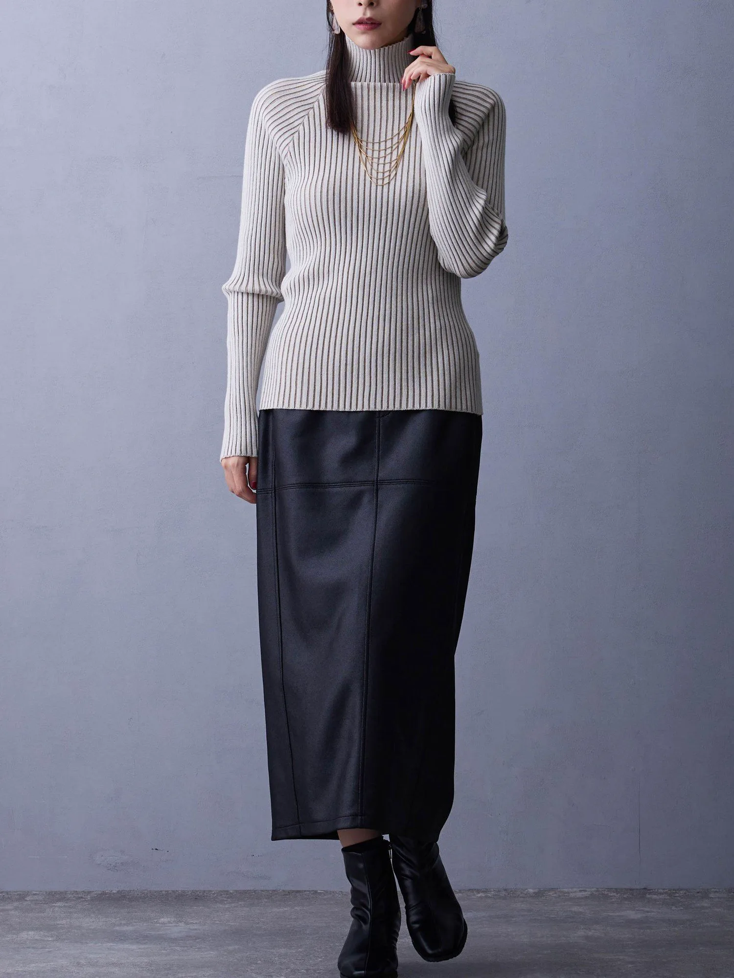 Общий силуэт облегающей юбки визуально удлиняется, создавая эффект стройности, и выглядит сбалансированно в сочетании с широкими брюками или расклешенной юбкой, создавая аккуратный и элегантный образ. даже при ношении с верхней одеждой.