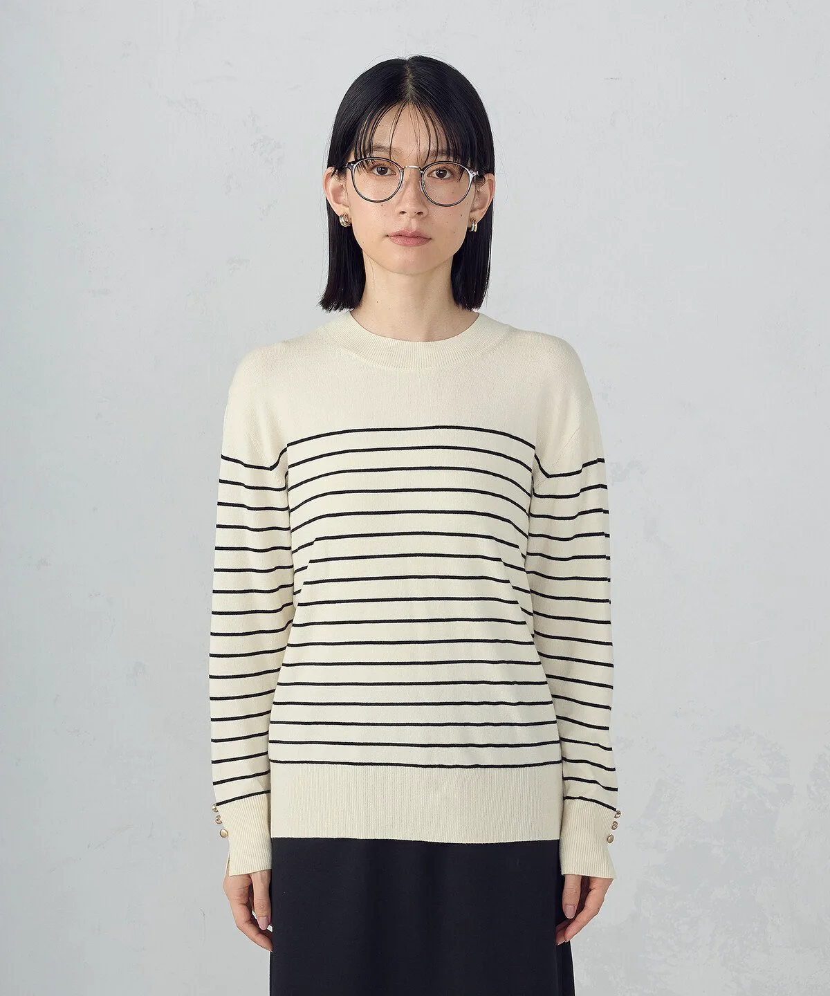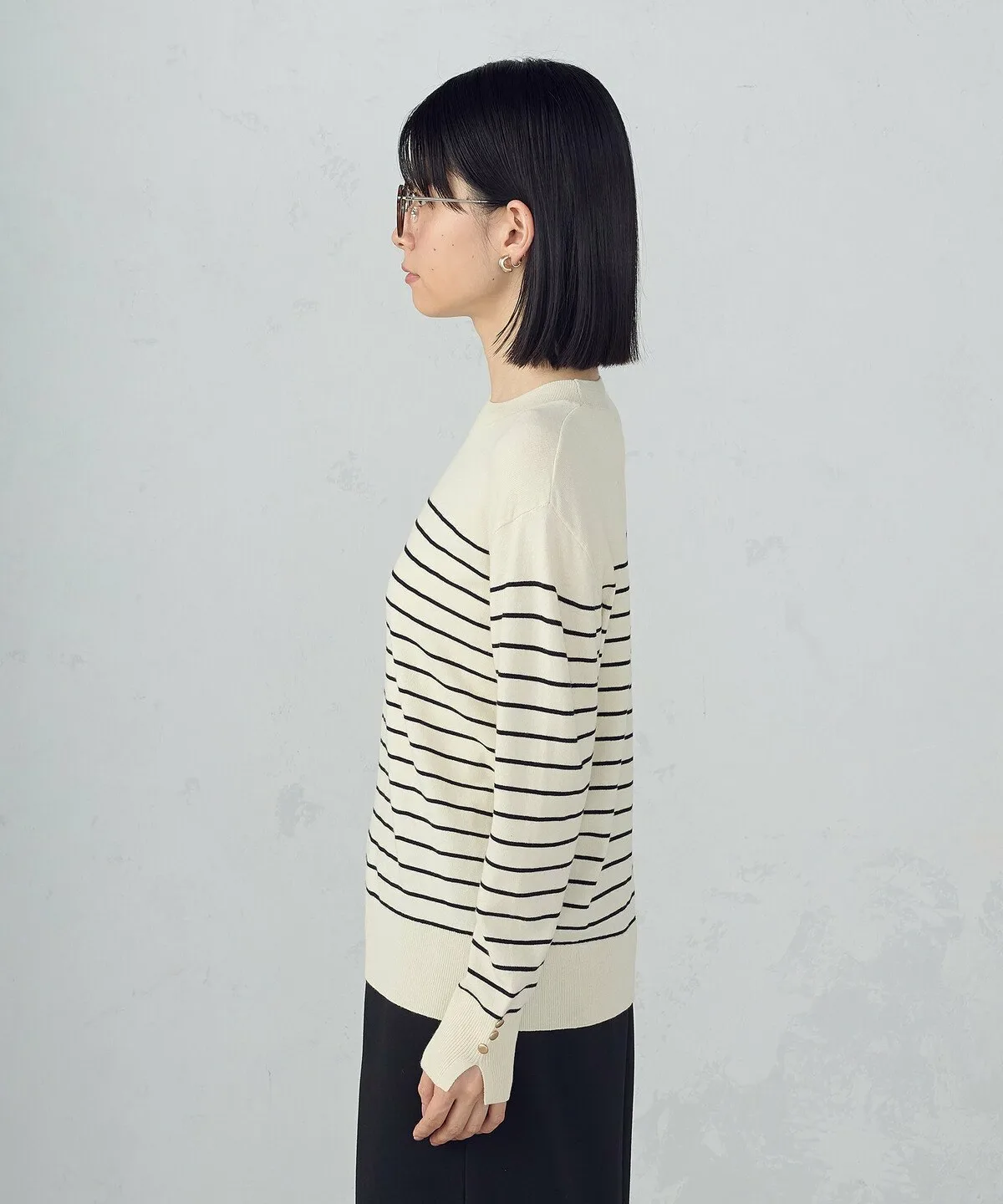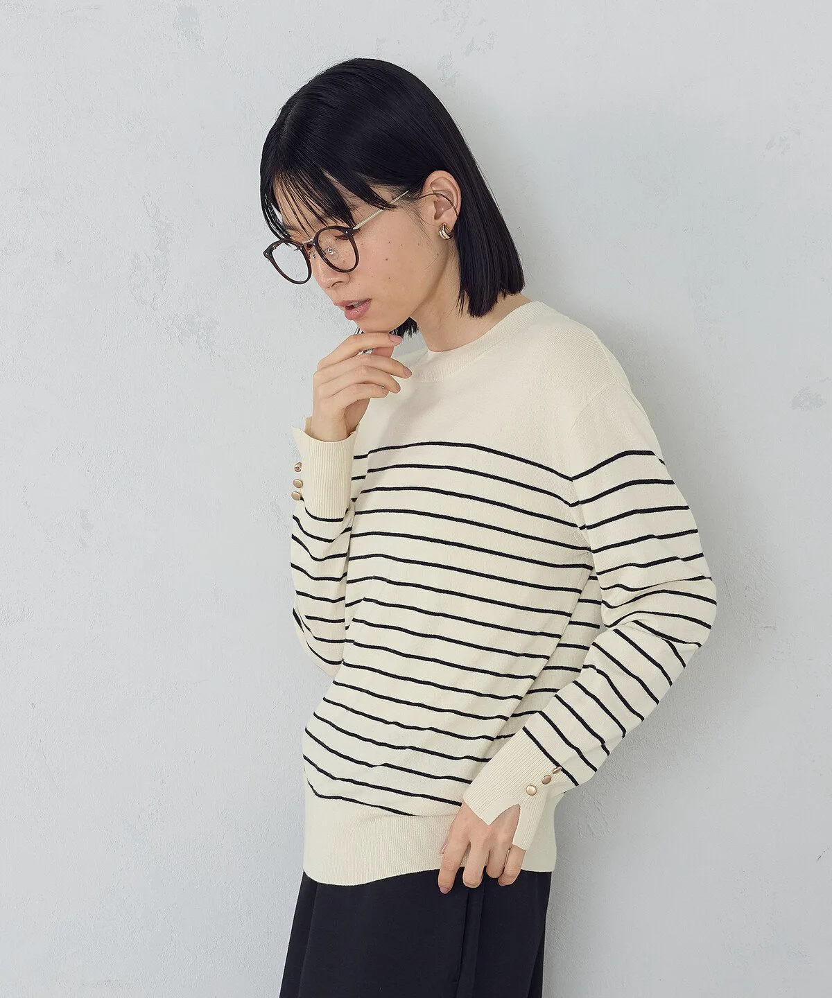 Базовый трикотаж в полоску с круглым вырезом и пуговицами на рукавах в качестве акцента.