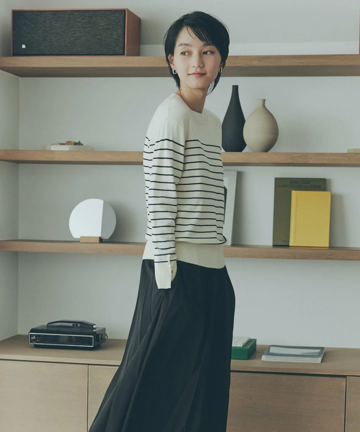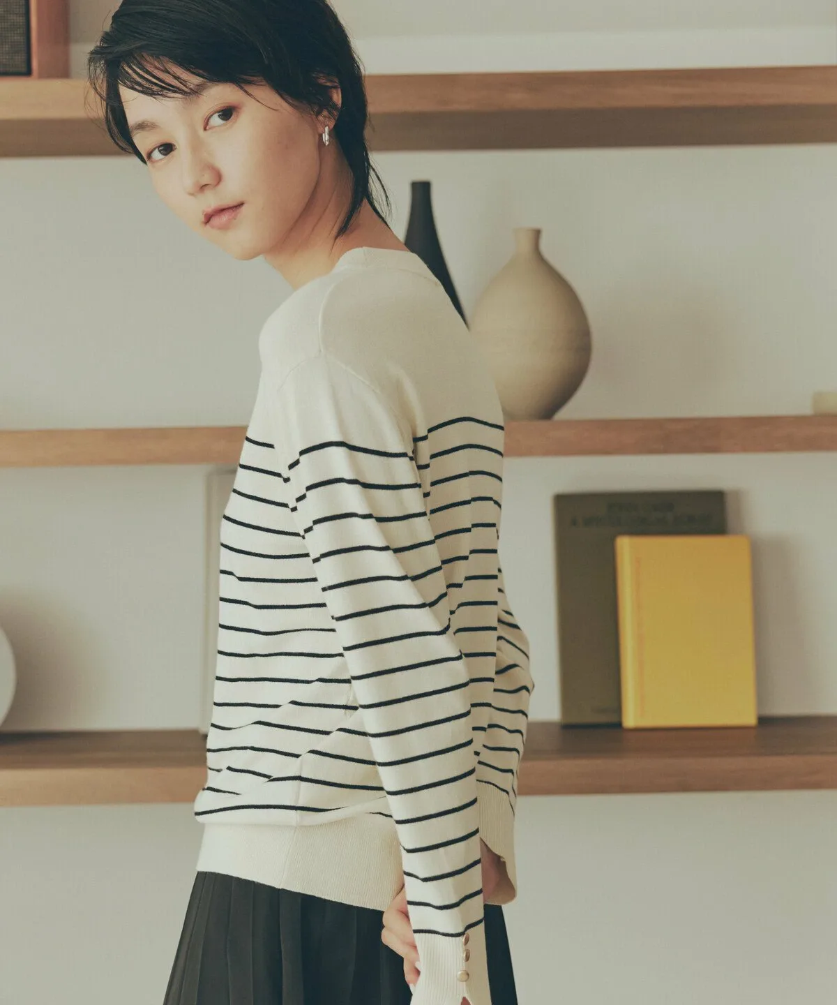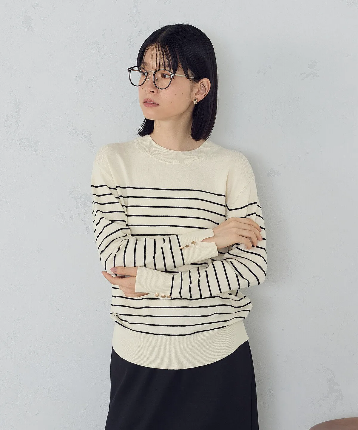 Базовый трикотаж в полоску с круглым вырезом и пуговицами на рукавах в качестве акцента.