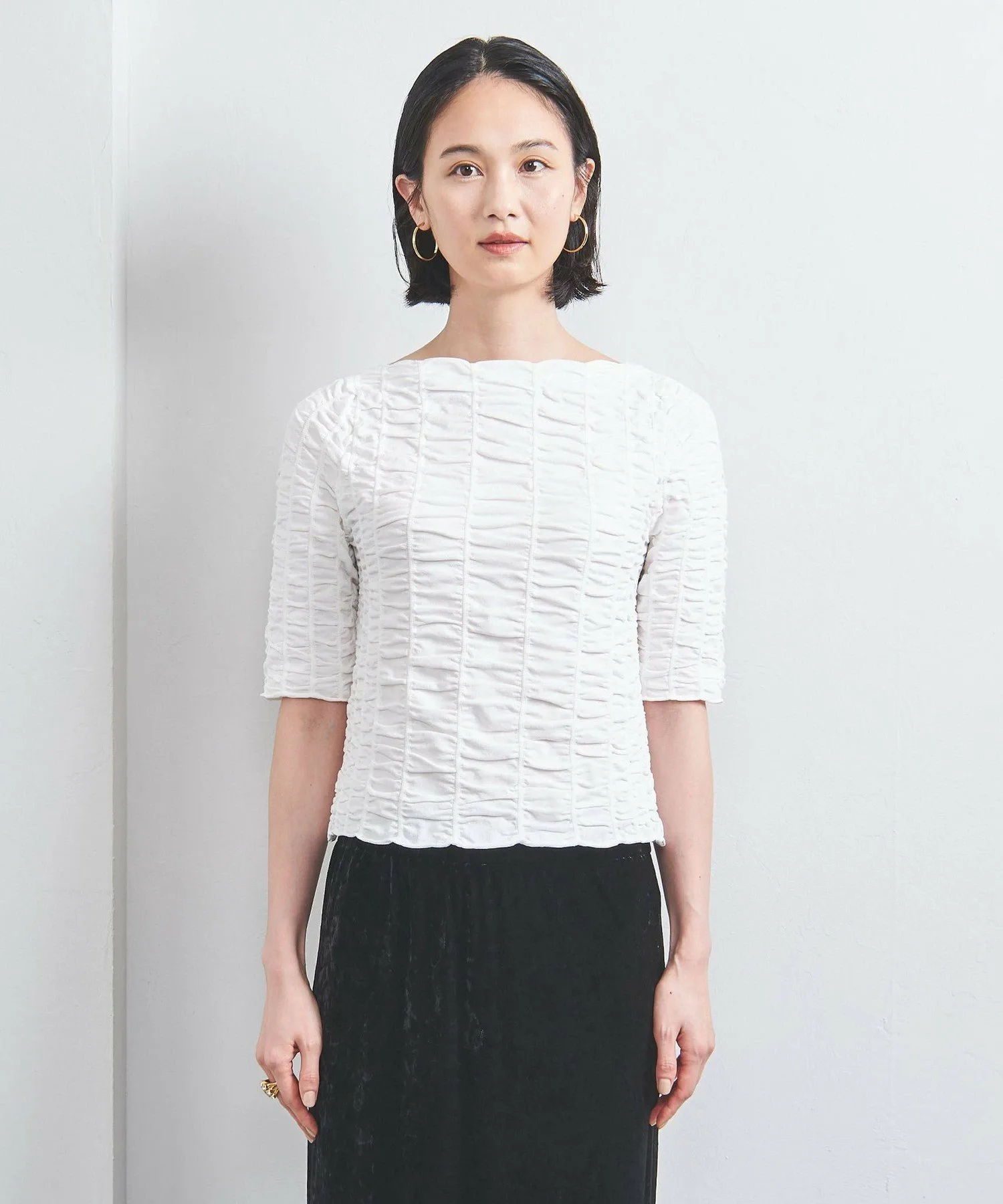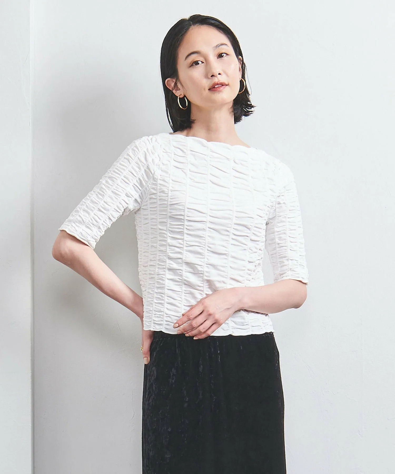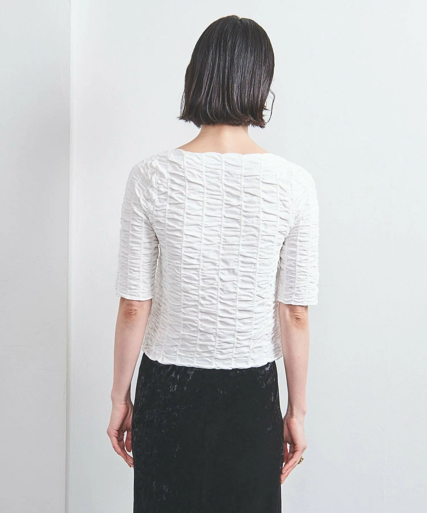 Простой вырез-лодочка и изысканный рукав три четверти подчеркивают эффект затенения.