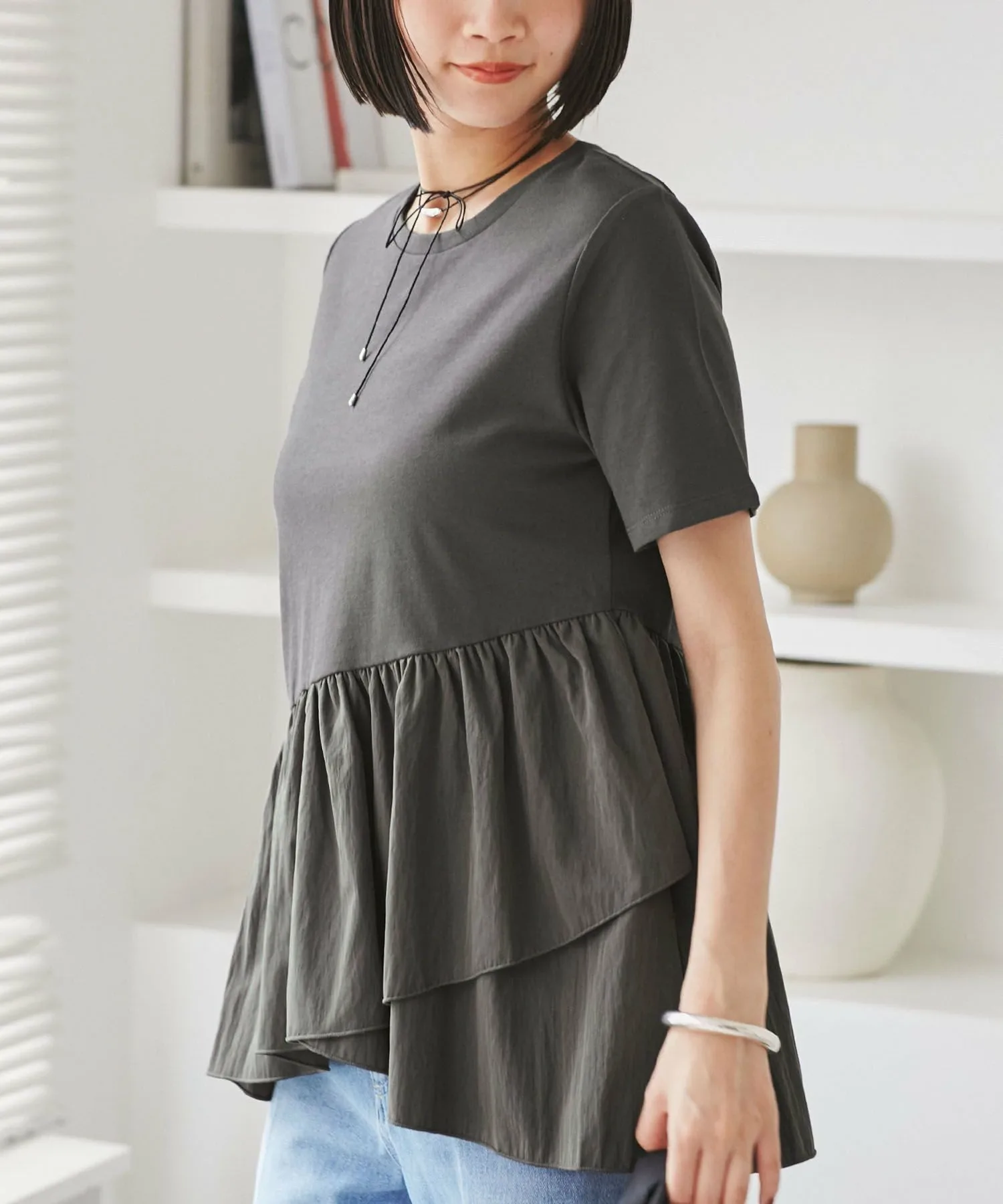 ・В жаркие летние утра, когда вы не можете решить, что надеть, эта футболка с баской и складками дополнит ваш образ одним махом, став беспроигрышным вариантом!