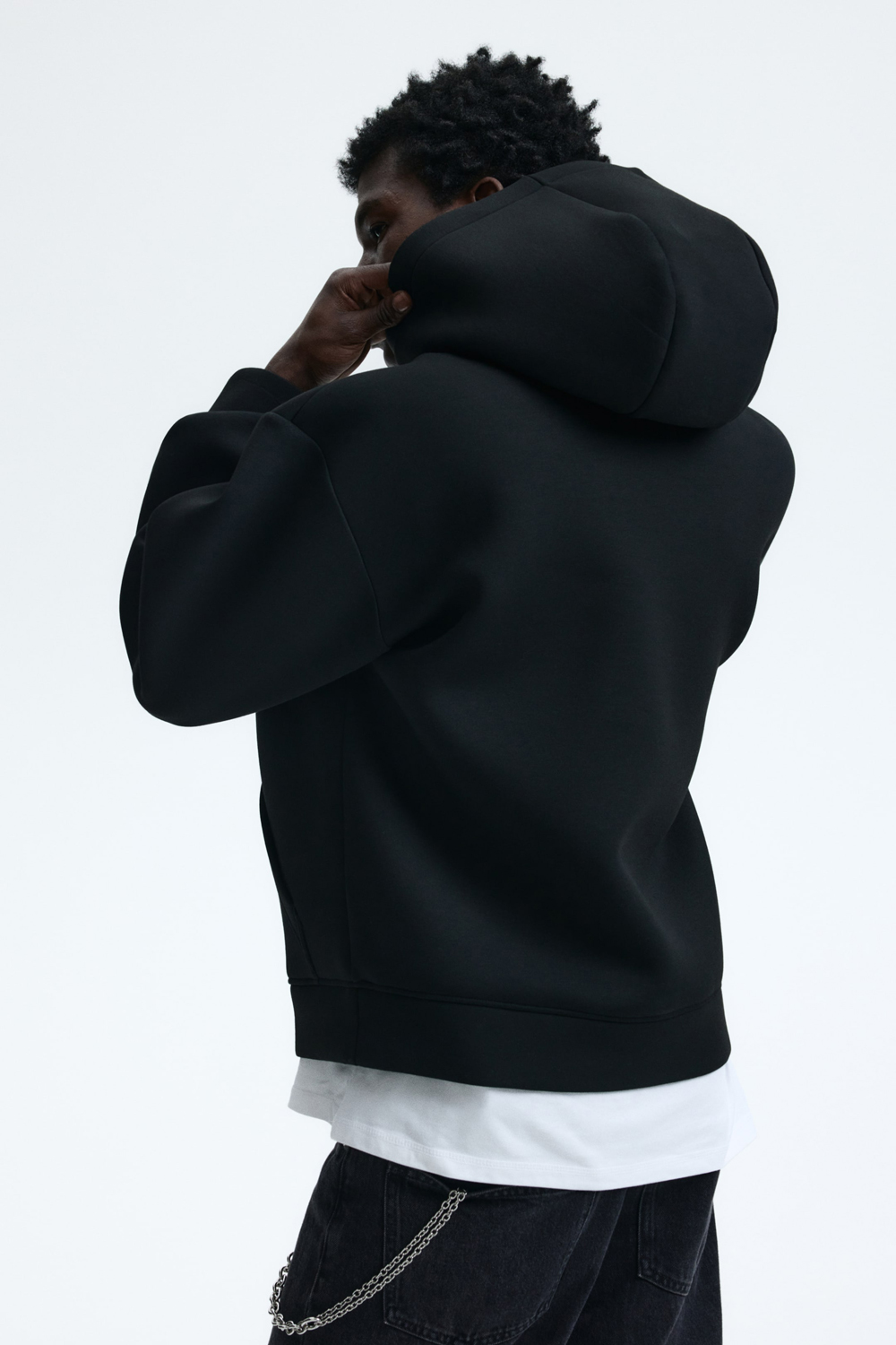 Эта худи из инновационного материала scuba перевернет ваше представление о повседневном комфорте. Упругая, плотная ткань с эффектом памяти формы держит силуэт как настоящий скульптор, создавая четкие, архитектурные линии. Классический черный цвет делает эту модель невероятно универсальной — она легко впишется в любой гардероб и станет его главной звездой. Свободный, но не объемный крой создает актуальный современный силуэт, который выглядит стильно и дорого.