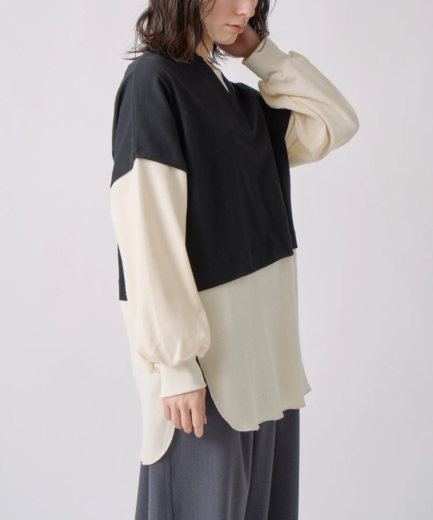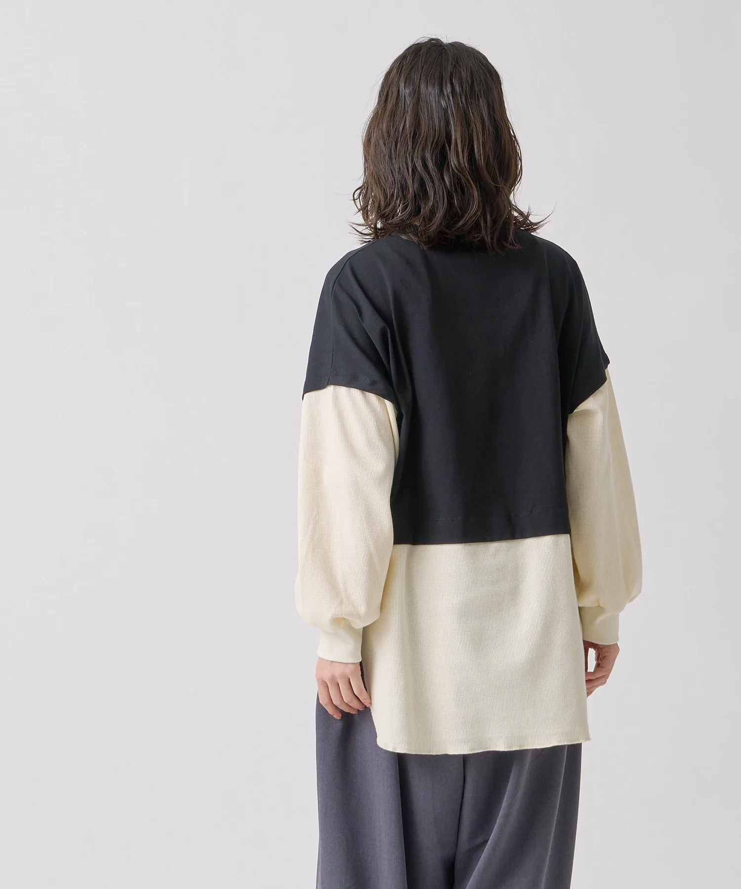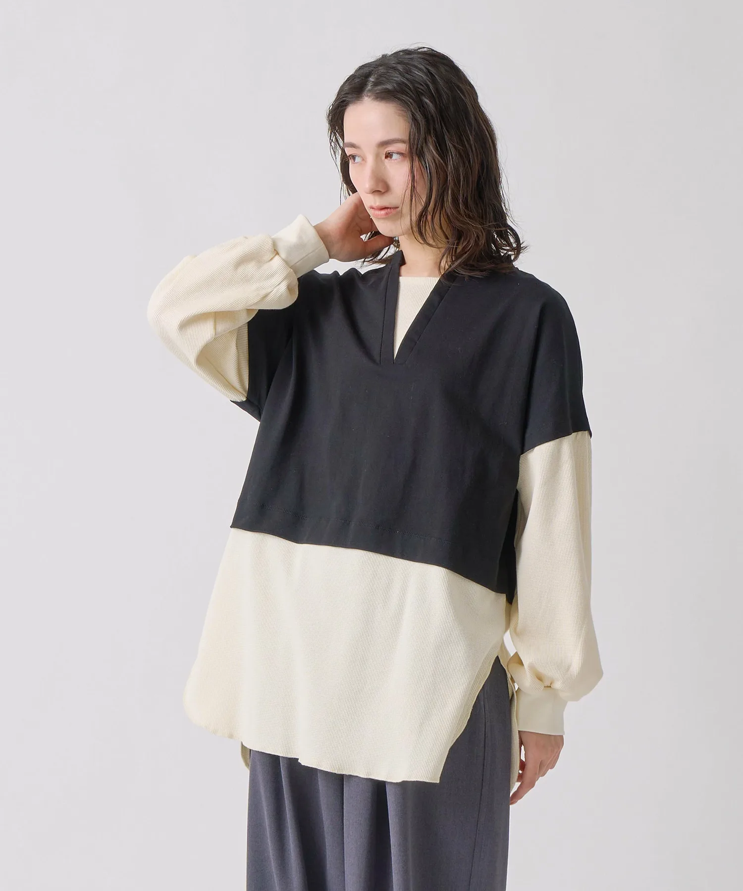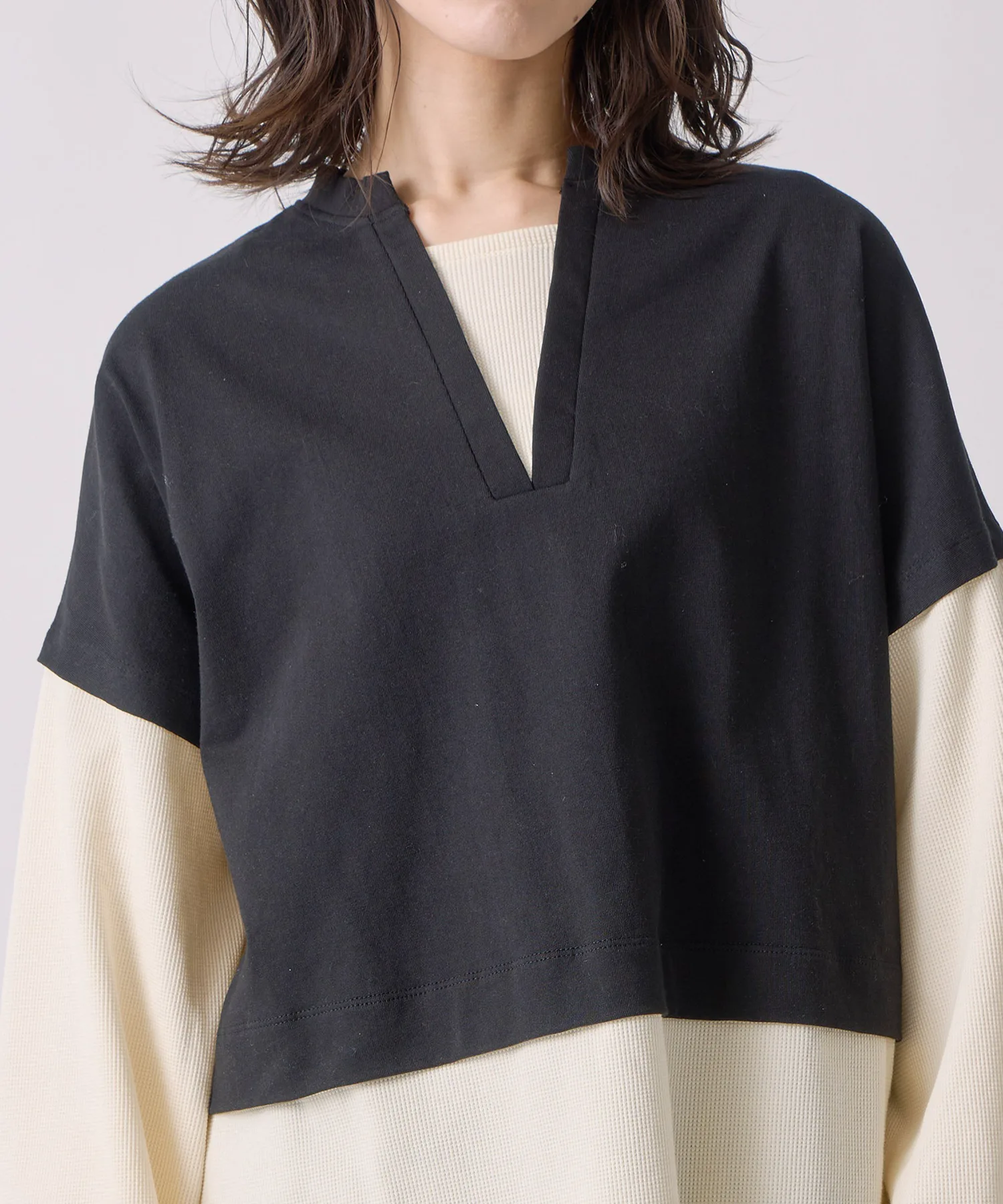 Трикотажный жилет с глубоким V-образным вырезом, надетый поверх длинной термофутболки с вырезом-лодочкой.