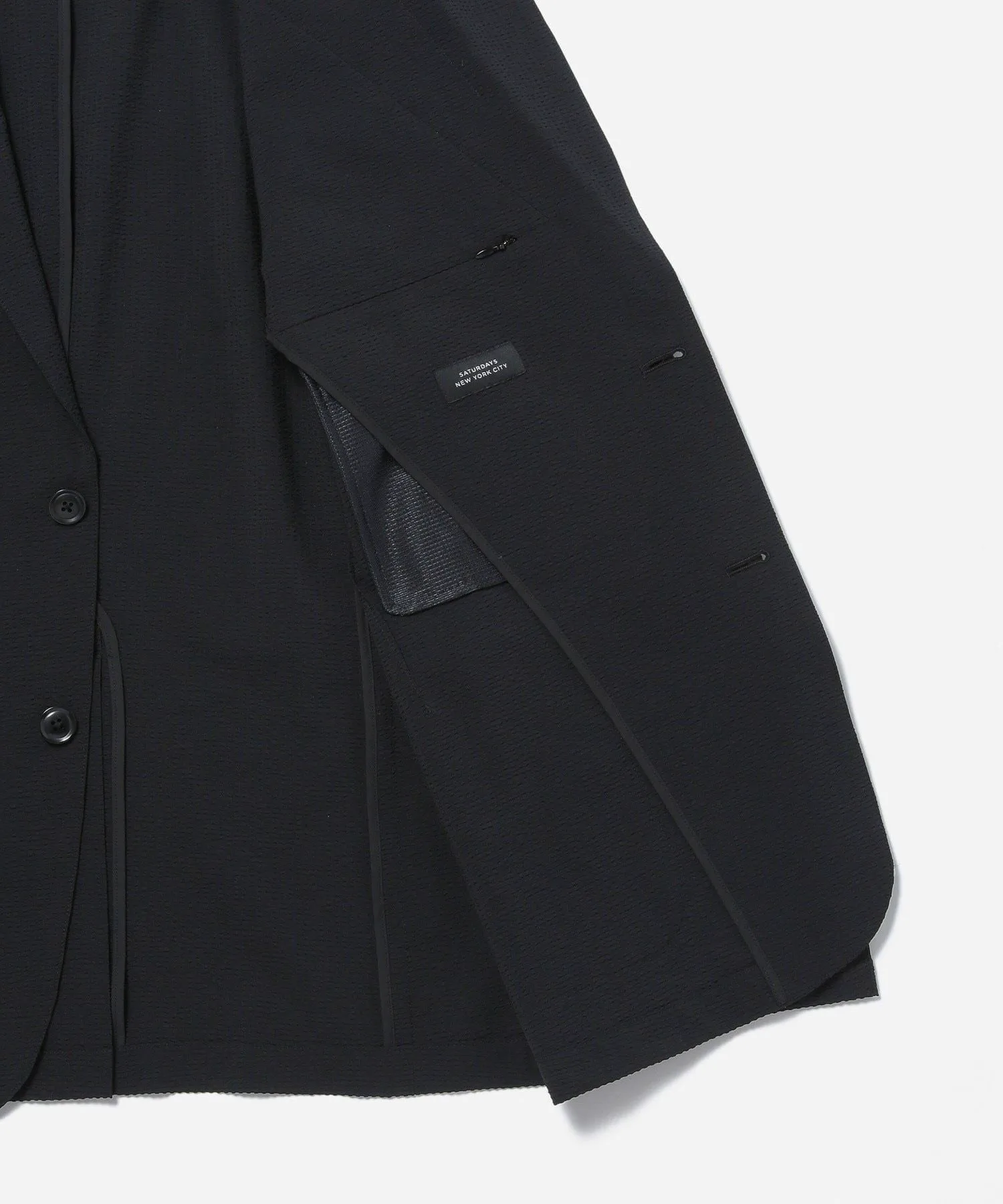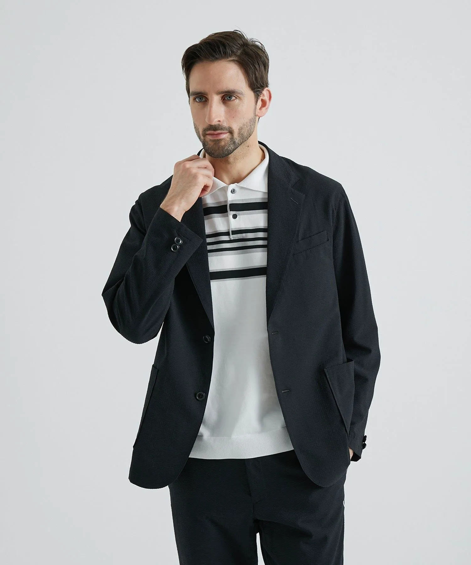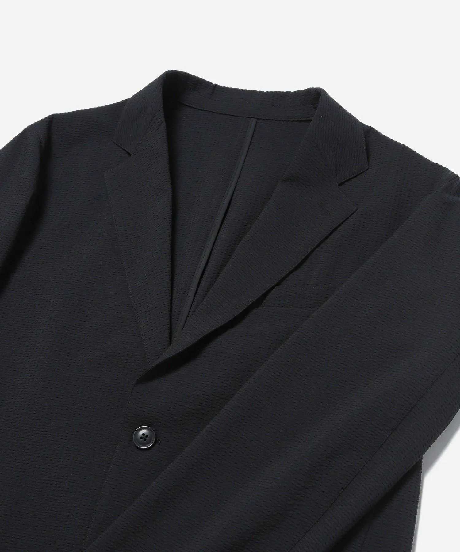 Куртка из ткани сирсакер. Она легкая и удобная в ношении, а также сохраняет прохладу даже при накидывании на руку.