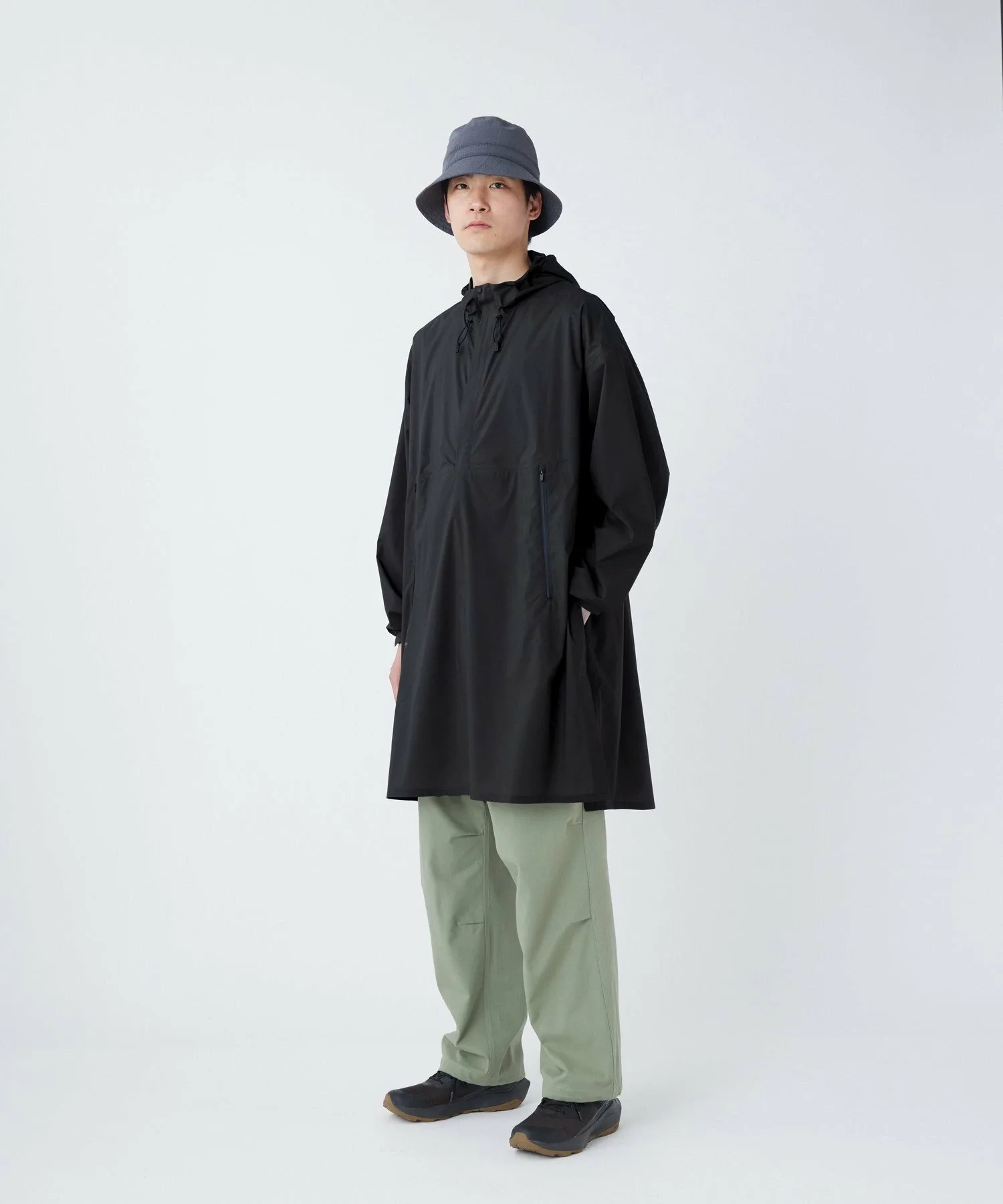 Капюшон имеет встроенный регулятор, позволяющий регулировать его по форме лица. Регулировочная часть разработана таким образом, чтобы не соприкасаться напрямую с кожей, что позволяет регулировать посадку. По бокам расположены большие прорези на пуговицах, что облегчает ходьбу и позволяет легко достать руки из карманов брюк.