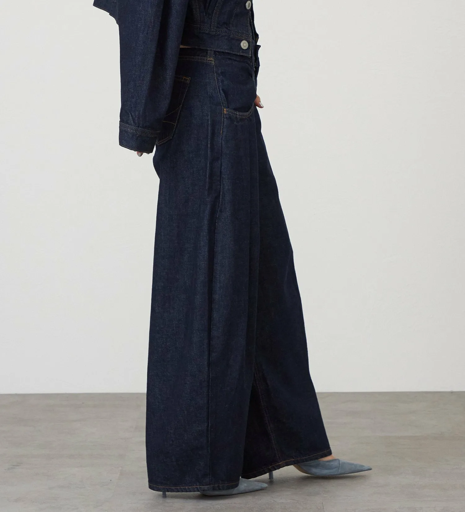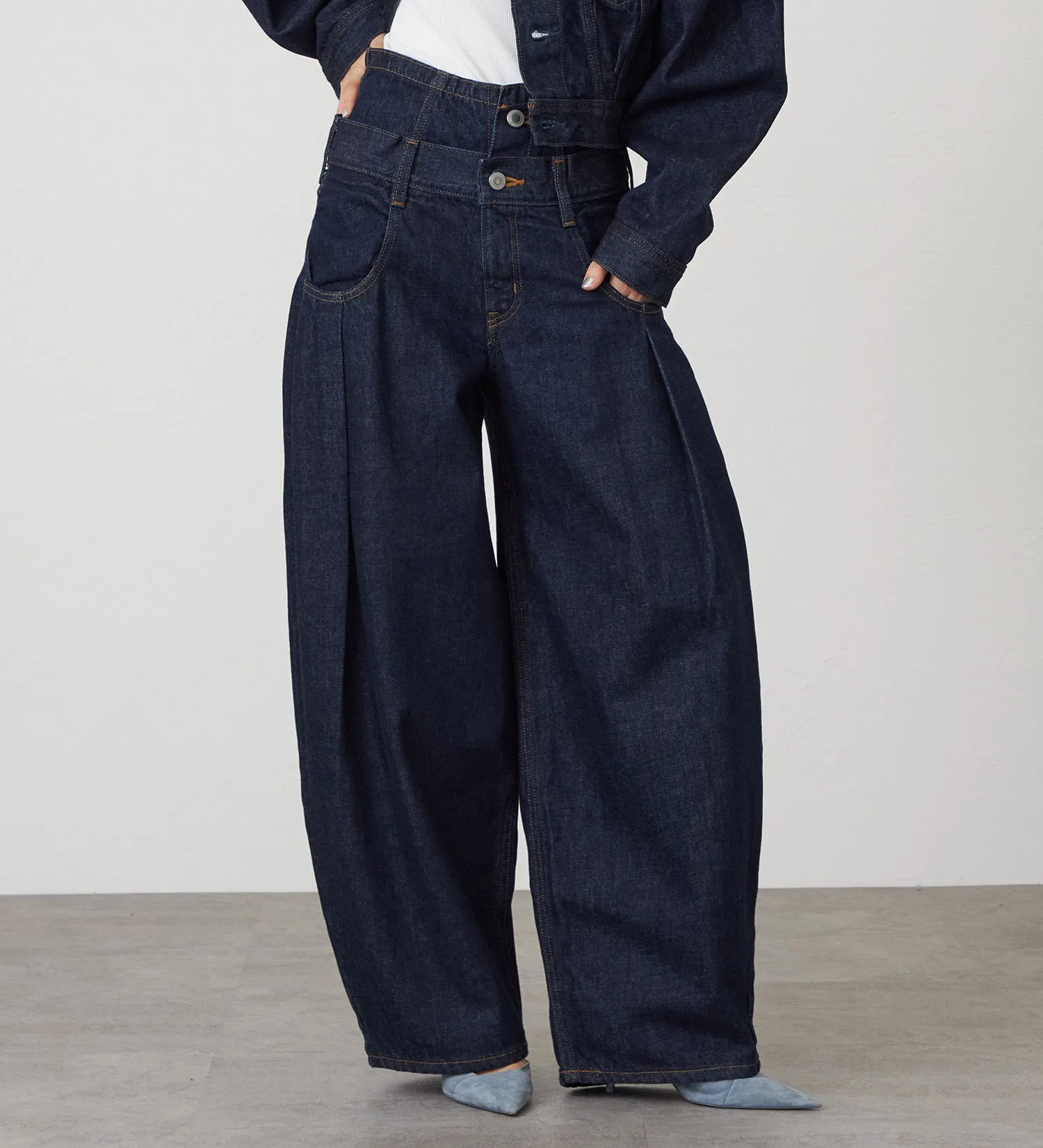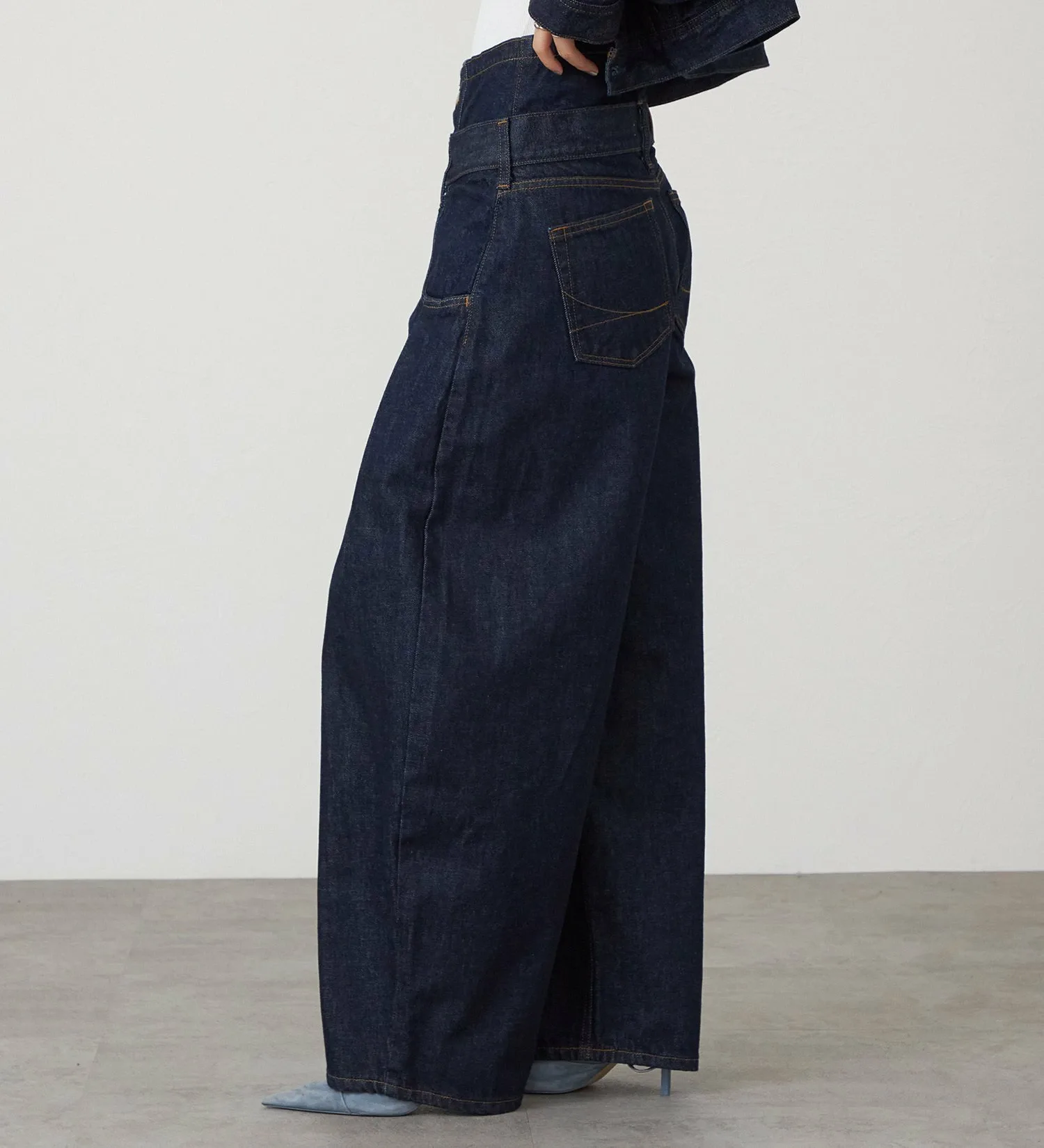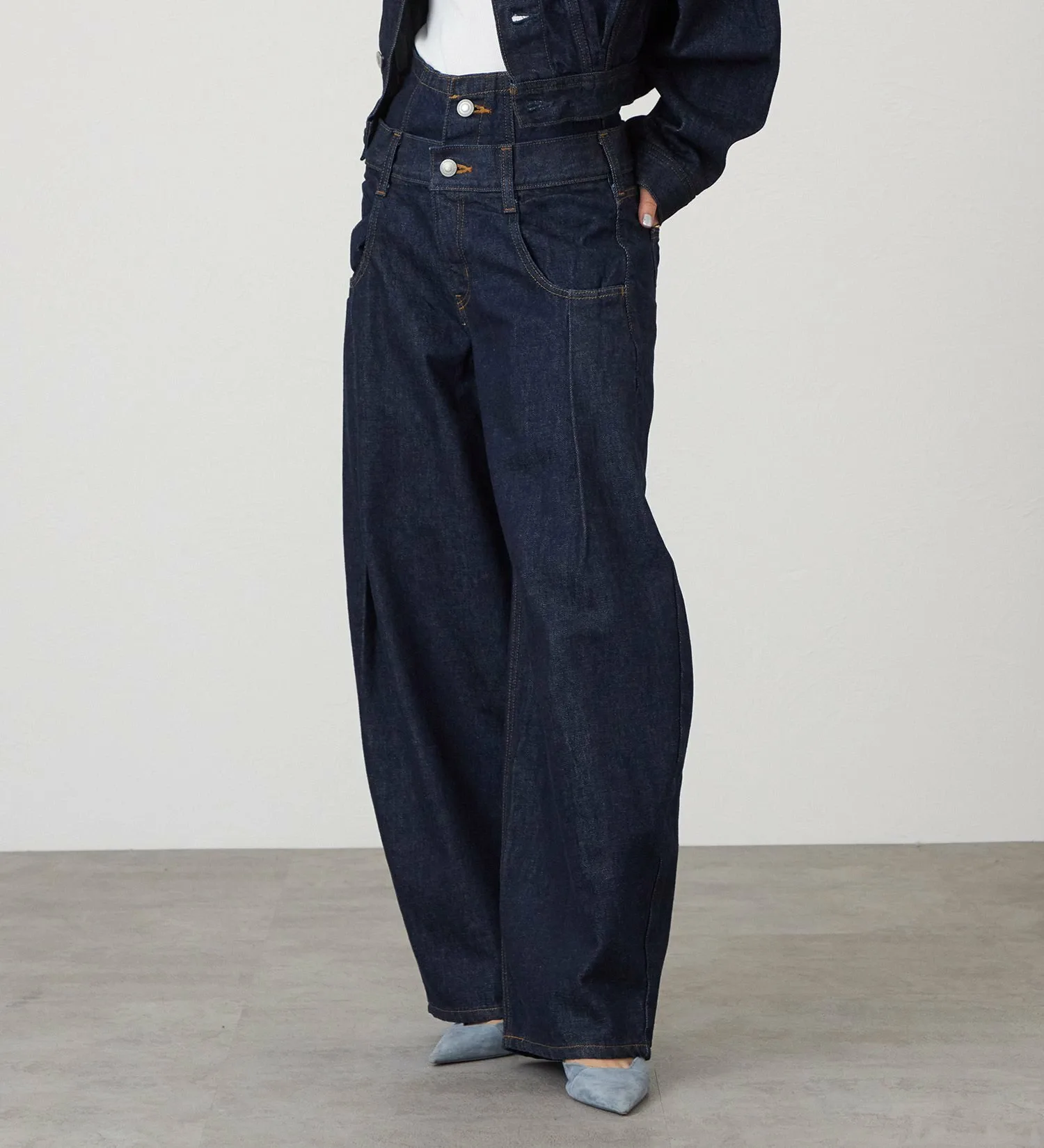 Эти широкие брюки с двойным поясом вдохновлены стилем свободных широких брюк с легким налетом нижнего белья. Первый пояс облегает талию, а второй свободно сидит, создавая чистый, расслабленный силуэт.