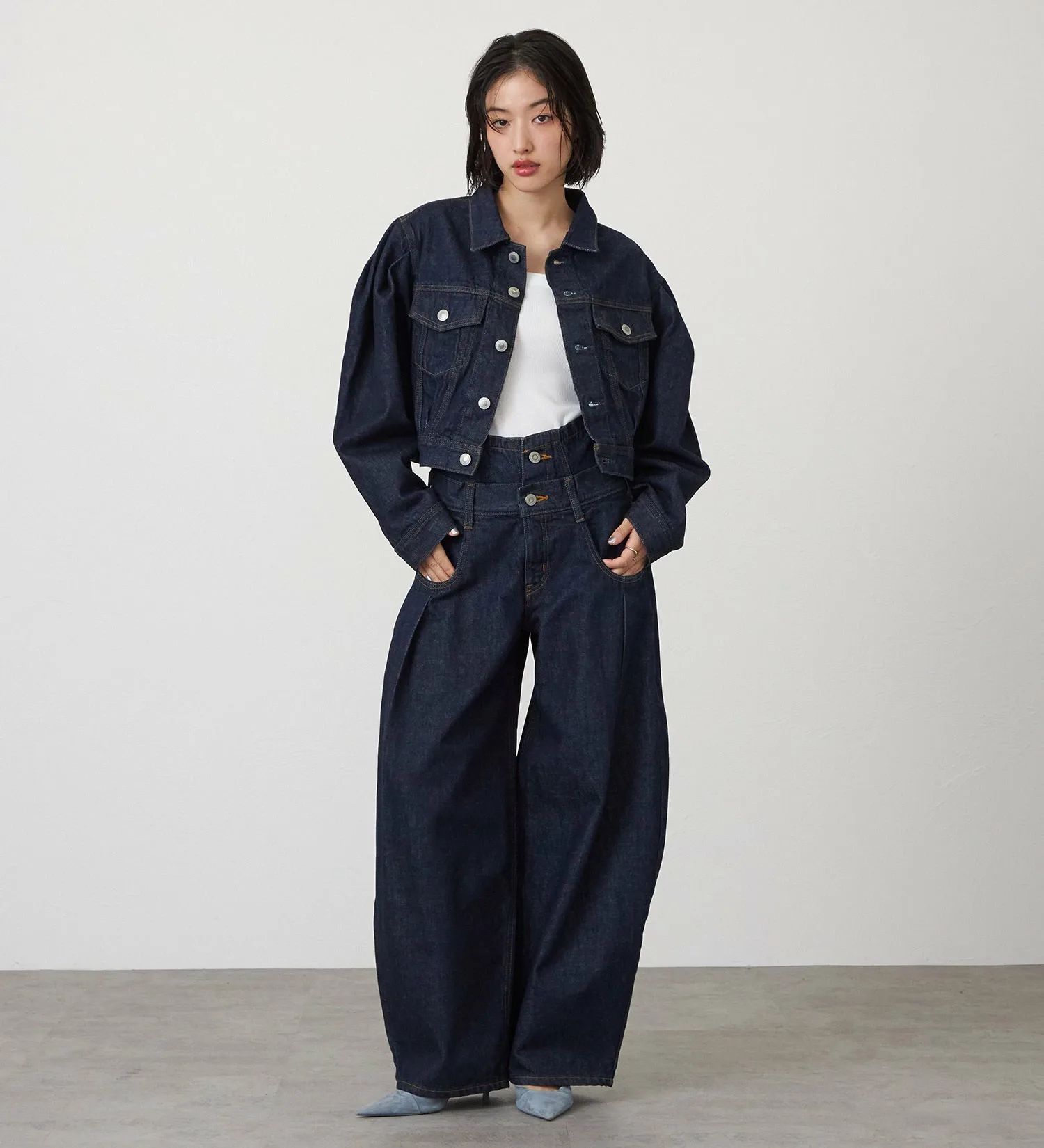 Эти джинсы выглядят эффектно, поэтому хорошо сочетаются с простыми топами. Мы рекомендуем сочетать эти объемные широкие брюки с короткими или облегающими топами.