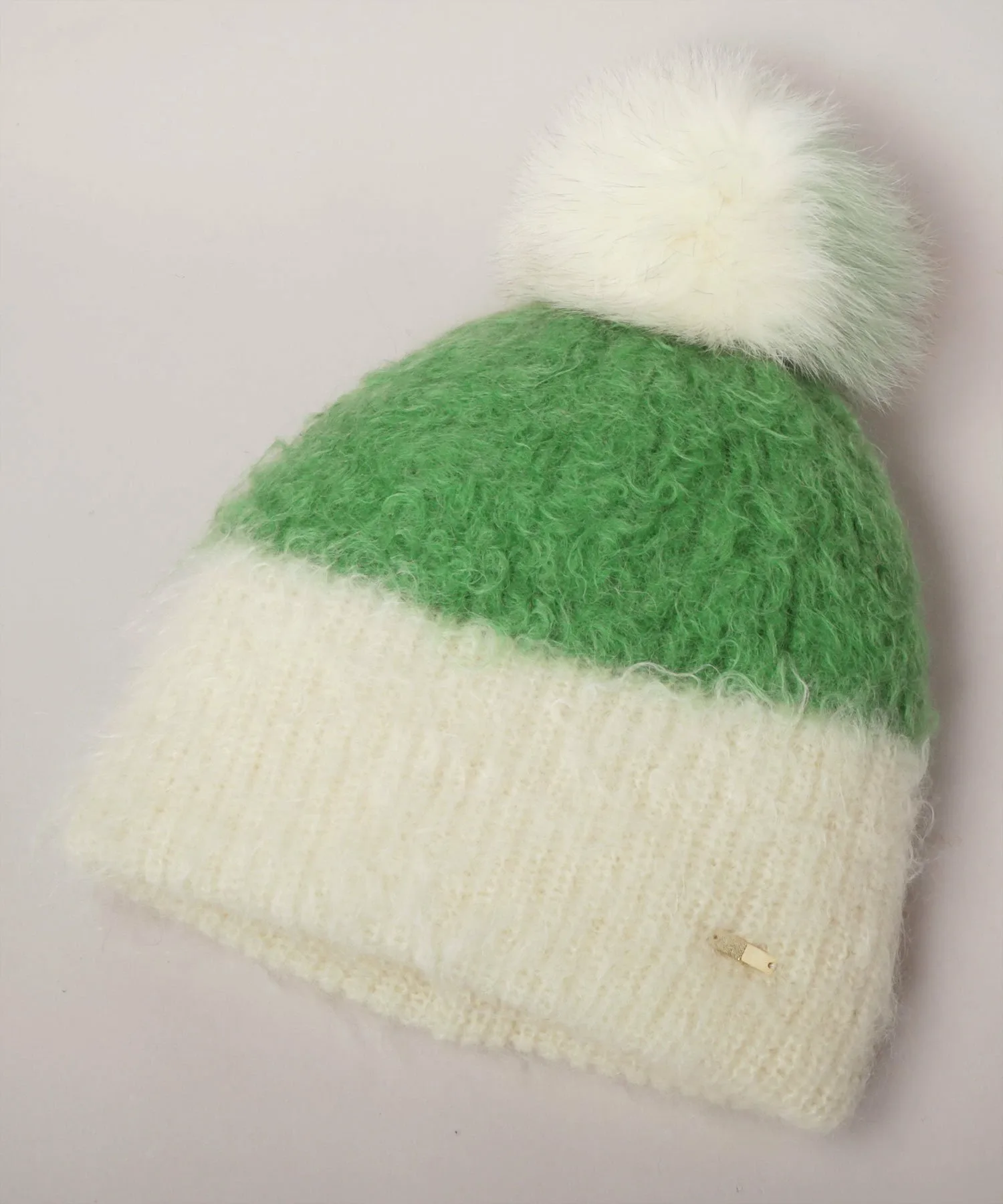 Большой помпон из лисьего меха производит сильное впечатление. Двухцветная основа создает элегантный вид.