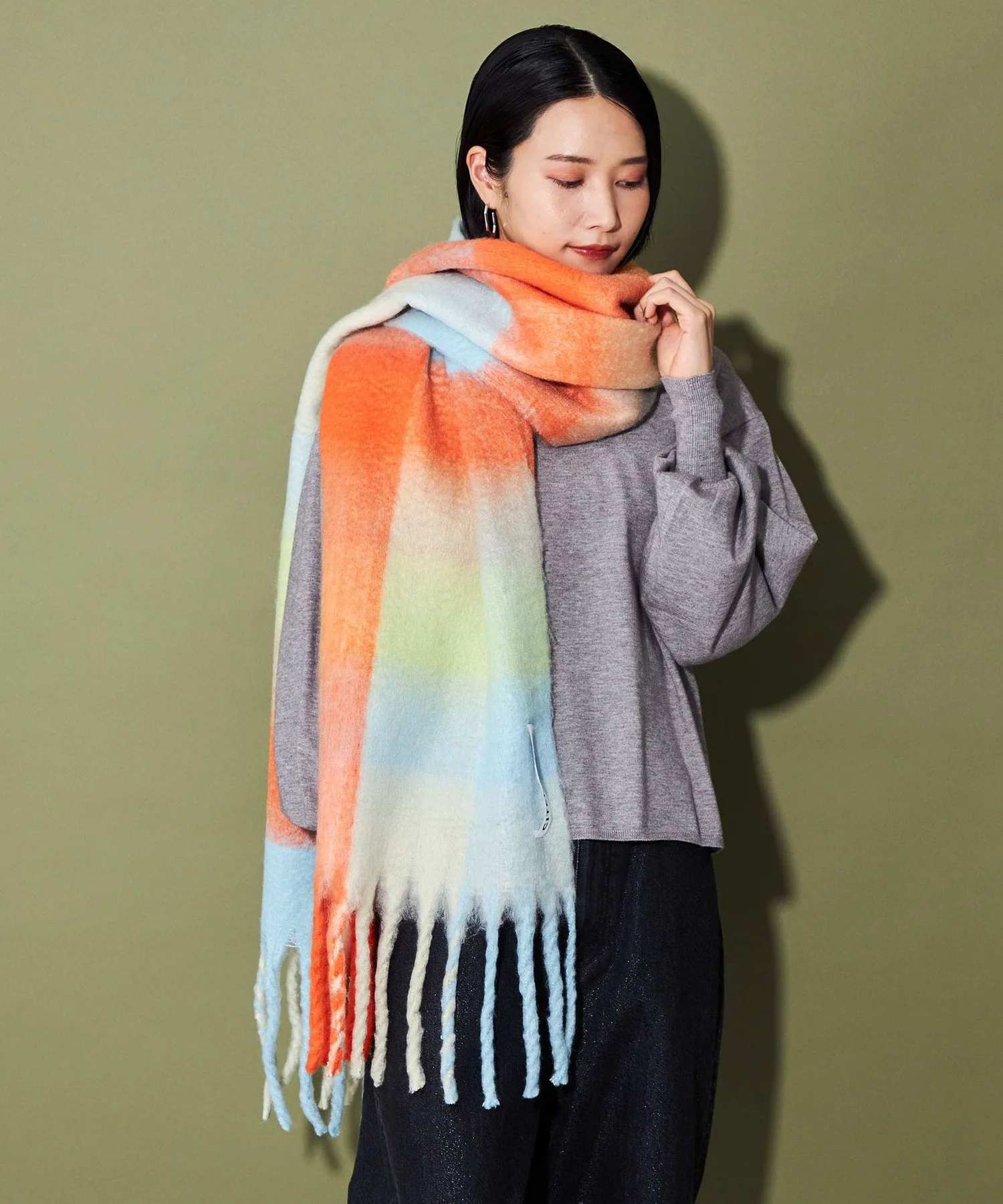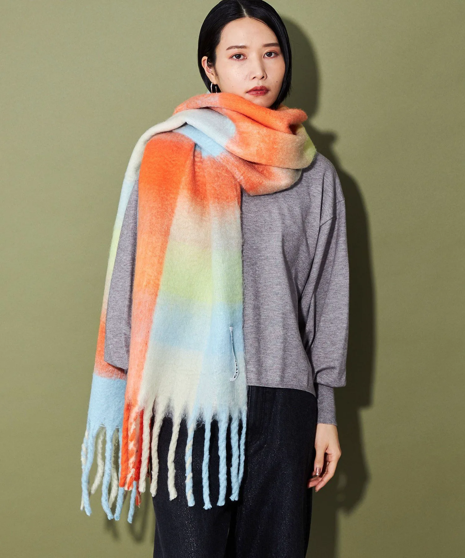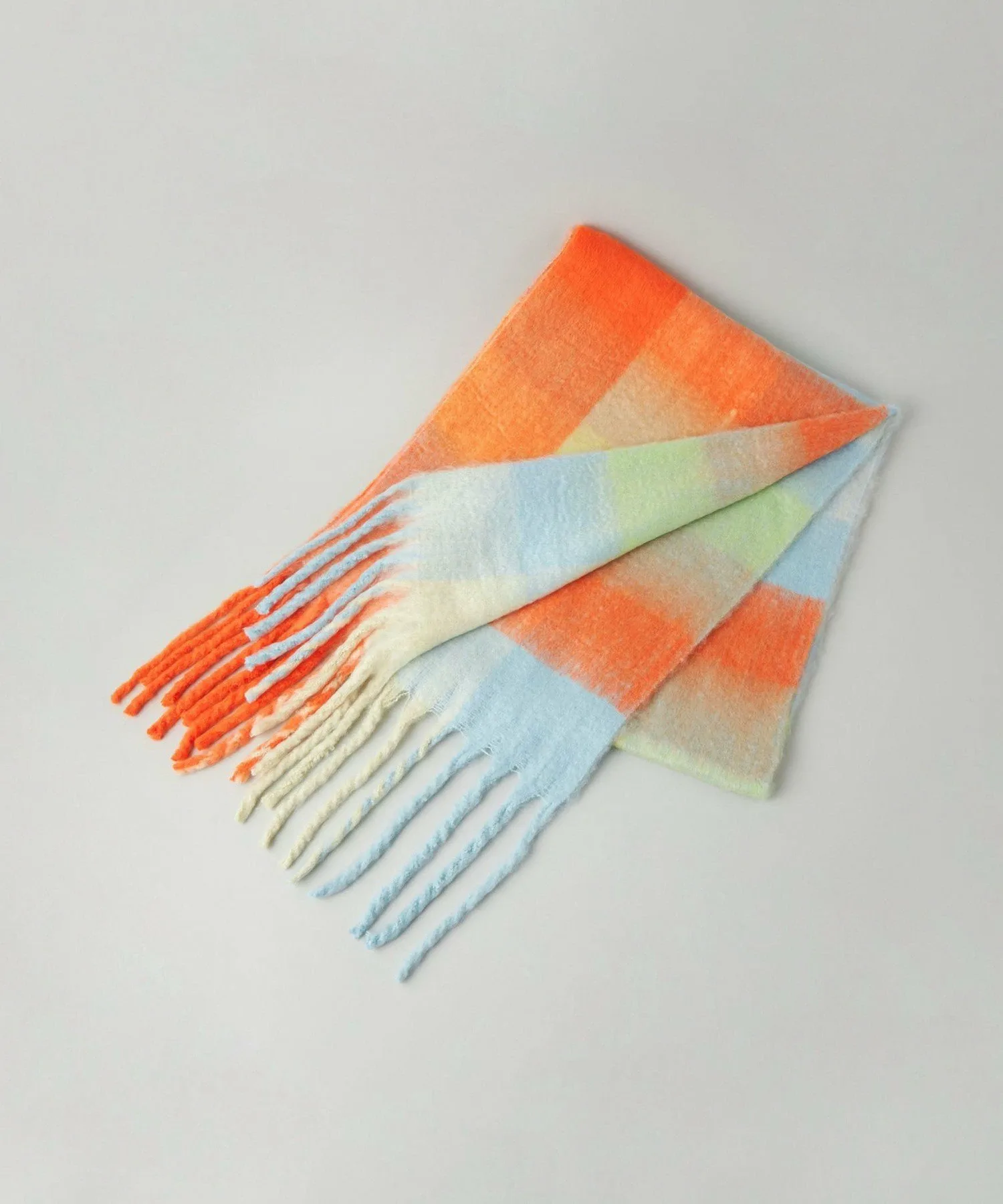 Оригинальный красочный клетчатый шарф с эффектной крупной бахромой.