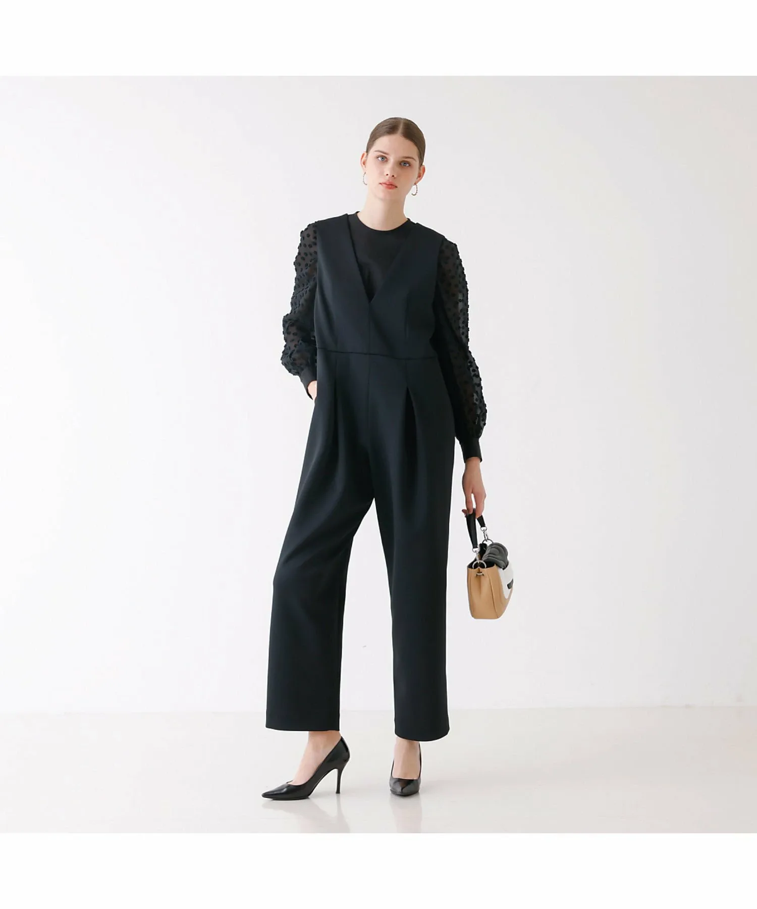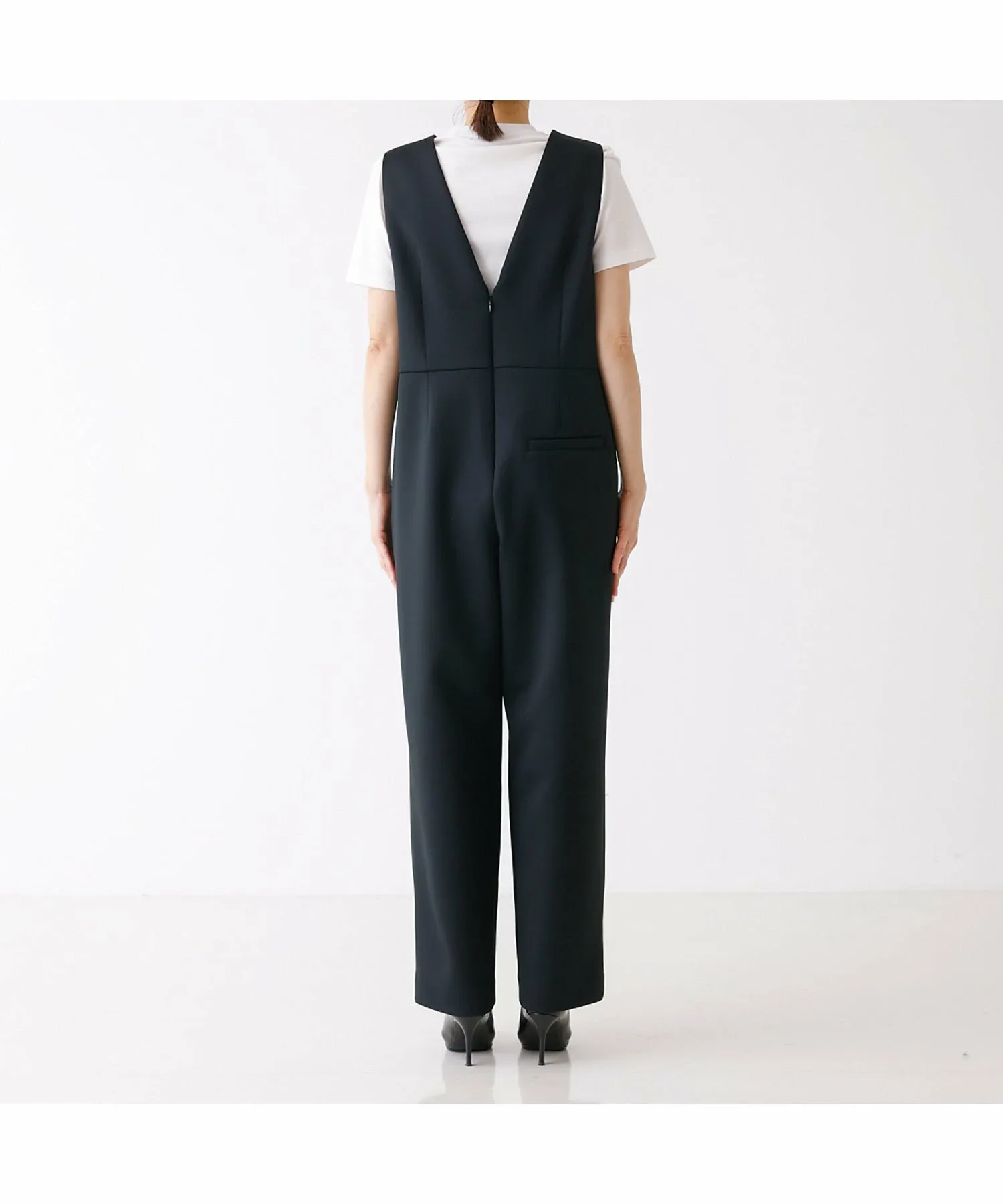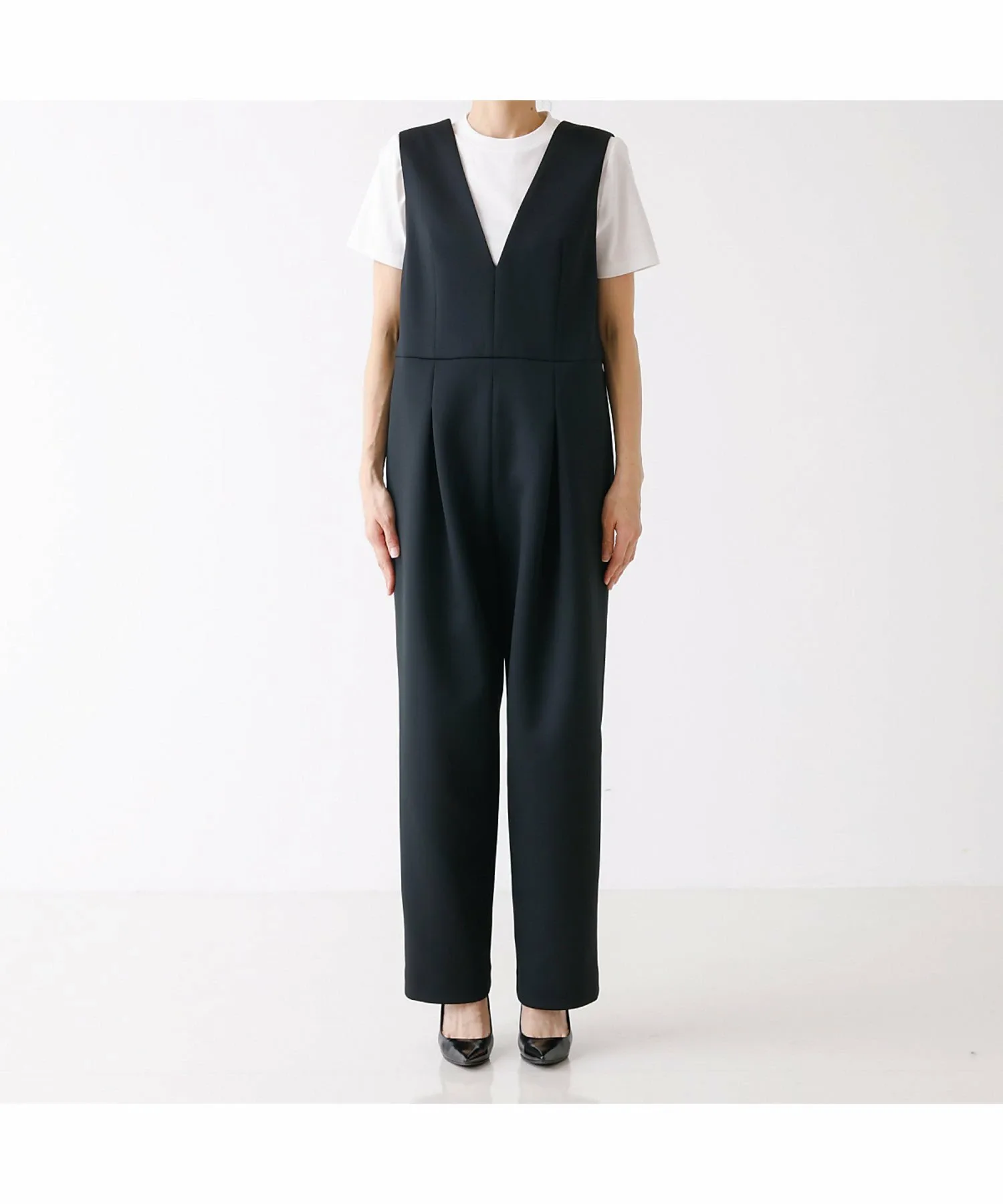 Комбинезон имеет глубокий V-образный вырез, пояс, который облегает верхнюю часть для создания обтекаемого силуэта, а брюки имеют одну складку для чуть более широкого силуэта.
