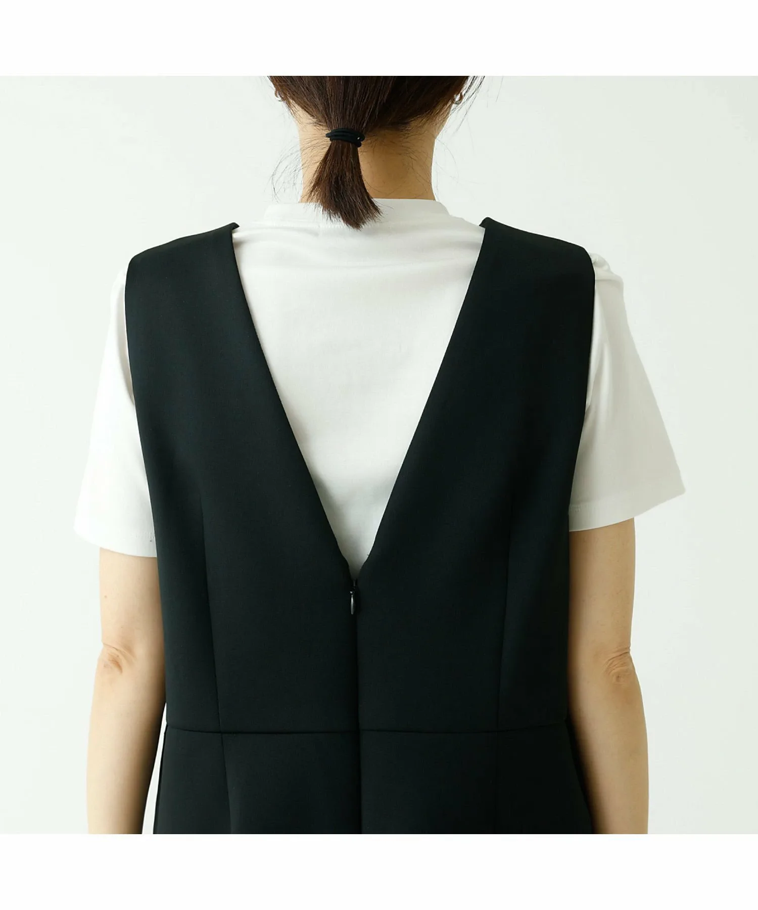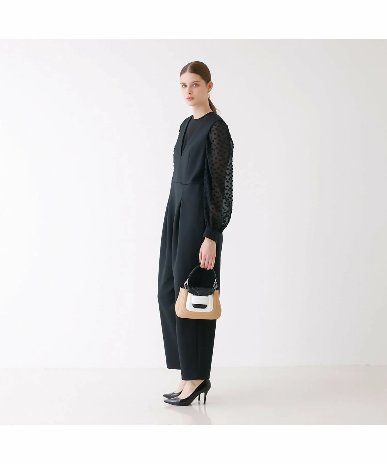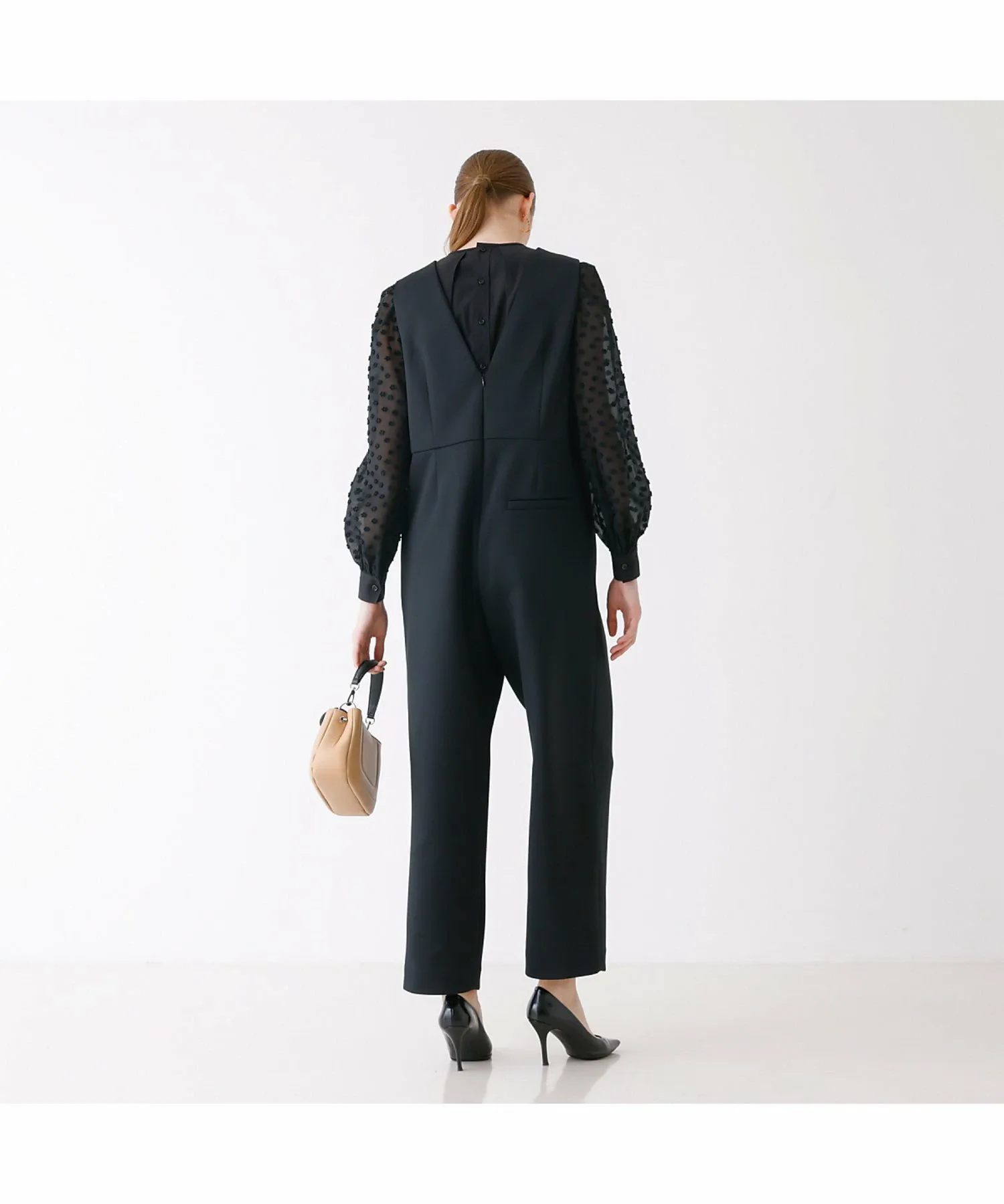 Комбинезон имеет глубокий V-образный вырез, пояс, который облегает верхнюю часть для создания обтекаемого силуэта, а брюки имеют одну складку для чуть более широкого силуэта.