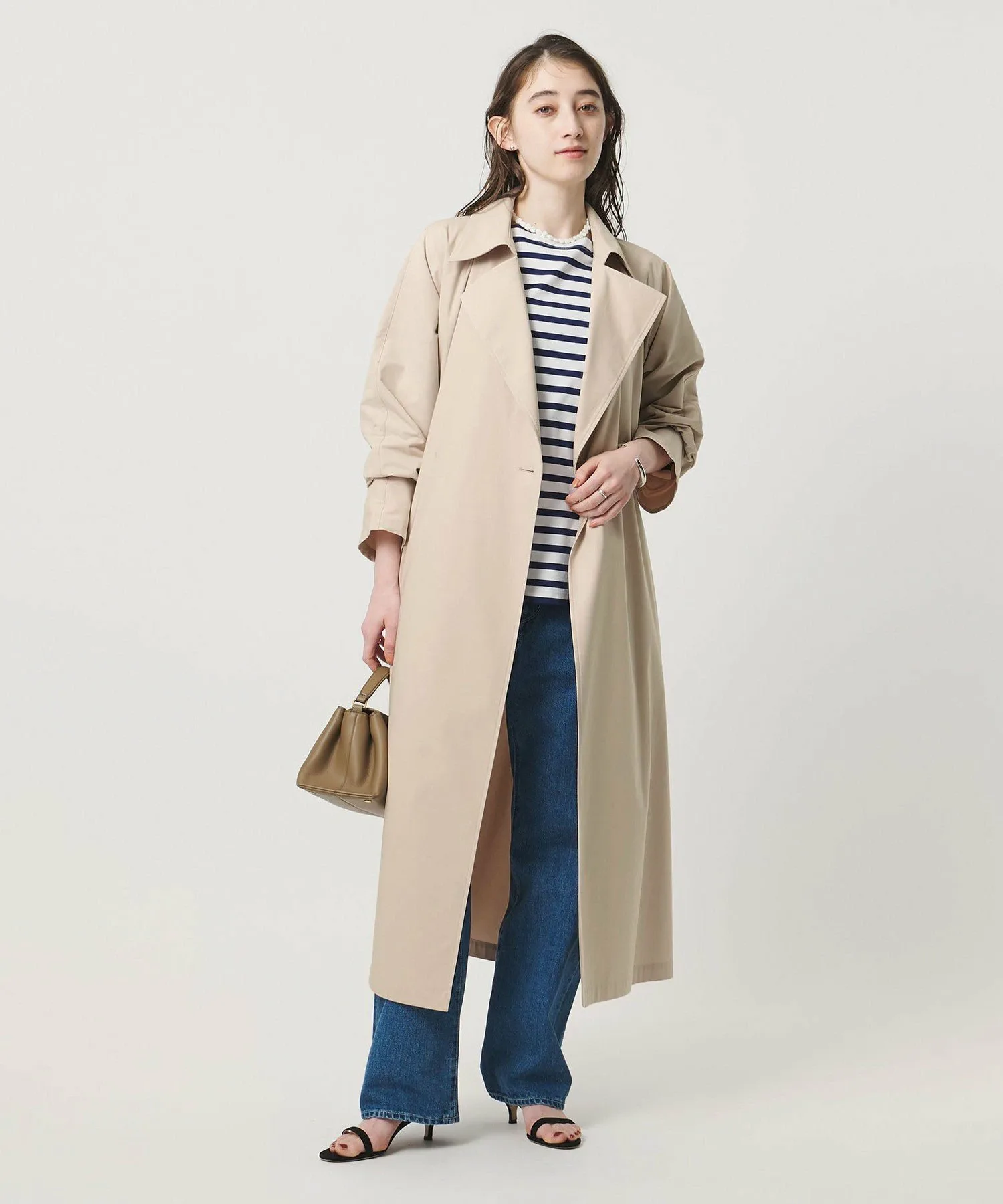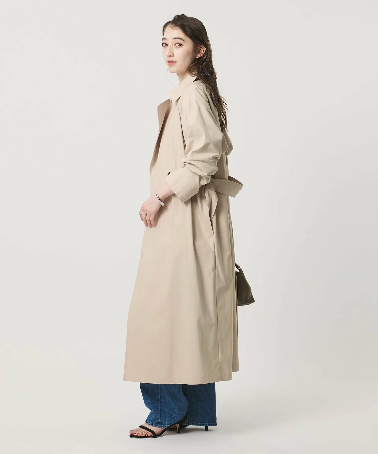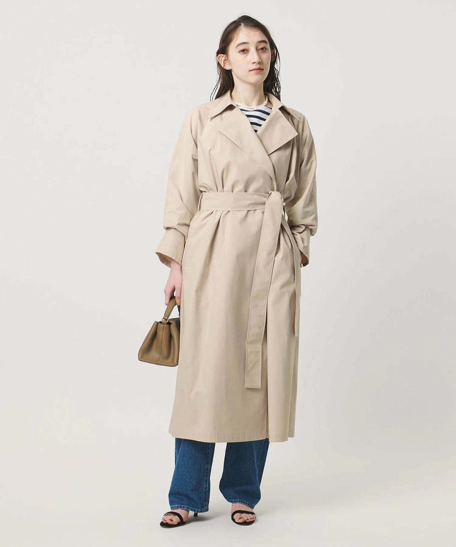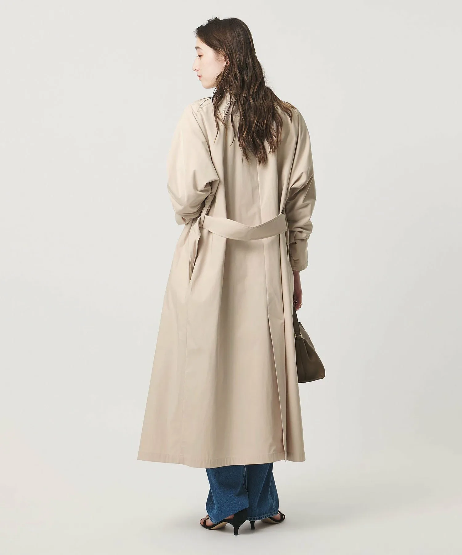 Этот тренч имеет рукава, соединенные с корпусом, что создает женственный образ.