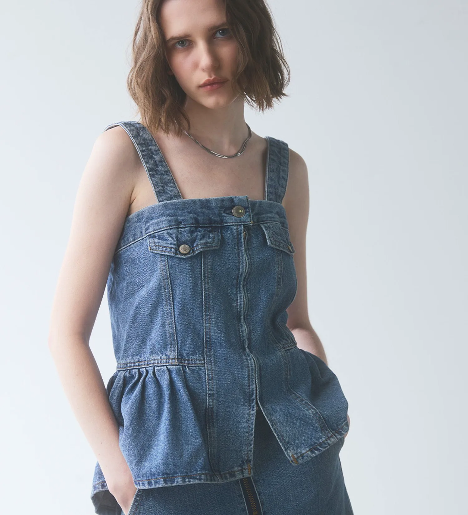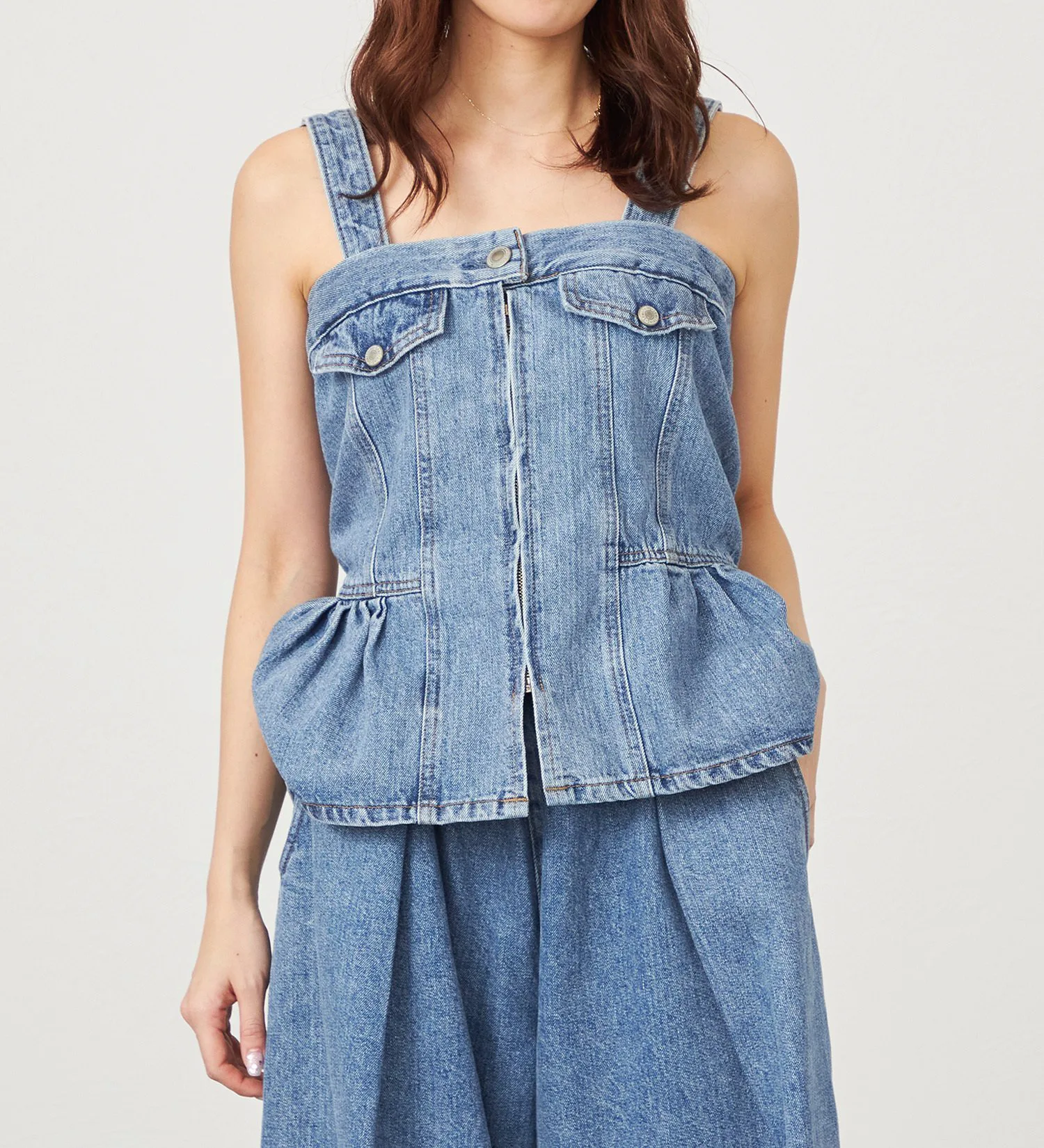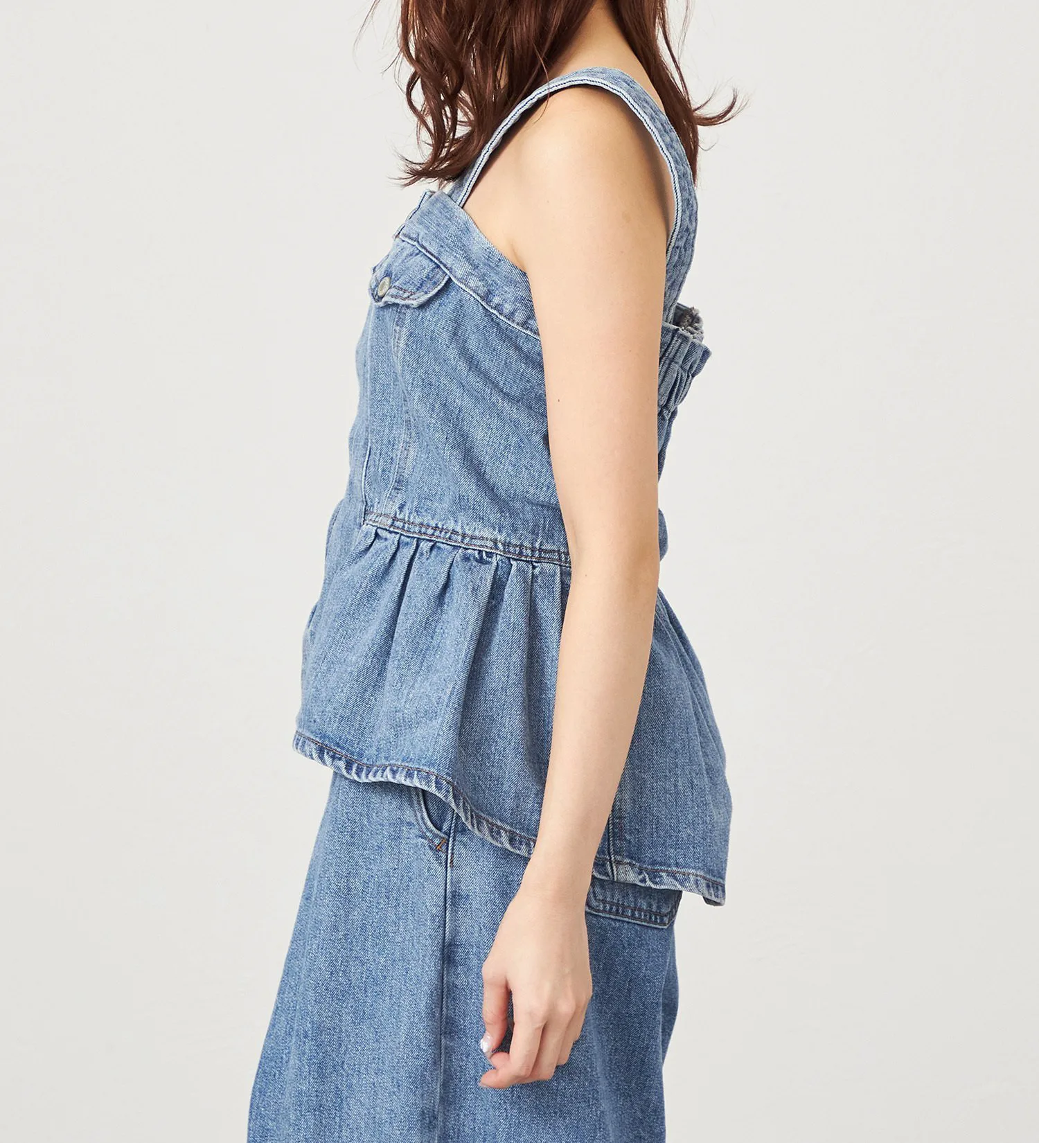 Женственное бюстье с присборенной талией и баской. Немного удлиненная длина подчеркивает талию, создавая эффект стройности. Разная длина спереди и сзади также добавляет привлекательности силуэту сбоку. Съемные бретели позволяют носить его и как топ без бретелей. Это изделие можно носить разными способами, в зависимости от настроения и наряда.