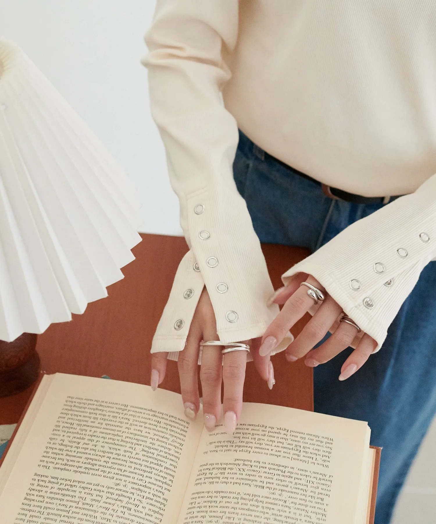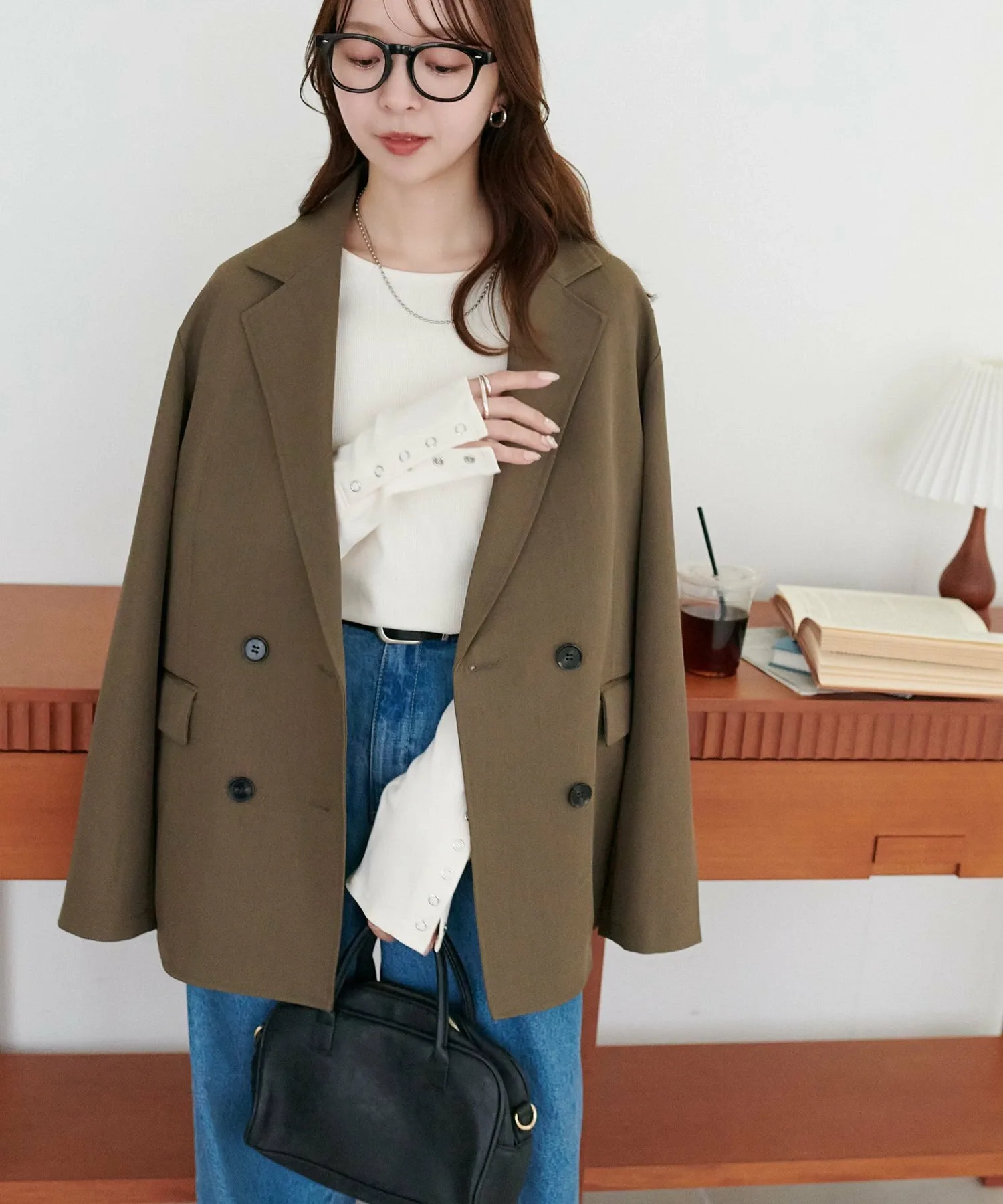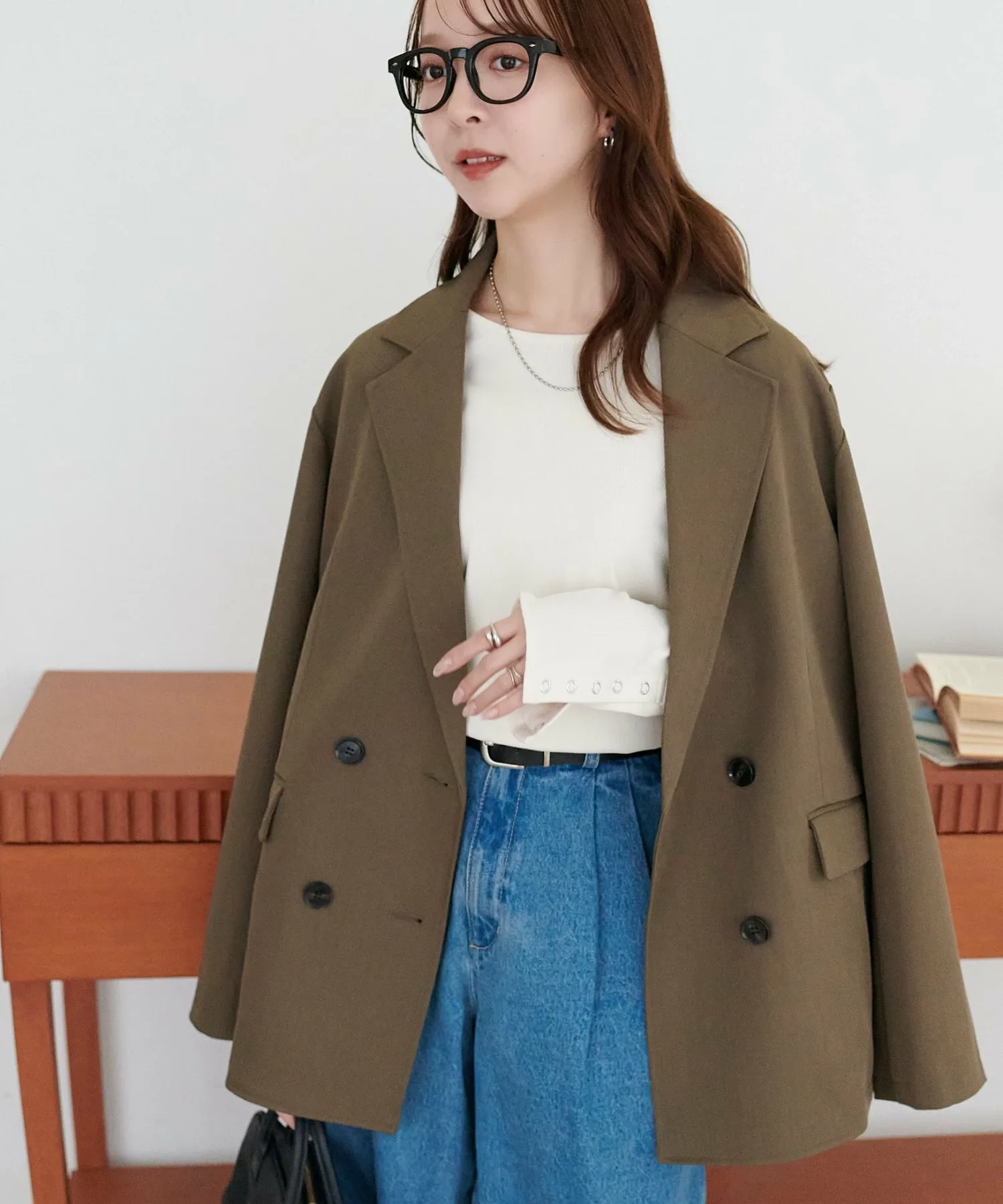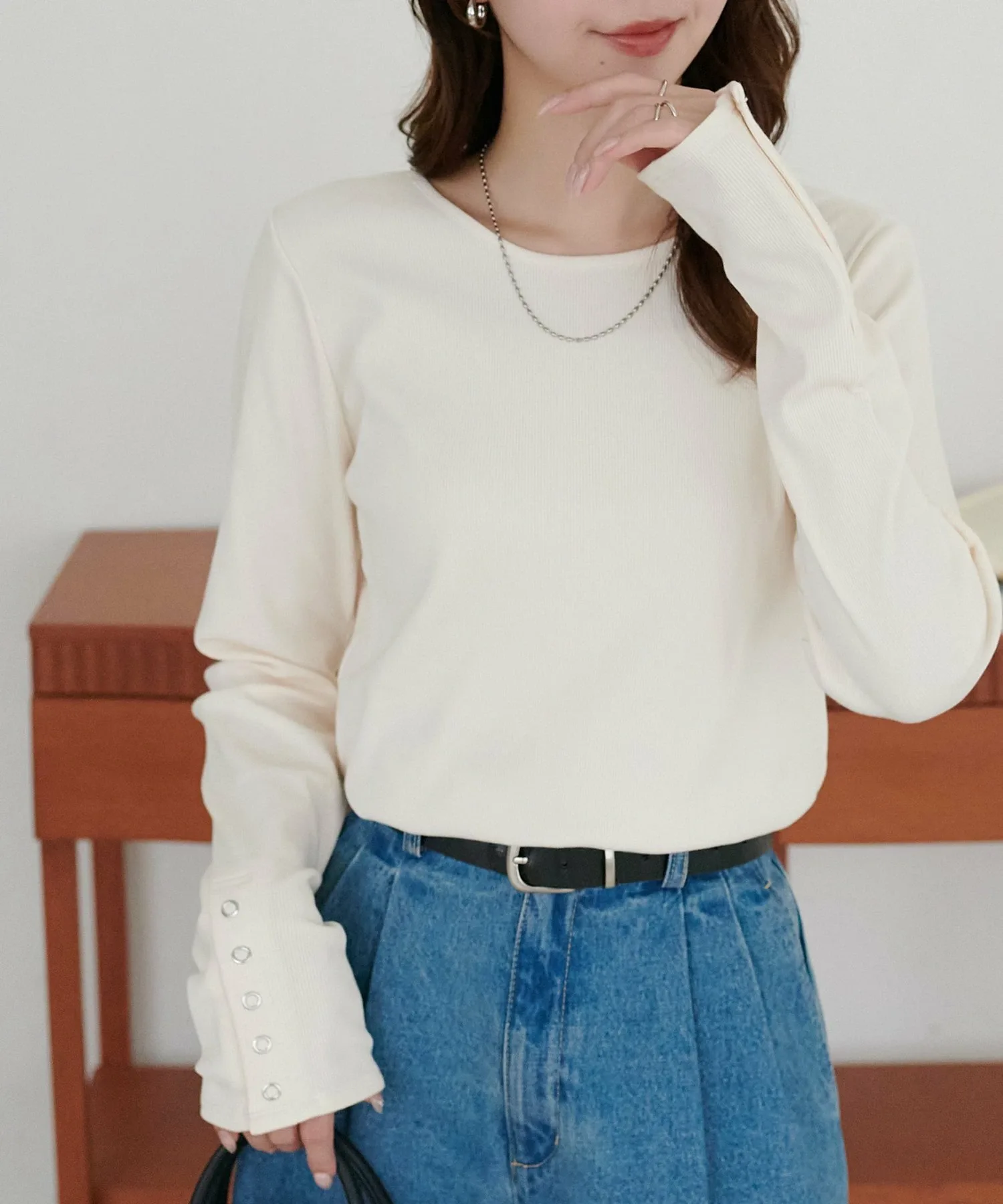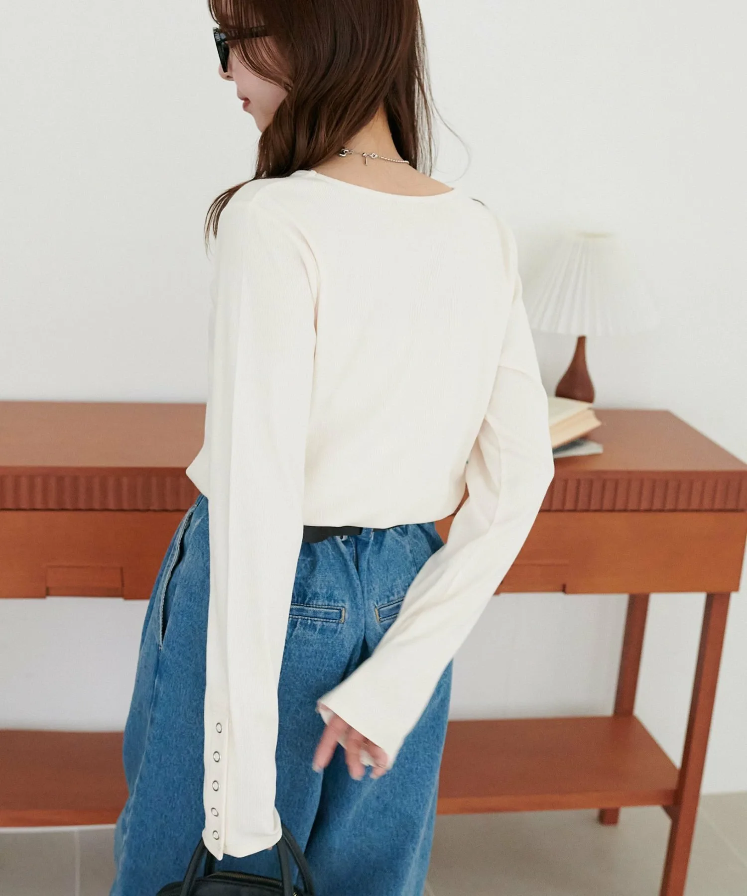 Сотрудник: рост 155 см: Вырез горловины не слишком узкий, поэтому он не выглядит тяжелым даже при многослойной одежде! Если оставить 2-3 пуговицы на манжетах расстегнутыми, ваши руки будут сидеть свободнее! Их будет легче увидеть, если вы носите браслеты♪
