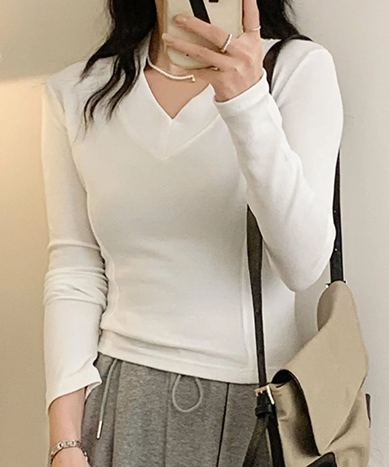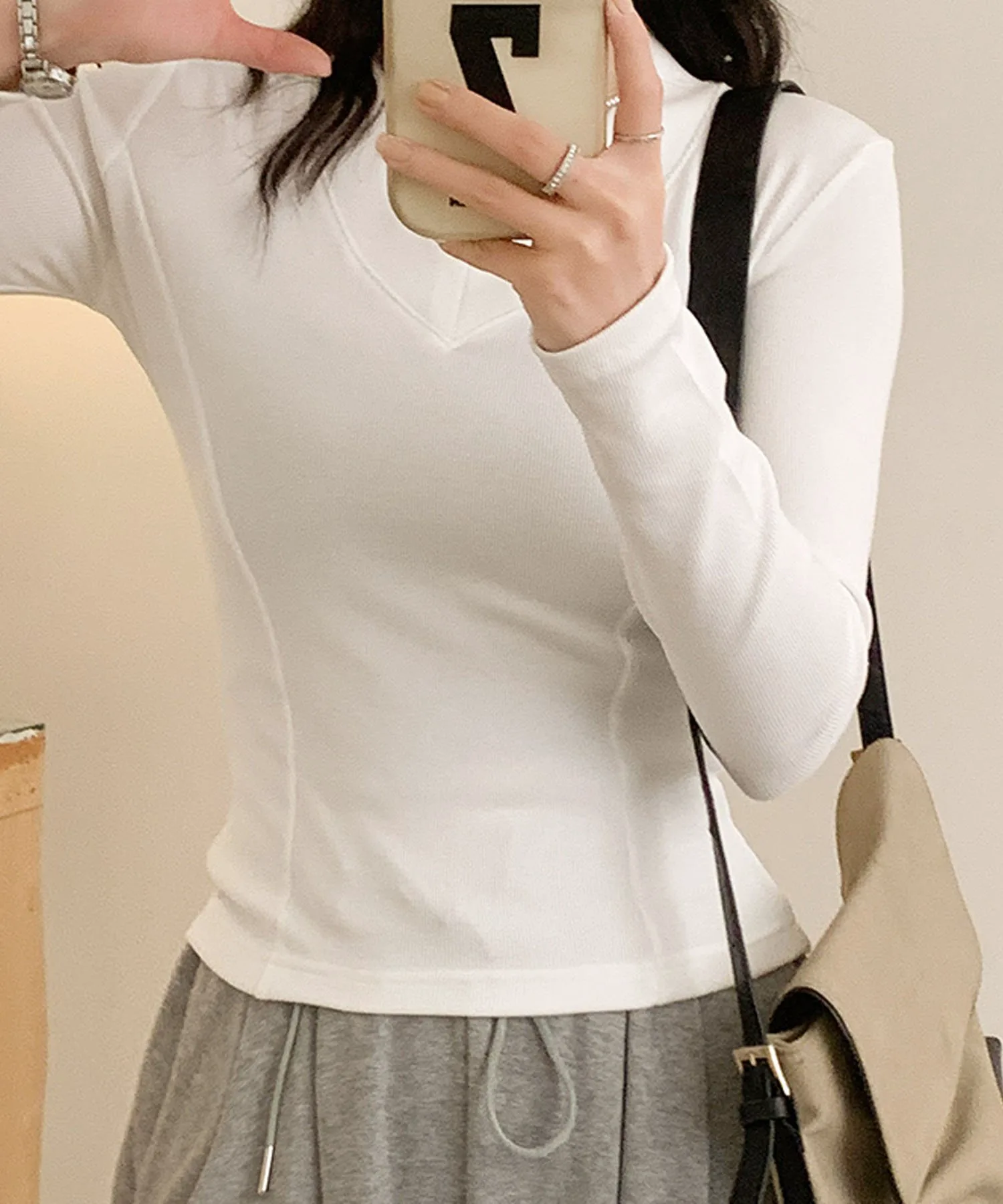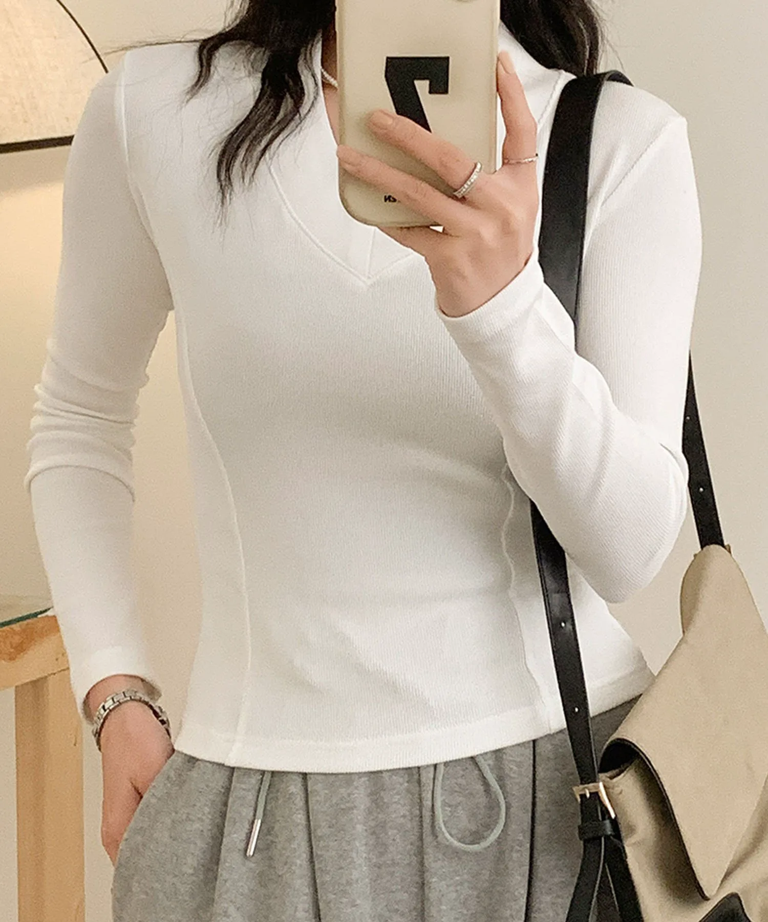 V-образный вырез, выгодно подчеркивающий декольте. Благодаря облегающему силуэту его можно носить как самостоятельно, так и в качестве нижнего слоя под куртку. Базовый вязаный топ, который можно носить как в повседневной жизни, так и в офисе.